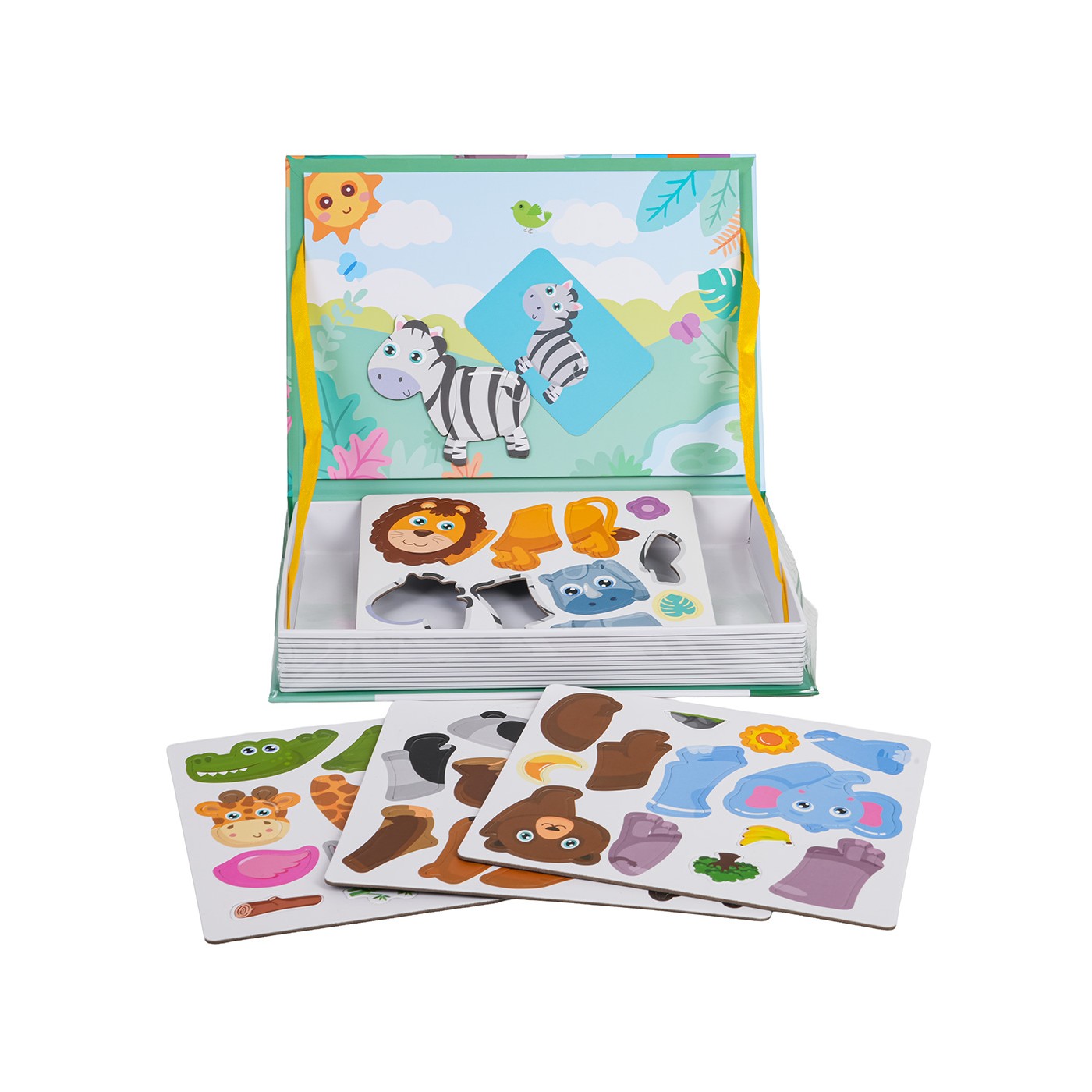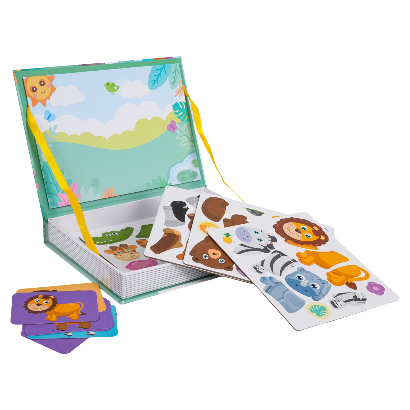Magnetická knižka a vzdelávacie puzzle pre deti od troch rokov. Táto knižka je ideálnym darčekom. Prostredníctvom hry sa deti učia o zvieratách a precvičujú si svoje zručnosti. Po otvorení knižky si deti môžu pripevniť dieliky puzzle so zvieratami na vrch a vytvoriť si tak svoj vlastný jedinečný príbeh, zakaždým iný. Sada obsahuje magnetické dieliky a šesť obojstranných kartičiek.