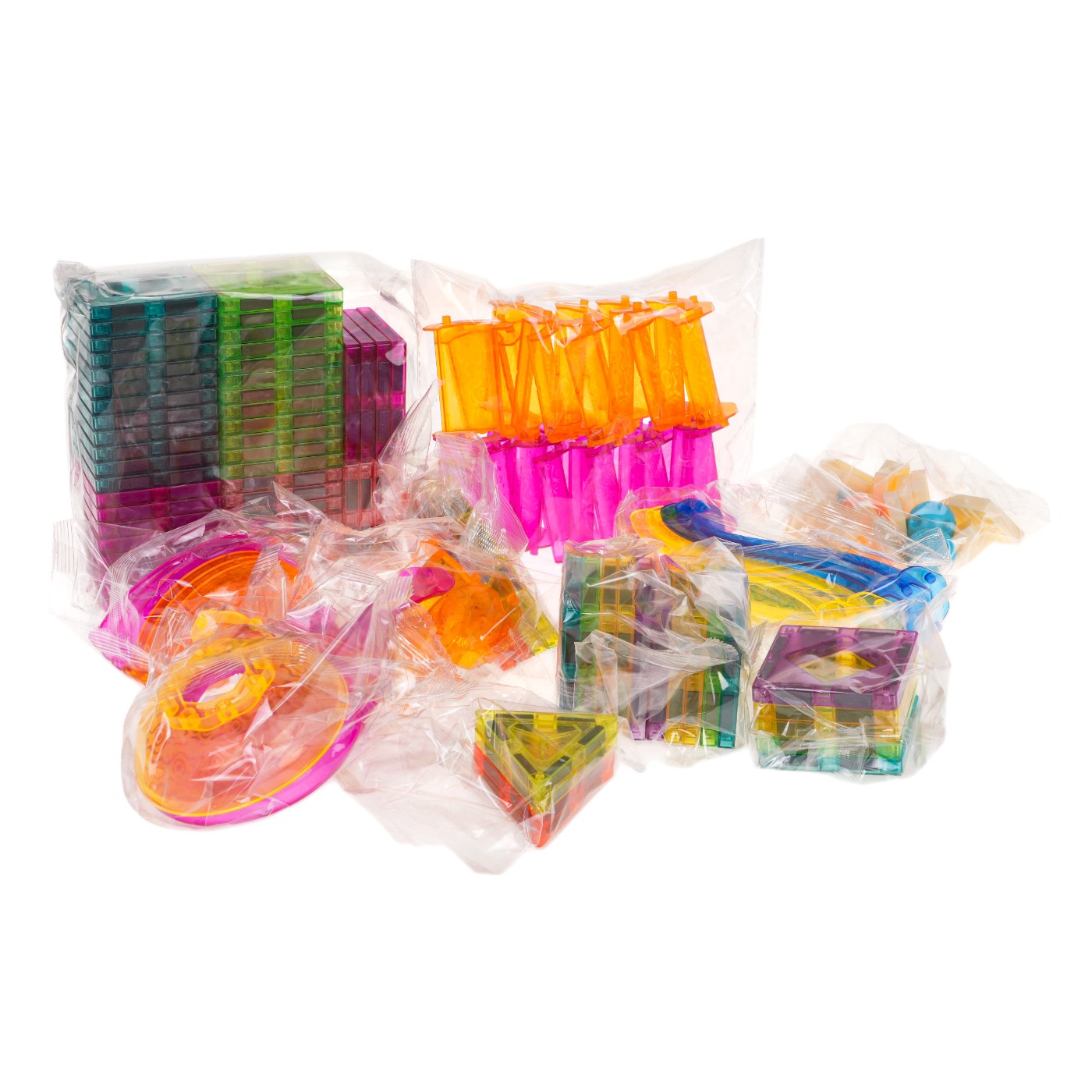 - 139 konštrukčných prvkov vrátane 71 magnetických prvkov, - 6 loptičiek, - dekoratívne nálepky, - obrázkový návod na montáž pre rôzne modely, - krabica s triedičom tvarov a držadlami na prenášanie, ktorá je zároveň obalom. |
