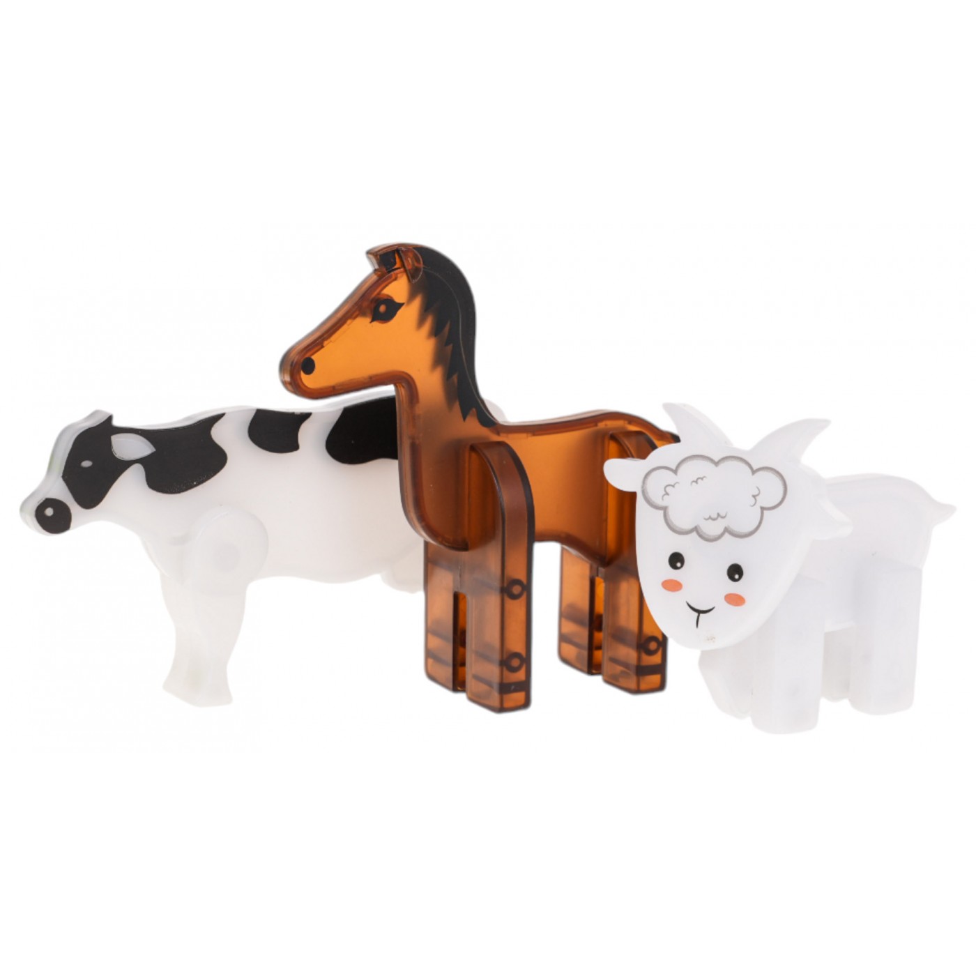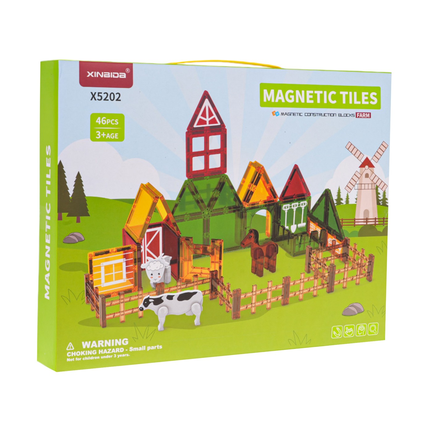 - štvorcové magnetické bloky cca 7,5 cm x 7,5 cm, - trojuholníkové magnetické bloky cca 9,8 cm x 7,2 cm x 7,2 cm a 7 cm x 7 cm x 7 cm, - obdĺžnikové magnetické bloky cca 7,5 cm x 3,8 cm, - tvárnice s plotom cca 9 cm x 4,5 cm, - figúrka kravičky cca 9,5 cm x 5,3 cm x 1,5 cm, - figúrka koňa cca 8,5 cm x 8,5 cm x 3 cm, - figúrka baránka cca 6 cm x 5,5 cm x 4,5 cm, - balenie cca 38,5 cm x 30 cm x 6 cm. |