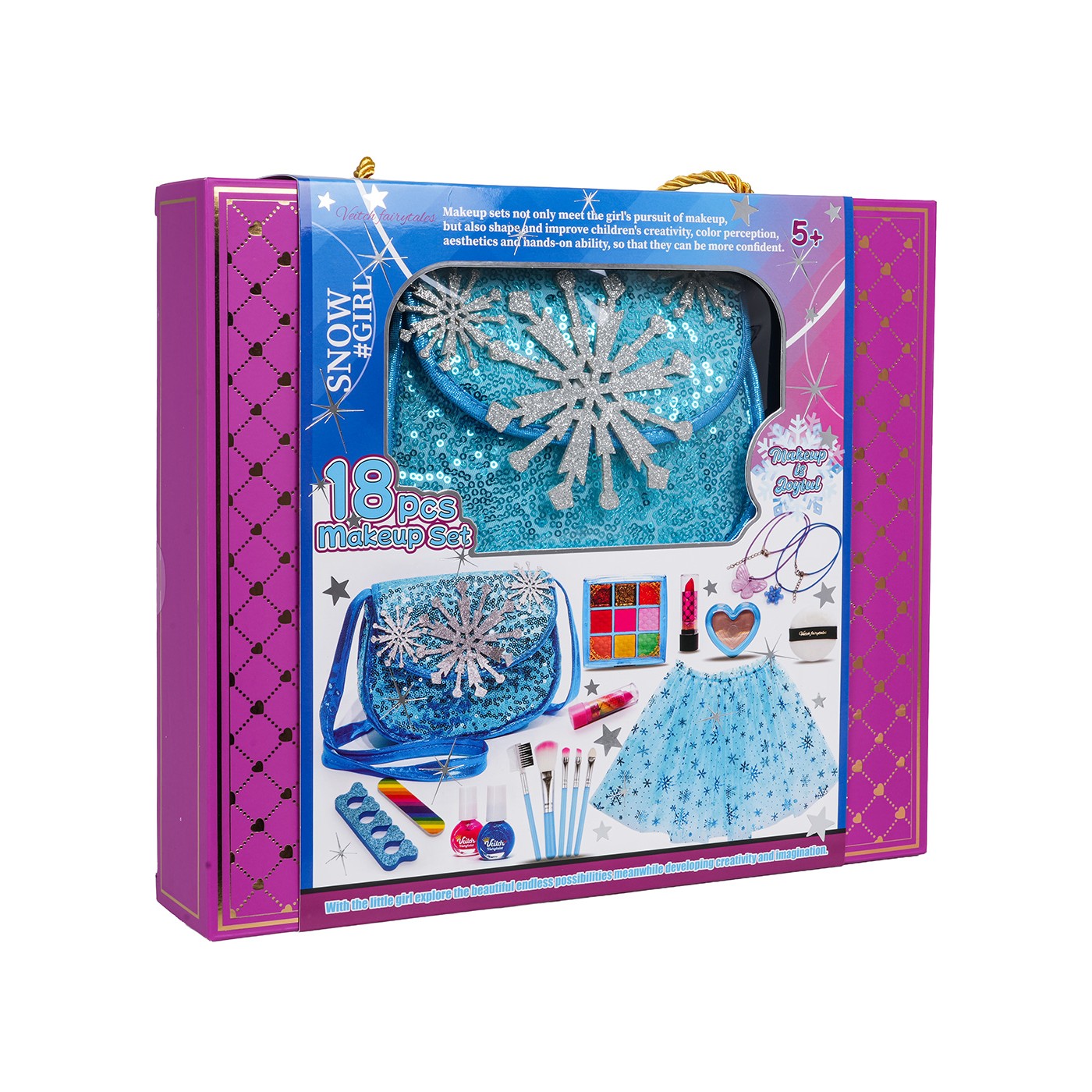 Bohato vybavená, farebná sada pre malé princezné, ktorá obsahuje sukňu, kabelku a make-up pre deti od piatich rokov. Sada pozostáva z 18 dielikov, vyrobených s dôrazom na detail a z najkvalitnejších materiálov. Kozmetika je bezpečná pre deti, hypoalergénna a ľahko sa odstraňuje. Sada obsahuje paletu očných tieňov, laky na nechty, rúže, štetce na make-up, krásnu kabelku, náhrdelníky a tylovú sukňu.