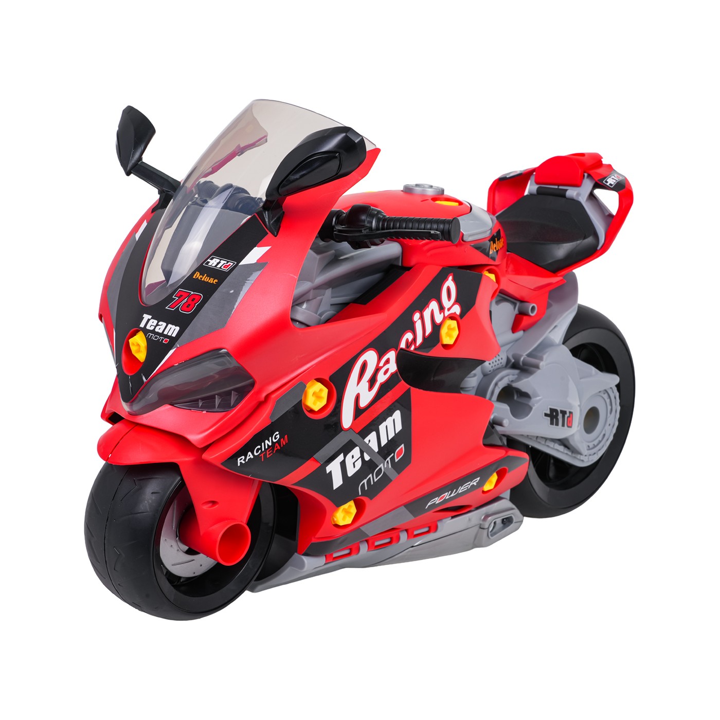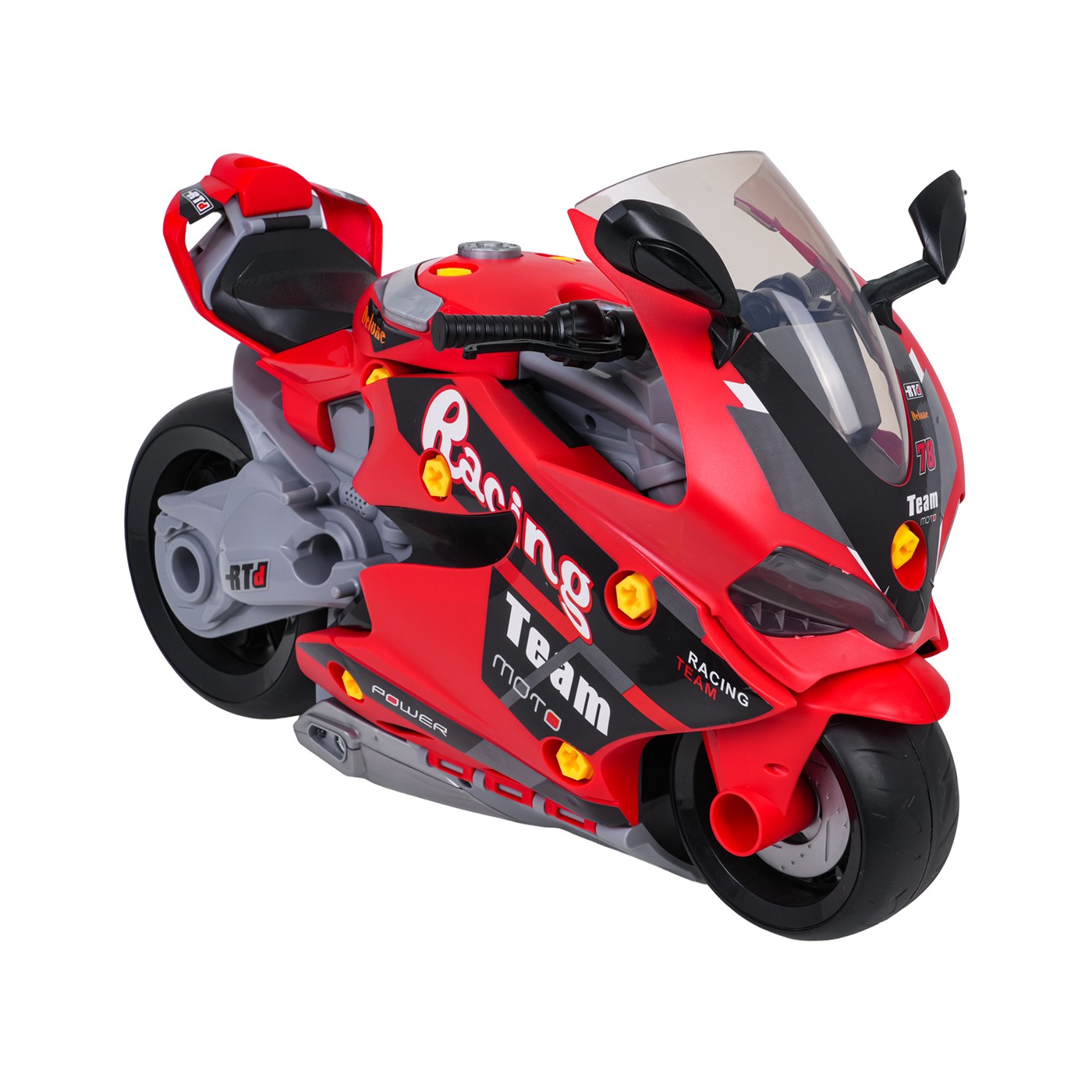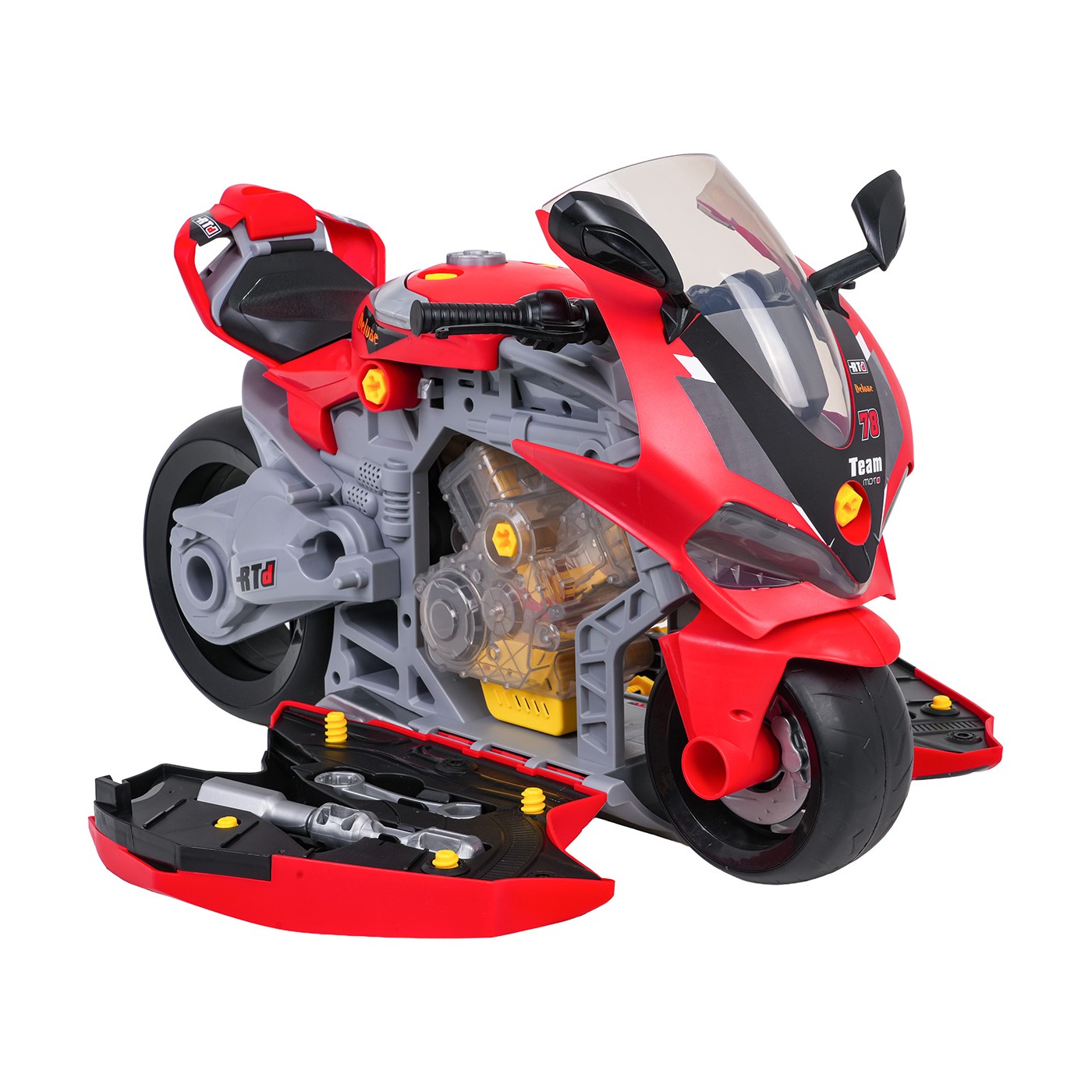 Hračka 2 v 1, veľká motorka s dielňou pre deti od troch rokov. Motocykel má rozsvietené svetlomety a zadné svetlá. Vydáva zvuky štartovania, jazdy a zrýchľovania a z výfuku (po naplnení nádrže vodou) vychádza dym. Boky motorky sa dajú otvoriť a odhaliť motor s osvetlenými piestami a bežiacimi zvukmi. Motor sa dá z motorky vybrať a preskúmať jeho mechanizmus. Sada obsahuje sadu nástrojov na demontáž a dávkovač vody. Motocykel má praktickú rukoväť na prenášanie a je vyrobený z kvalitného plastu, vďaka čomu má krásny vzhľad. Hračka je napájaná 3 x AAA 1,5V batériami (nie sú súčasťou balenia), zatiaľ čo motor je napájaný 3 x AG13 batériami (súčasťou balenia). Vlastnosti: - pre deti od troch rokov, - vyrobené z najkvalitnejších materiálov, - pohodlná rukoväť na prenášanie, - veľké, pohyblivé kolesá, - otváracie boky motora s motorom a náradím vo vnútri, - svetelné efekty: svetlomety, zadné svetlá pri výpuste dymu, motor, - zvukové efekty: štartovanie, jazda, zvuky zrýchľovania, zvuky motora, - dym vychádzajúci z výfukového potrubia, - perfektná darčeková sada pre deti zvedavé na svet. |