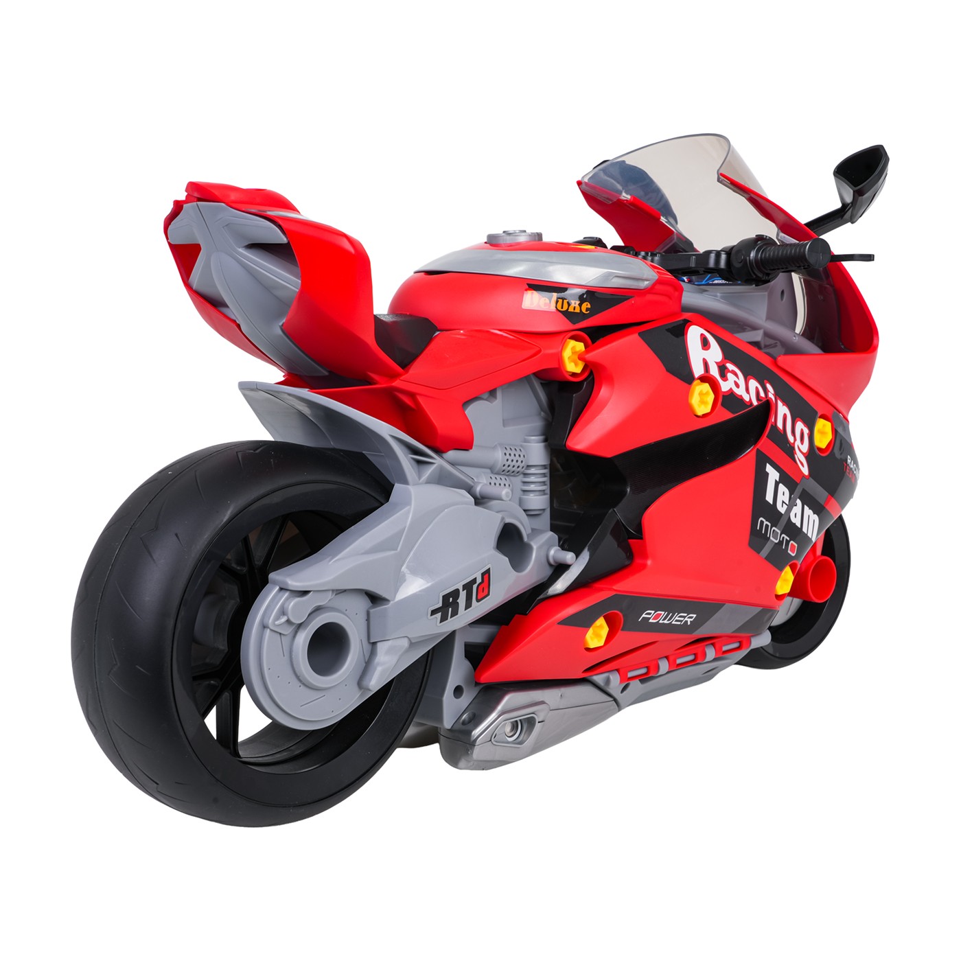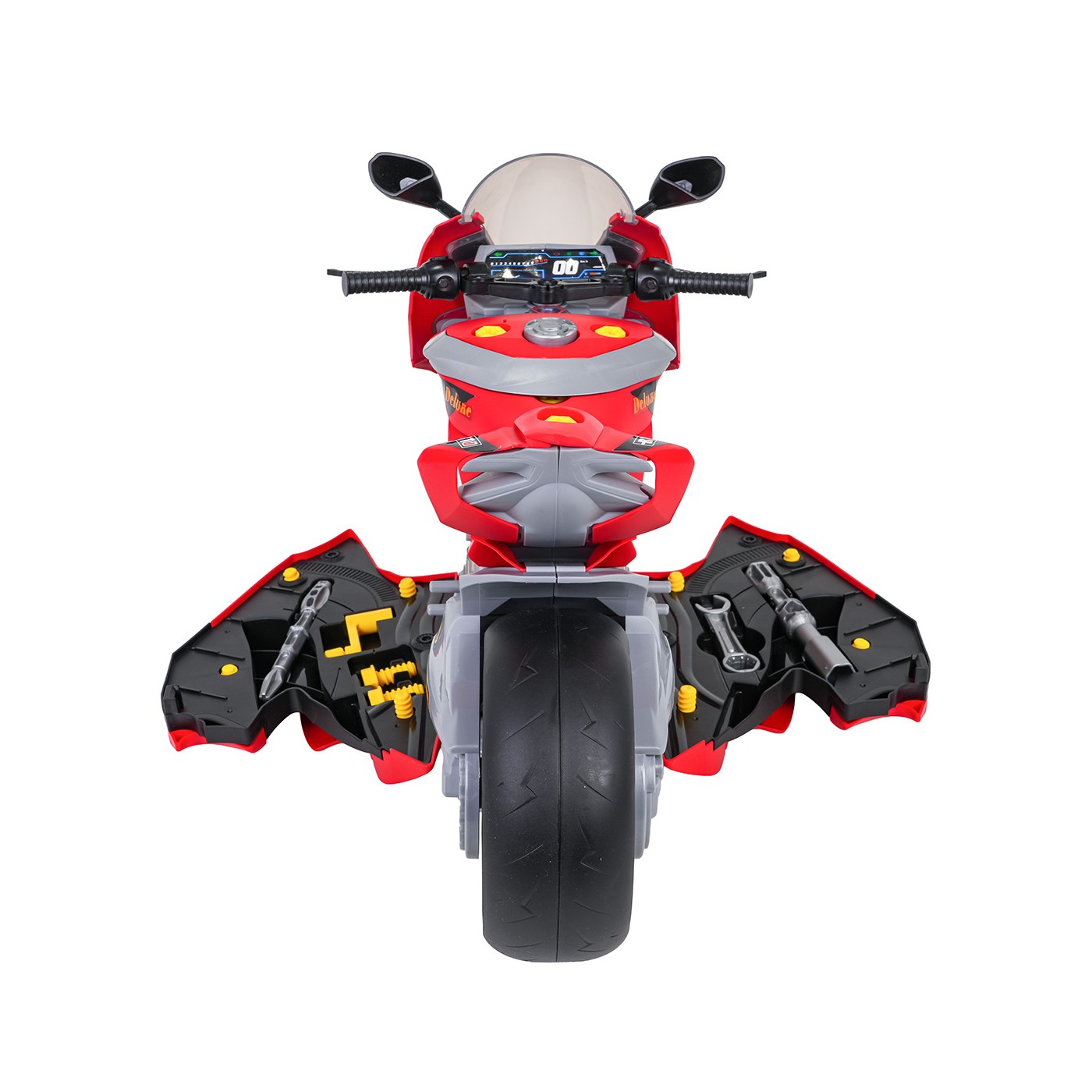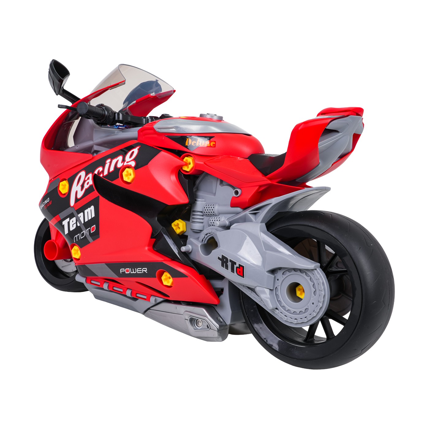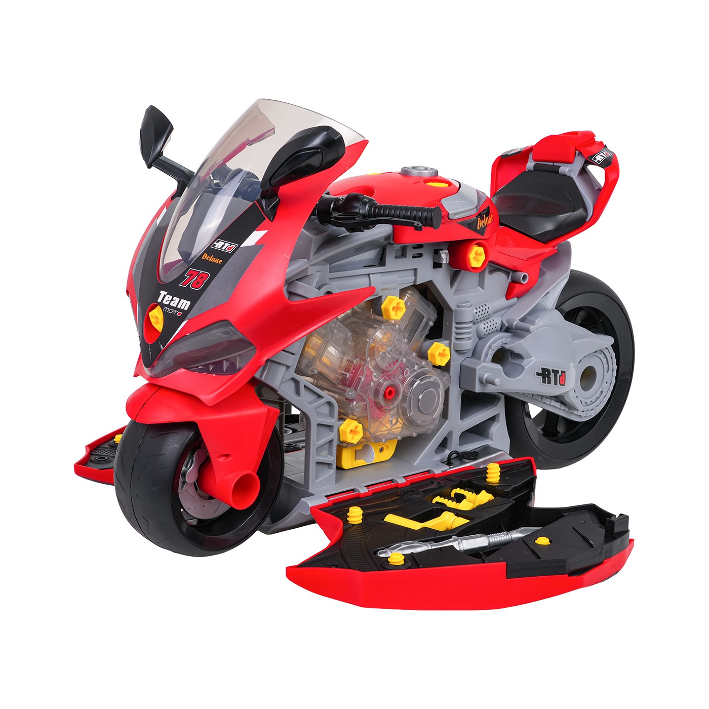 Hračka 2 v 1, veľká motorka s dielňou pre deti od troch rokov. Motocykel má rozsvietené svetlomety a zadné svetlá. Vydáva zvuky štartovania, jazdy a zrýchľovania a z výfuku (po naplnení nádrže vodou) vychádza dym. Boky motorky sa dajú otvoriť a odhaliť motor s osvetlenými piestami a bežiacimi zvukmi. Motor sa dá z motorky vybrať a preskúmať jeho mechanizmus. Sada obsahuje sadu nástrojov na demontáž a dávkovač vody. Motocykel má praktickú rukoväť na prenášanie a je vyrobený z kvalitného plastu, vďaka čomu má krásny vzhľad. Hračka je napájaná 3 x AAA 1,5V batériami (nie sú súčasťou balenia), zatiaľ čo motor je napájaný 3 x AG13 batériami (súčasťou balenia). Vlastnosti: - pre deti od troch rokov, - vyrobené z najkvalitnejších materiálov, - pohodlná rukoväť na prenášanie, - veľké, pohyblivé kolesá, - otváracie boky motora s motorom a náradím vo vnútri, - svetelné efekty: svetlomety, zadné svetlá pri výpuste dymu, motor, - zvukové efekty: štartovanie, jazda, zvuky zrýchľovania, zvuky motora, - dym vychádzajúci z výfukového potrubia, - perfektná darčeková sada pre deti zvedavé na svet. |
