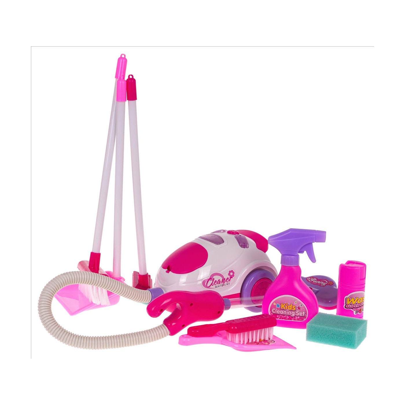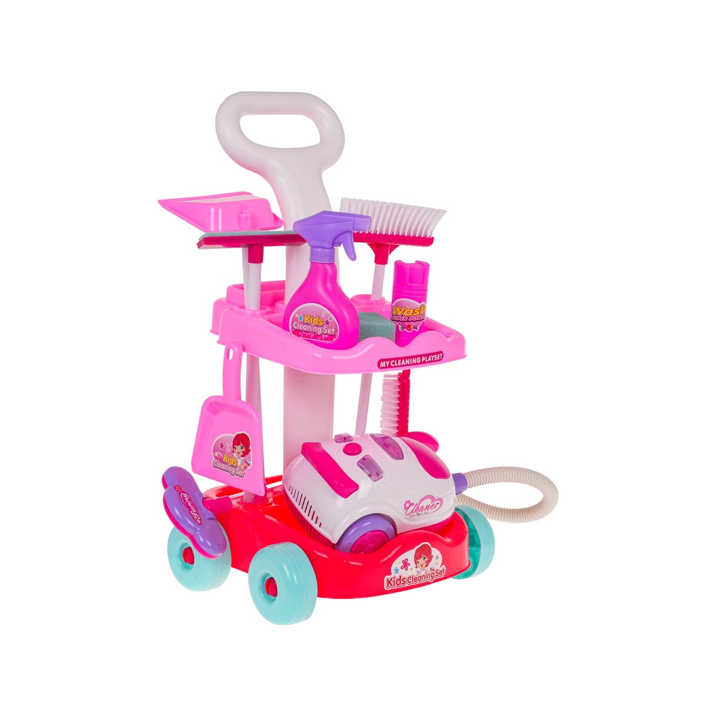 Dobre vybavená upratovacia súprava s interaktívnym vysávačom pre deti od 3 rokov. Súprava je vyrobená z najkvalitnejšieho plastu v živých farbách. Súprava obsahuje kočík s madlom na tlačenie a kolieskami, ako aj dve police, interaktívny vysávač, metlu a príslušenstvo na čistenie. Vysávač je napájaný 3 x AA 1,5 V batériami (nie sú súčasťou), vydáva zvuky pri vysávaní, má osvetlenie a odvádza drobné nečistoty z povrchu.