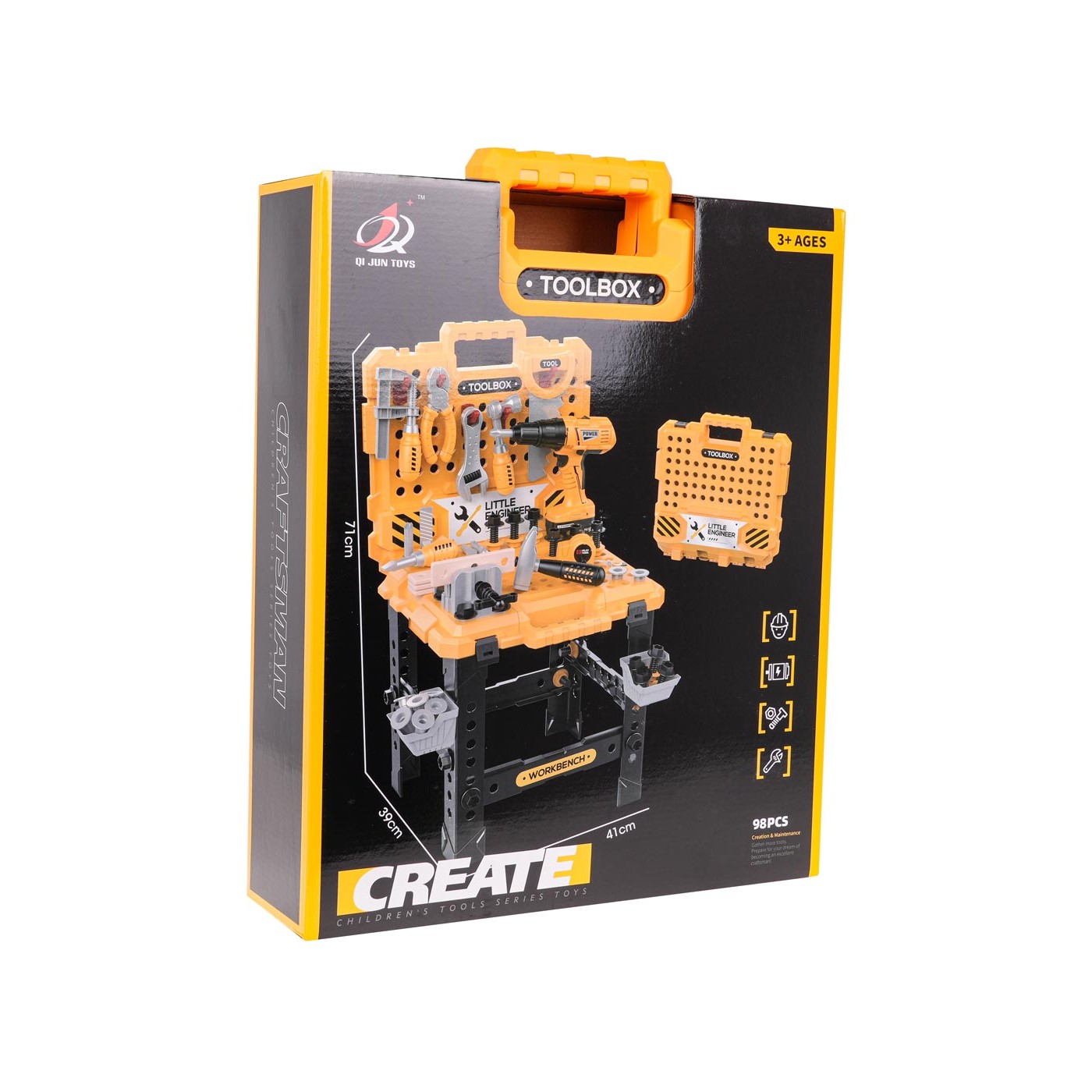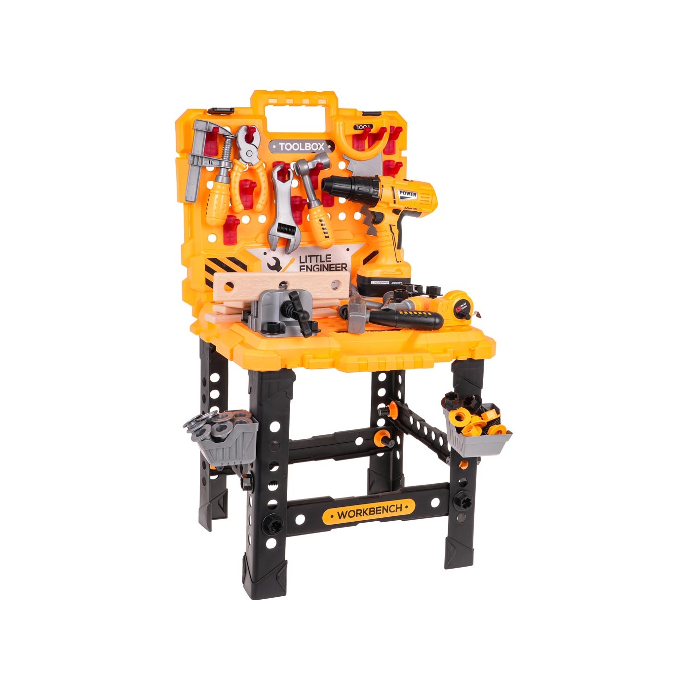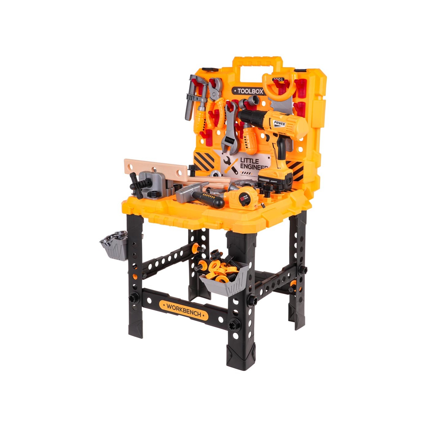 - určené pre deti od 3 rokov, - vyrobené z najkvalitnejších materiálov, - možnosť stavby pracovného stola a kufríka na náradie, - bohato vybavený až 98 prvkami, - batériový vŕtací skrutkovač, - vymeniteľné vrtáky, - vŕtacie skrutky a odskrutky, - zvuky pri práci vŕtačky/skrutkovača, - vŕtačka má vyberateľnú batériu, - pohyblivý zverák. |