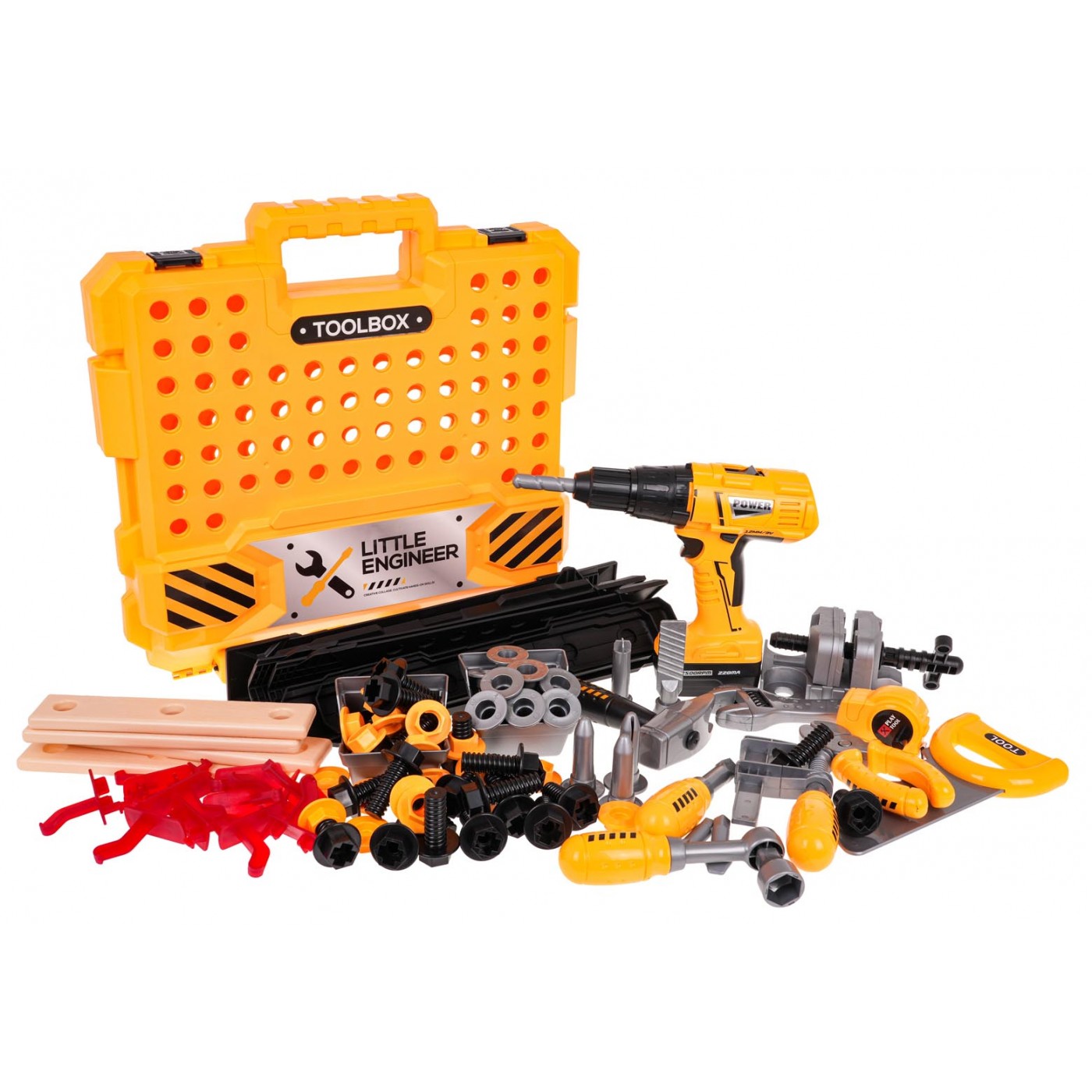Dobre vybavená súprava náradia 2 v 1 s interaktívnou vŕtačkou a skrutkovačom pre deti od 3 rokov. Súprava je vyrobená z najkvalitnejšieho plastu a pozostáva z 98 prvkov. Z konštrukčných dielov súpravy vytvoríme pracovný stôl alebo kufrík na náradie. Sada obsahuje batériový skrutkovač a vŕtačku, ktorá vlastne skrutkuje a odskrutkuje a pri prevádzke vydáva zvuky typické pre toto zariadenie. Zverák, ktorý je súčasťou súpravy, sa vysúva manuálne. Sada ďalej obsahuje: ručnú pílu, kladivo, kliešte, kľúč, svorku, kľúč na kolesá, krajčírsky meter, skrutkovacie prvky a množstvo skrutiek, uzáverov a hmoždiniek. Skrutkovač/vŕtačka je napájaná 2 x AA 1,5 V batériami (nie sú súčasťou balenia).