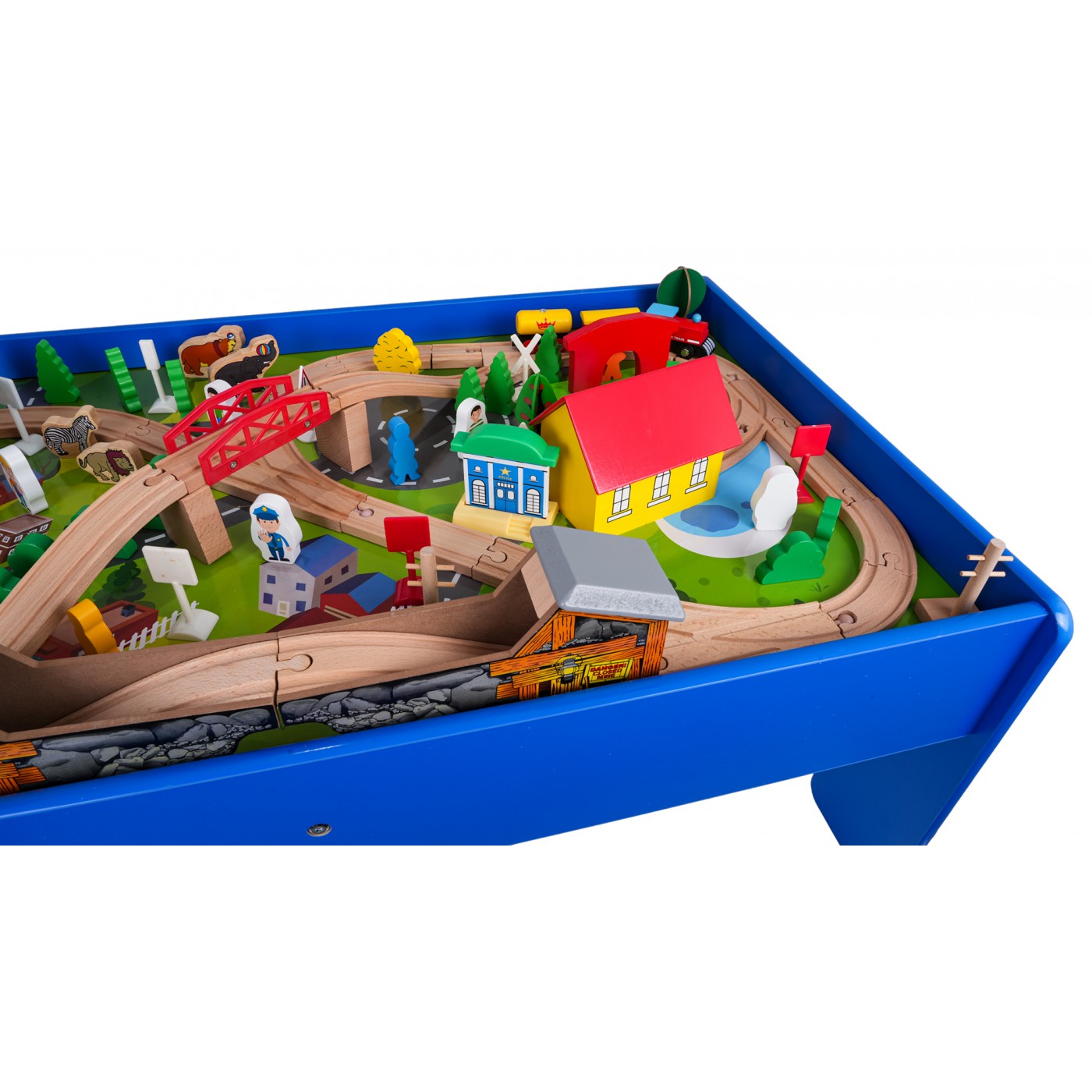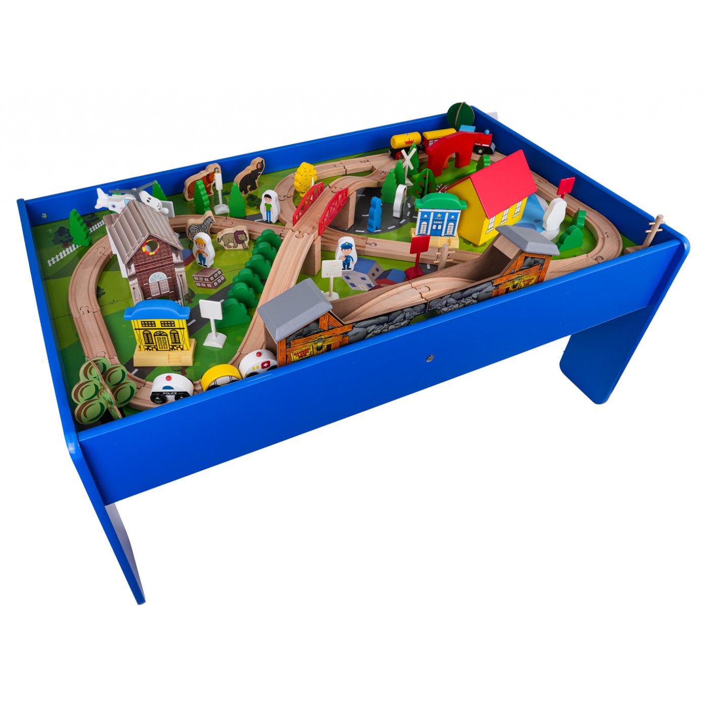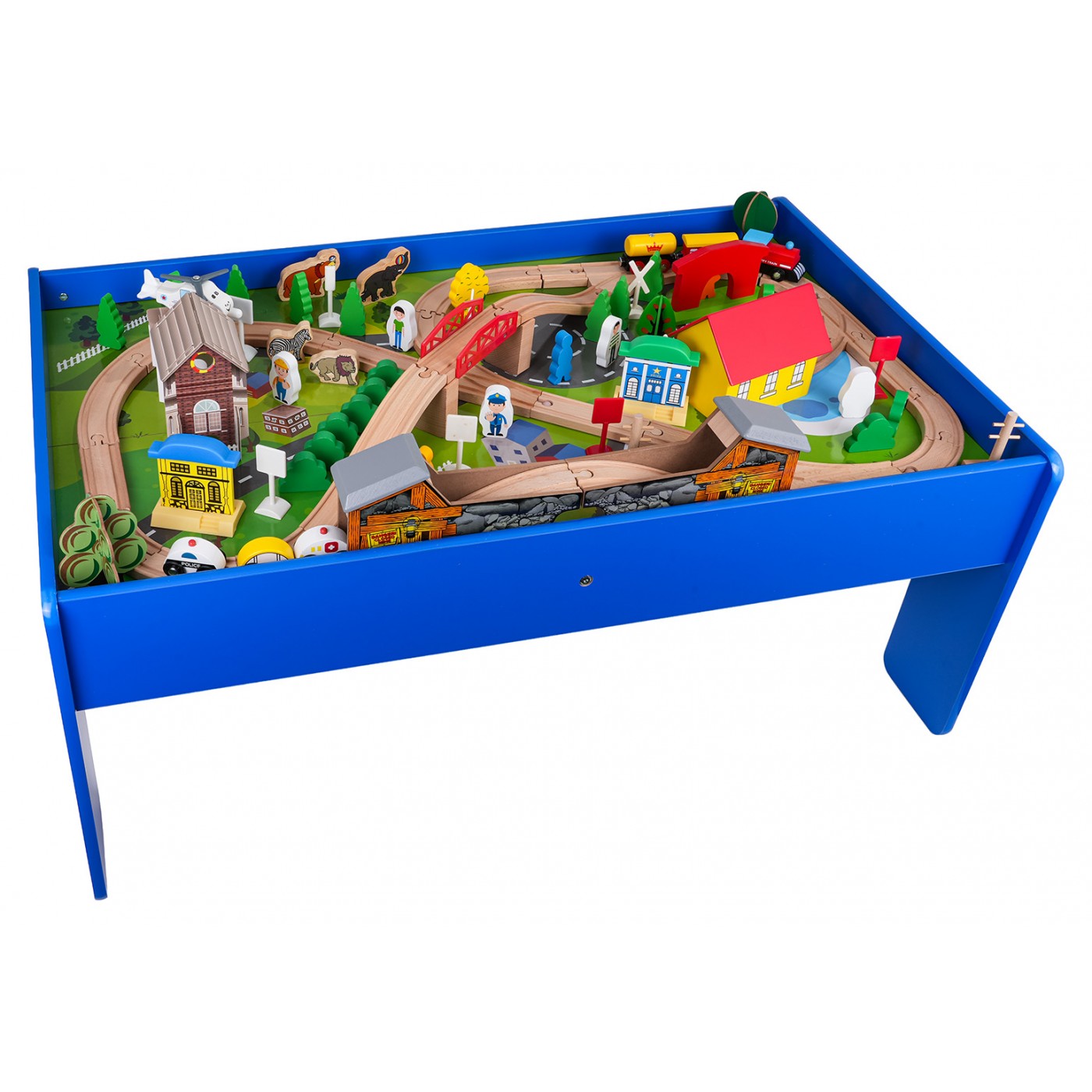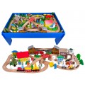 Drevená vláčikodráha so stolom a množstvom príslušenstva, vhodná pre deti od troch rokov. Sada obsahuje drevené koľajnice s vláčikom a vláčikodráhu, umiestnené na pevnom drevenom stole s motívom cesty na vrchu. Stôl má tiež vyvýšené okraje, ktoré zabraňujú pádu dielikov.