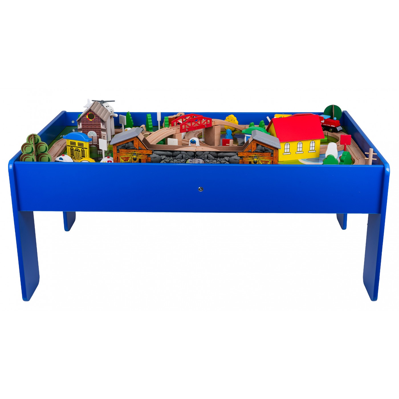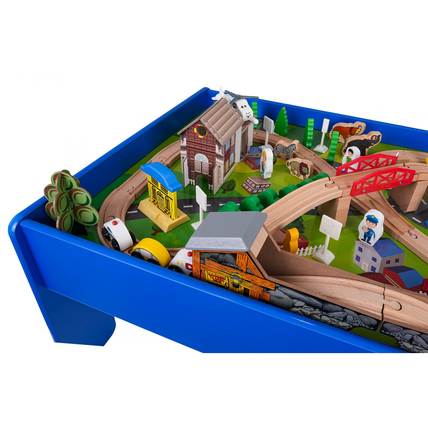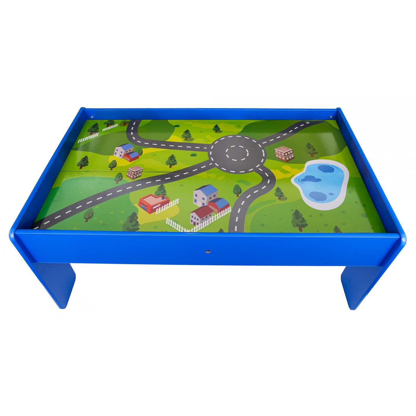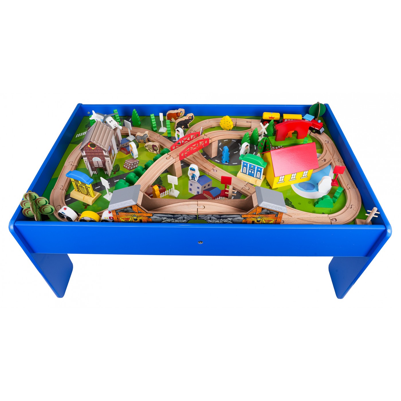 Drevená vláčikodráha so stolom a množstvom príslušenstva, vhodná pre deti od troch rokov. Sada obsahuje drevené koľajnice s vláčikom a vláčikodráhu, umiestnené na pevnom drevenom stole s motívom cesty na vrchu. Stôl má tiež vyvýšené okraje, ktoré zabraňujú pádu dielikov.
