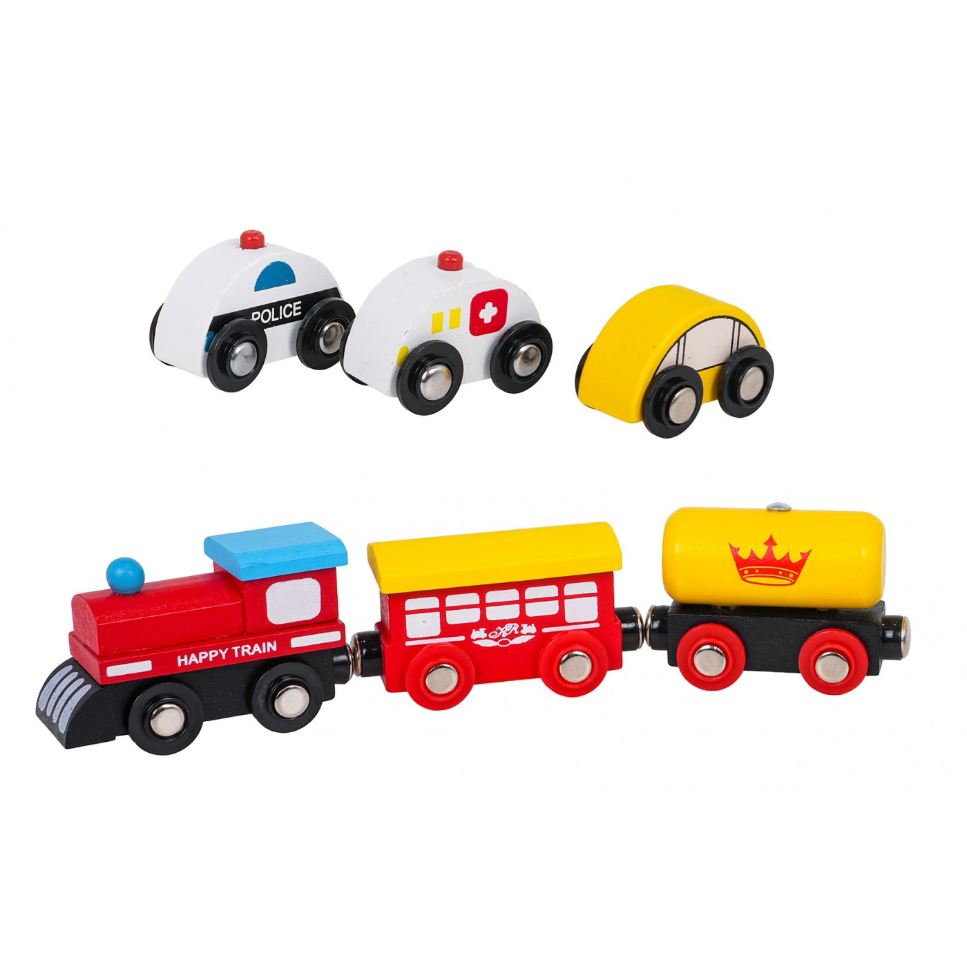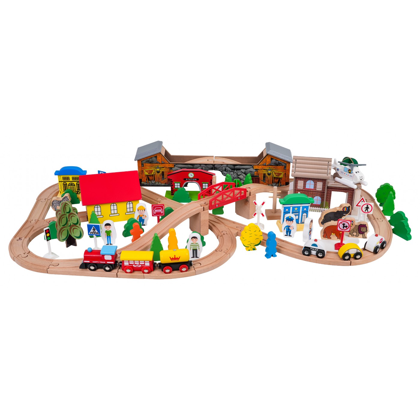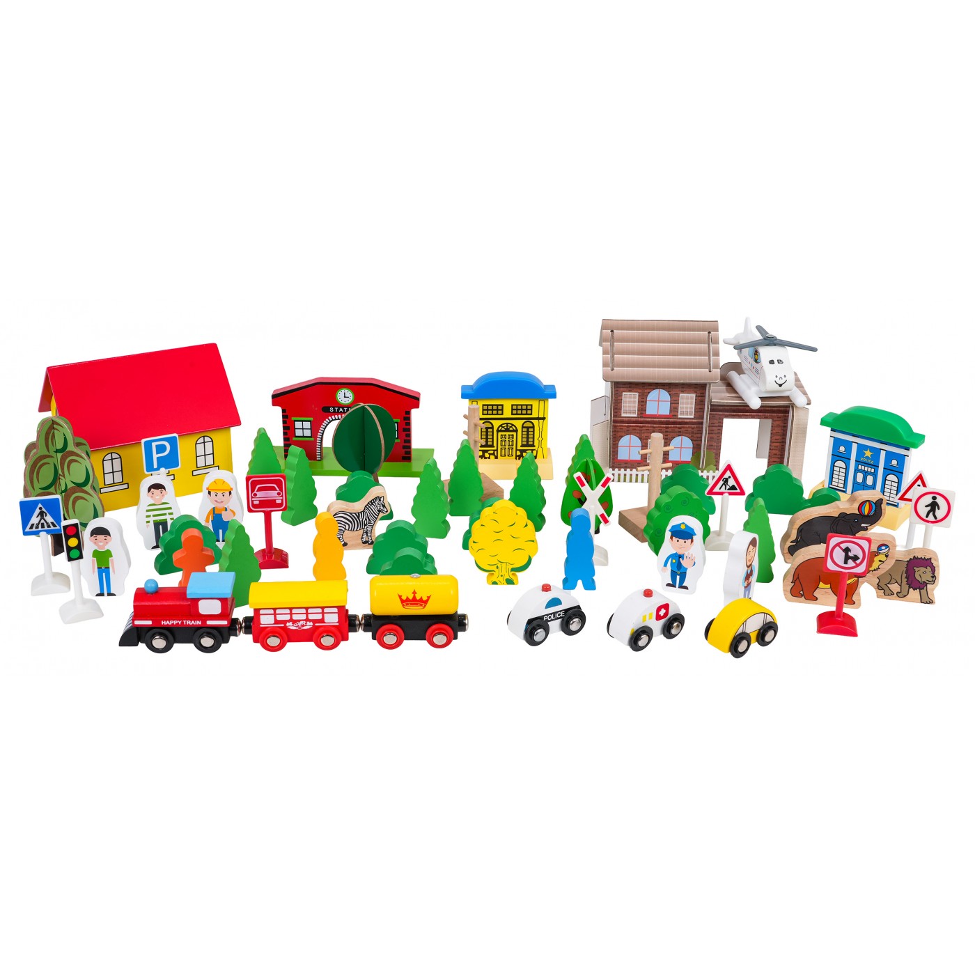 - drevený stôl s kresbou cesty na vrchu, - drevené koľajnice - drevená lokomotíva s 3 vagónmi spojenými magnetmi, - drevená čerpacia stanica, - drevená policajná stanica, - drevený vrtuľník s pohyblivými vrtuľami, - 9 dopravných značiek, - 3 x drevené autíčko, - 21 drevených stromov a kríkov, - 8 drevených kociek s postavičkami, - 4 drevené kocky so zvieratkami, - 2 x tyč, - depo, - budova s pristávacou plochou, - obrázkové pokyny. |
