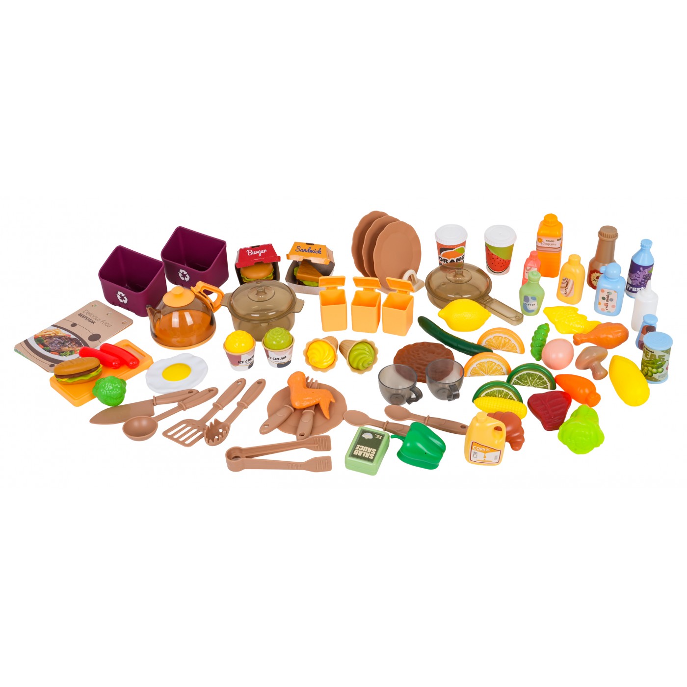 - konštrukčné prvky kuchyne, - hrniec s pokrievkou - panvica - kanvica na kávu, - 4 x tanier, - príbory: nôž, vidlička, lyžica - naberačka, špachtľa, sekáčik na mäso, kliešte, lyžica na cestoviny, - 2 x šálka, - 2 x odpadkové koše, - imitácie potravín: šalát, zelená paprika, limetka, pomaranč, huba, hamburger, hotdog, sendvič, mrkva, jahodová omáčka, pomarančová omáčka, 2 x kukurica, citrón, vajce natvrdo, zelená uhorka, hrášok, steak, kuracie mäso (stehno, krídlo), volské oko, ryba, klobásy, kečup, kartóny sušienok, mlieko a zmrzlina, čokoládové mlieko, instantná polievka, - 4 x jedálny lístok, - doska na krájanie, - 3 x nádoby na koreniny, - ozdobné nálepky, - pokyny. |