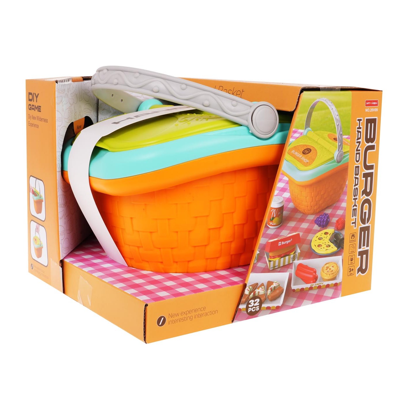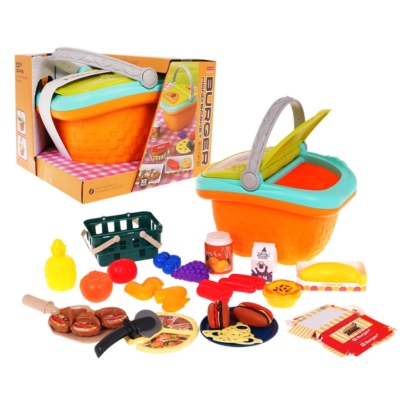 Piknikový kôš s príslušenstvom pre deti od 3 rokov. Ideálny spôsob, ako sa zabaviť vonku. Táto dobre vybavená sada sa skladá z 32 prvkov: priestranný košík, malý košík, plastové ovocie a zelenina, mäso, hamburgery, tortilly, koláč, syr atď.