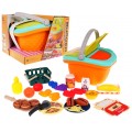 - piknikový kôš s rukoväťou, - malý košík, - plastové ovocie: ananás, jahoda, hrozno, banán, čučoriedka, - paradajka, - mäso: 2 x klobása, 2 x kuracie krídelká, - pizza, - 3 x tortilly, - 2 x hot dog, - tortu, - 2 plátky syra, - plechovka nápoja, - kartón mlieka, - tanier, - špachtľa na pizzu, - koliesko na pizzu, - 3 zásobníky papiera, - 2 balíčky burgerov, - dekoratívne nálepky. |