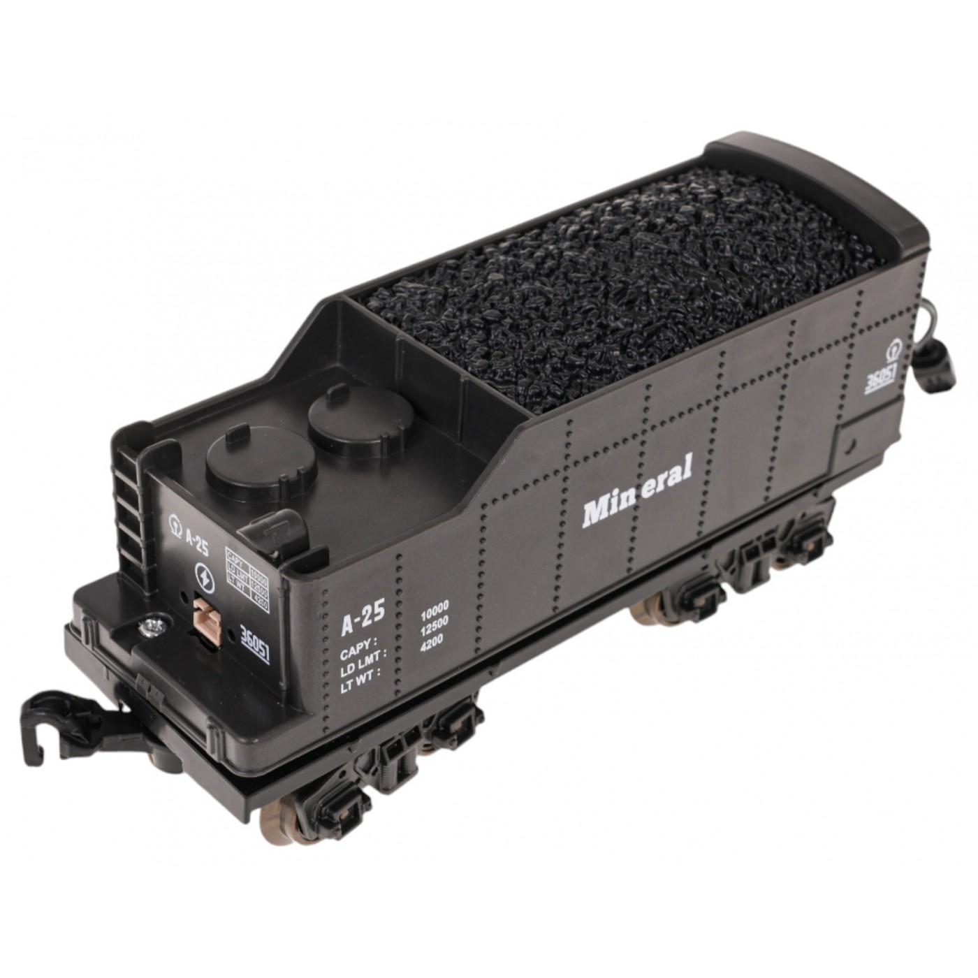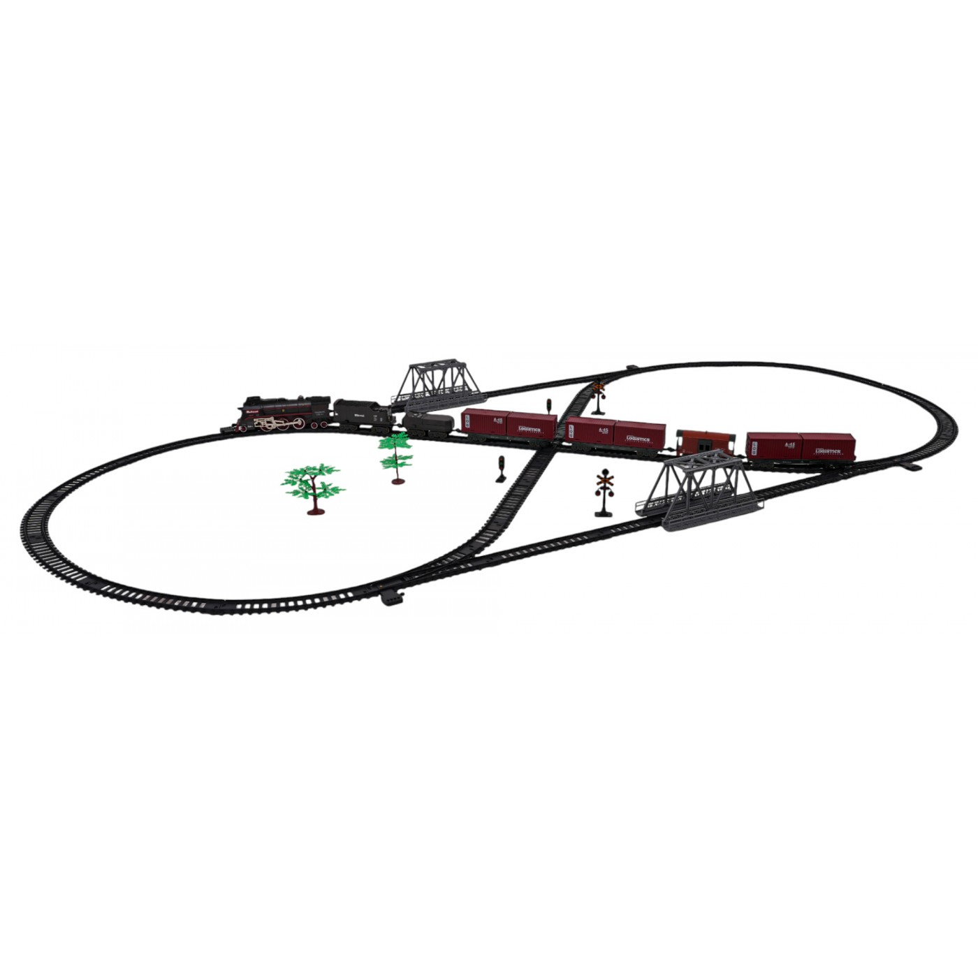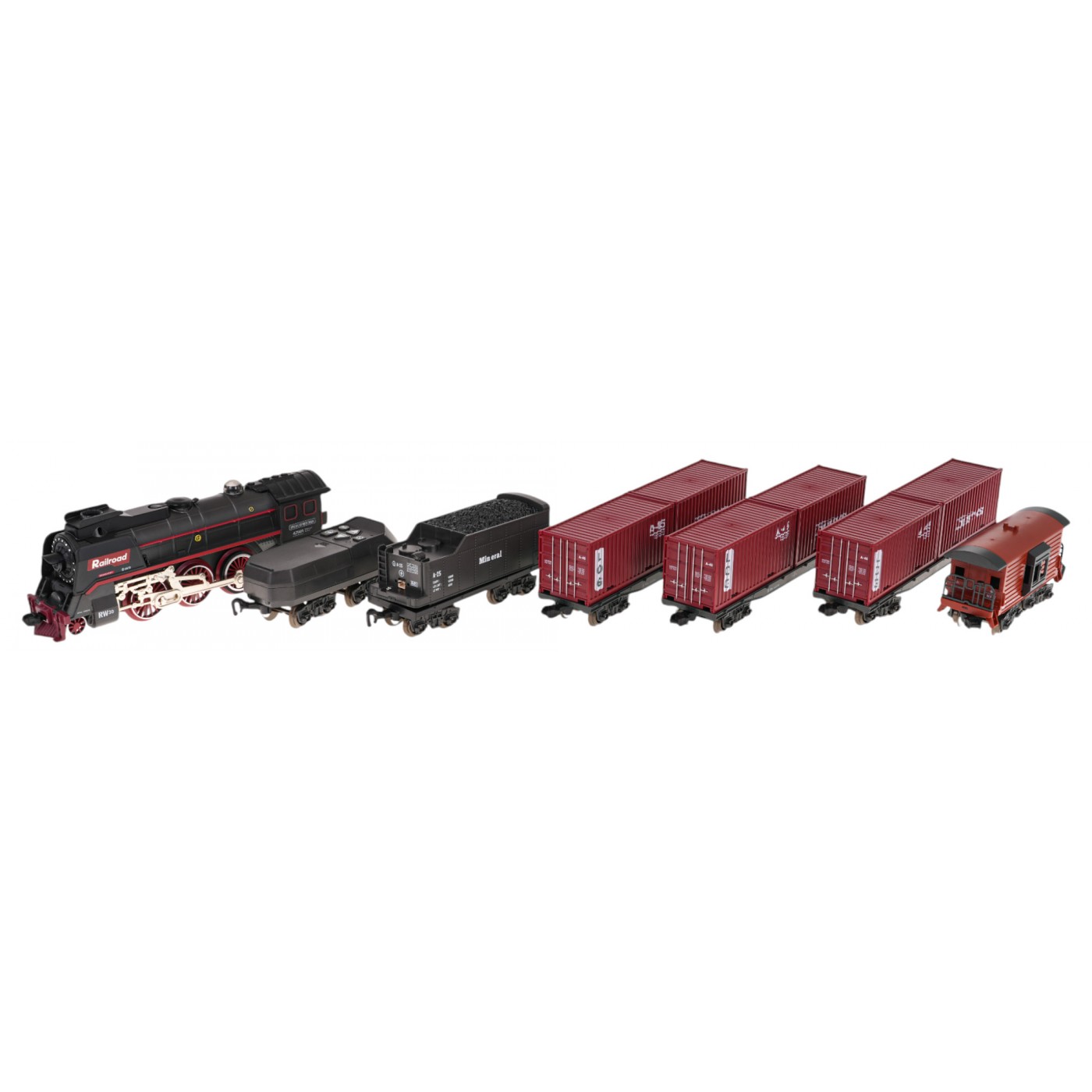 - lokomotíva, - osobné auto, - vagón na uhlie, - vozeň s pilotom, - 3 x vozeň s kontajnermi, - koľajové komponenty, - 2 mosty, - 2 znaky, - 2 stromy, - vodná pipeta, - USB nabíjací kábel, - manuál. |