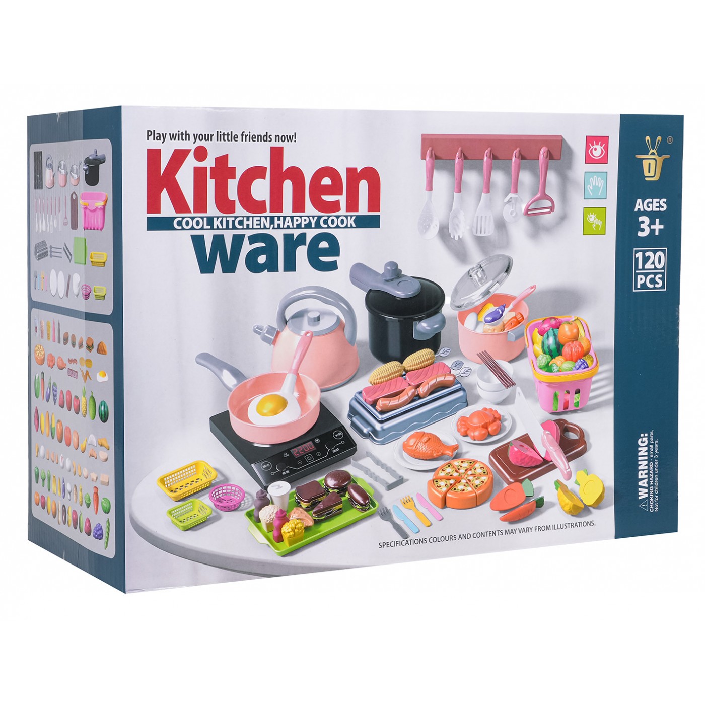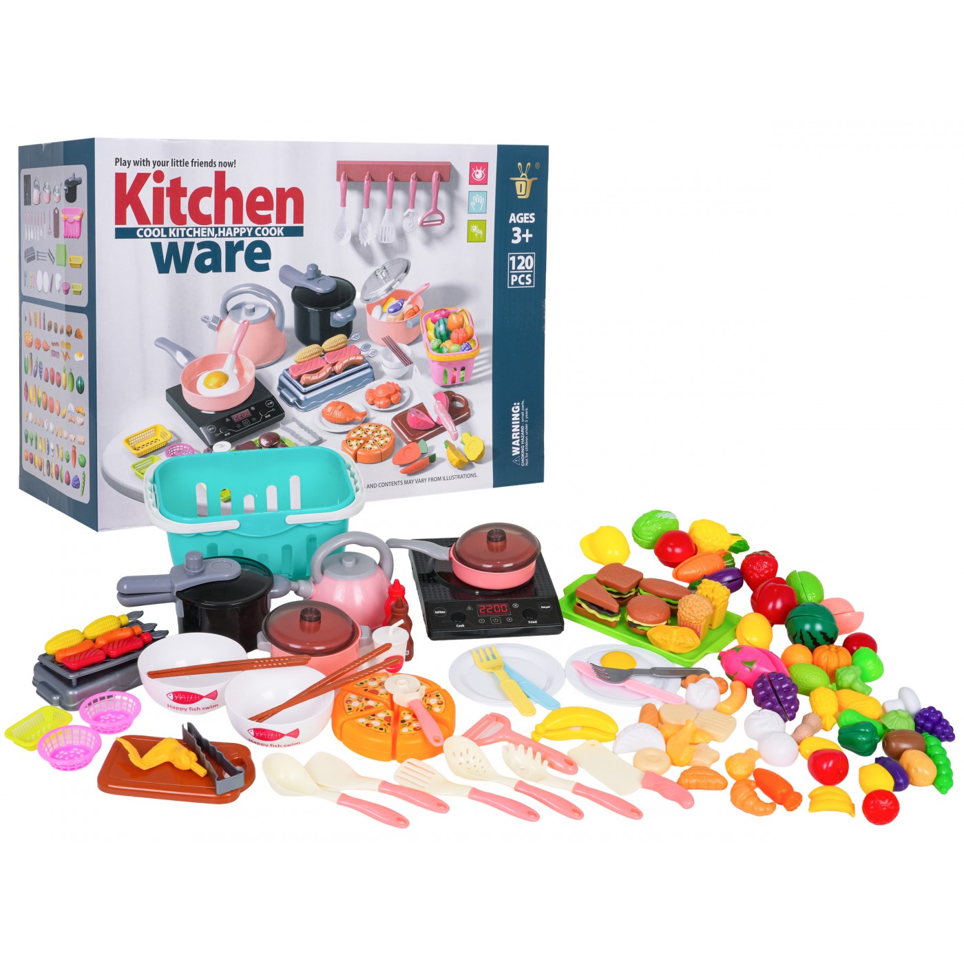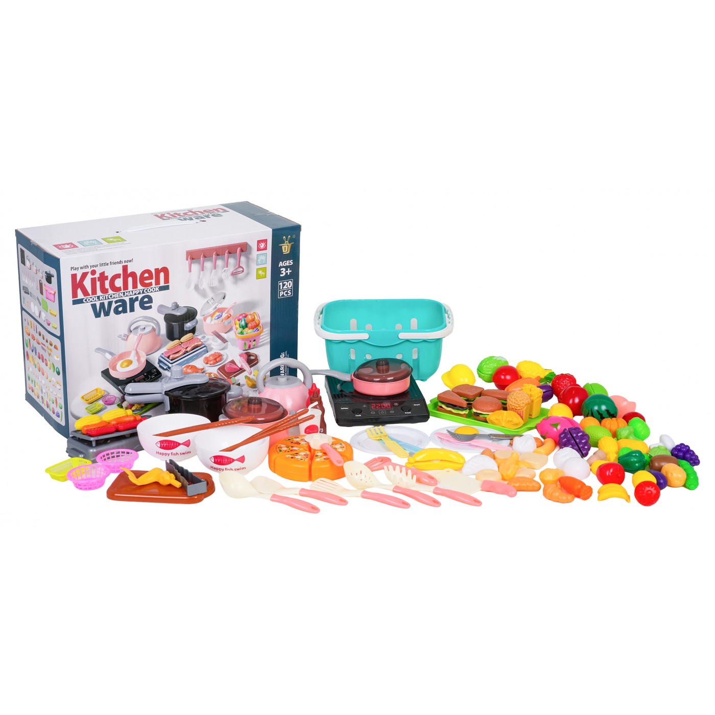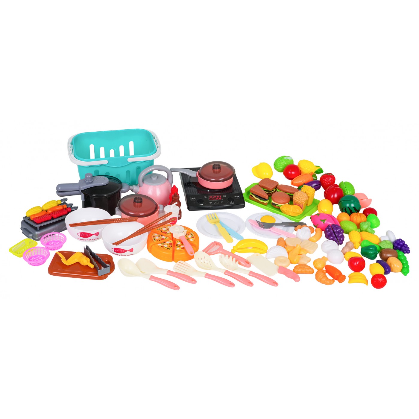 - indukčný varič, - veľký nákupný košík, - hrniec s pokrievkou, - panvica s pokrievkou, - tlakový hrniec, - kanvica - grilovanie, - doska na krájanie, - tácka, - 2 misky, - 3 x malý košík, - kliešte, - lyžica na cestoviny, - naberačka, - 2 x špachtľa, - pizzové koleso, - škrabka, - sekáčik na mäso, - 4 x palice, - 2 x vidličky, - 2x nôž, - 2 x taniere, - simulované potraviny: nápoj v pohári, pizza na repe, sendvič, volské oko, pukance, hranolky, kečup, omáčka, hotdog, hamburger, toast, ananás na repe, jahoda na repe, šalát na repe, broskyňa na repe, citrón na repe, paradajka na repe, melón na repe, červená paprika na repe, hrozno na repe, mrkva na repe, banán na repe, 3 x kebab na paličke, baklažán na repe, 2 x snehové pusinky, 2 x knedle, tekvica, baklažán, hrozno, zelený hrášok, brokolica, kukurica, zemiak, 3 x šalát, paradajka, červená a zelená paprika, kiwi, huba, jahoda, pomaranč, ananás, mrkva, banány, lieskový orech, citrón, kuracie stehno, kuracie krídlo, rezeň, 3 x sušienky, chlieb, chala, croissant. |