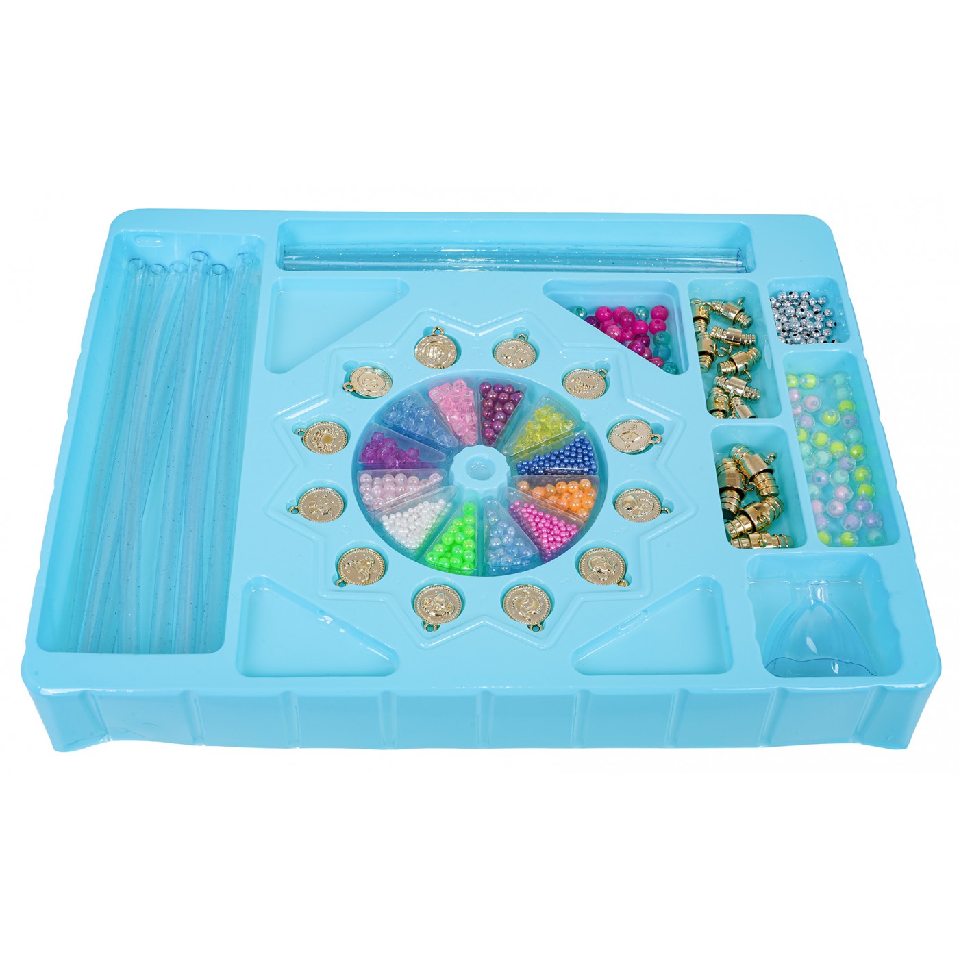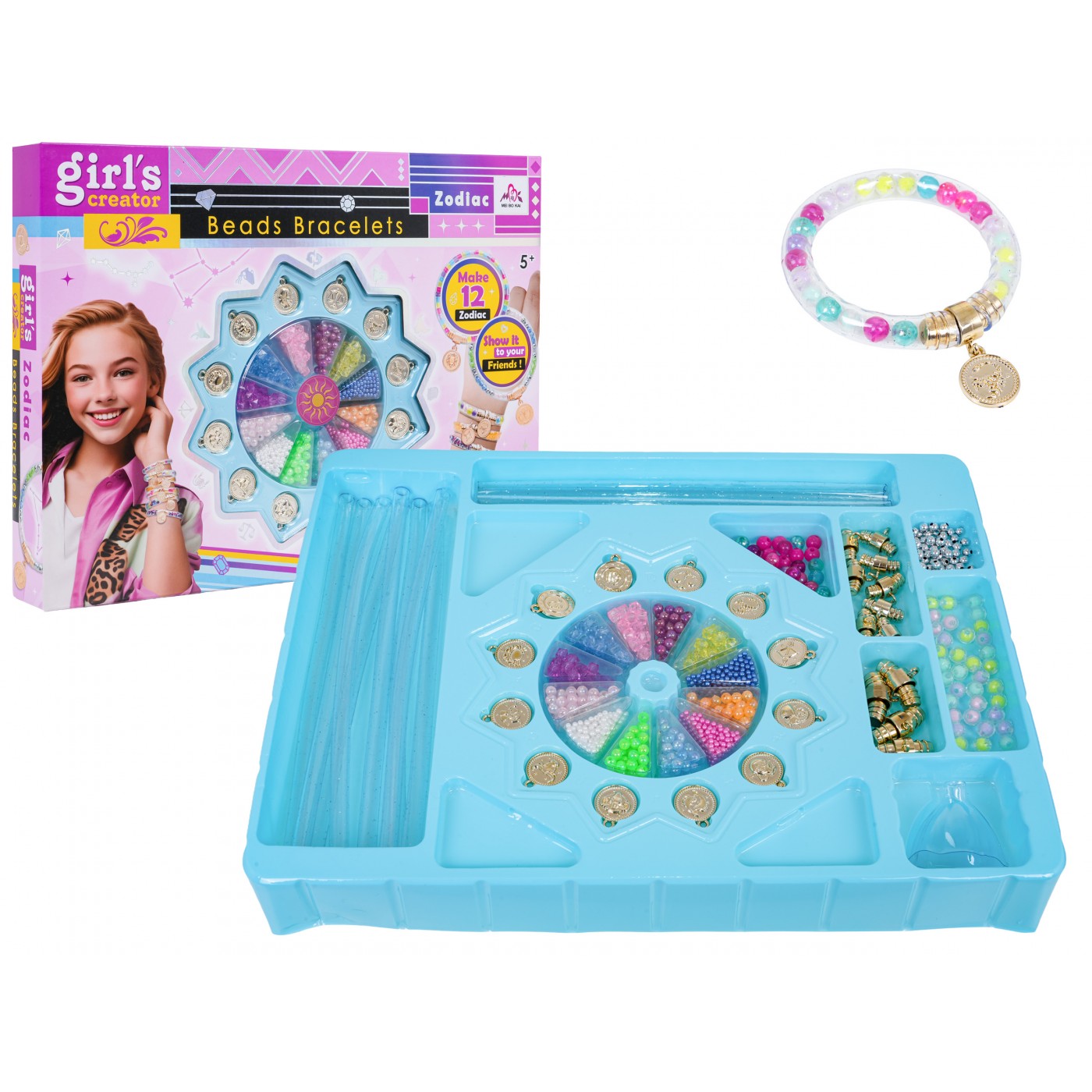 Kreatívna sada na výrobu náramkov pre deti od piatich rokov. Táto dobre vybavená sada je vyrobená z najkvalitnejších materiálov bezpečných pre deti. Je to skvelý nástroj na rozvoj fantázie a kreatívneho myslenia. Šperky vášho dieťaťa budú jedinečné a neopakovateľné. Sada obsahuje priehľadné trubičky na výrobu náramkov, farebné korálky a prívesky so znamením zverokruhu.