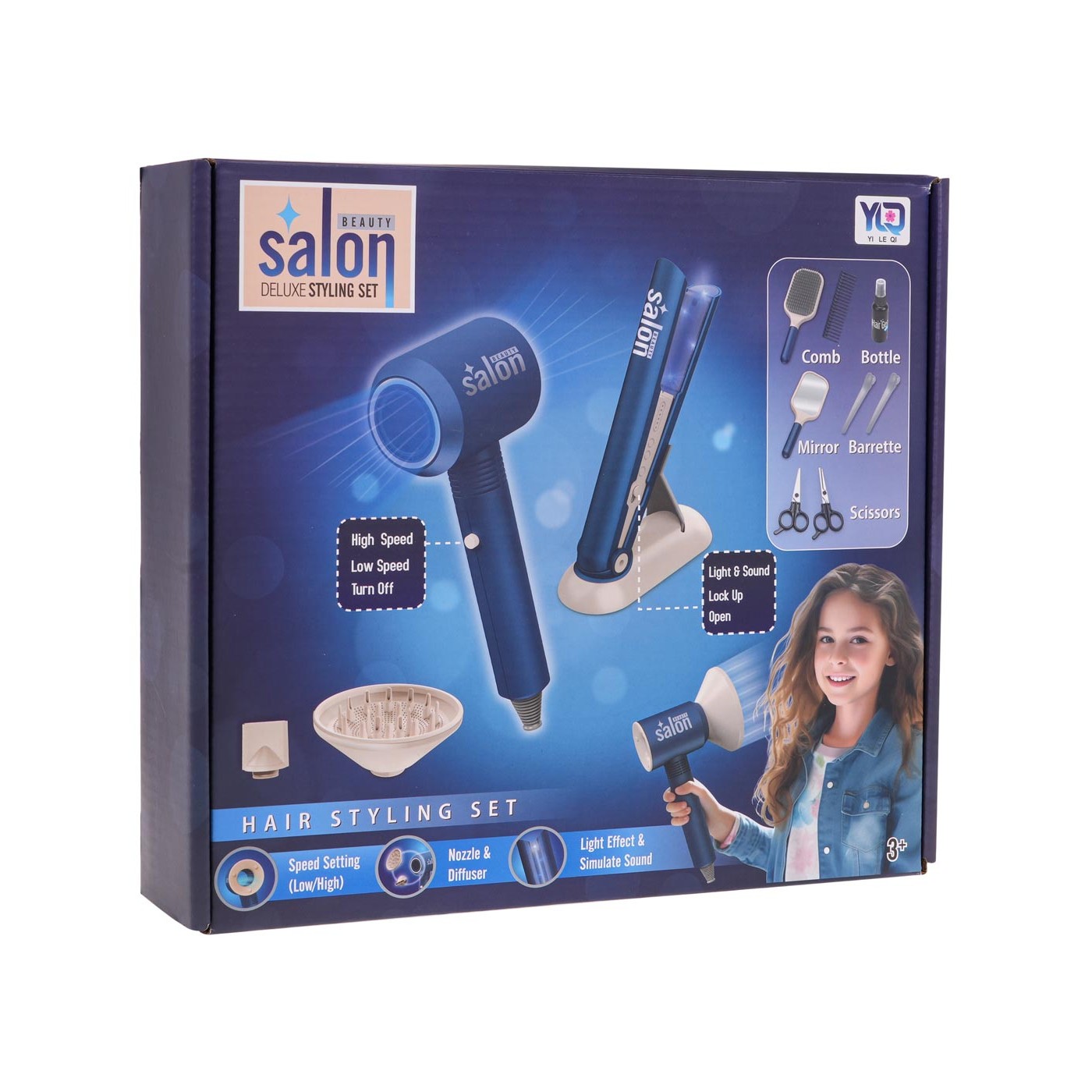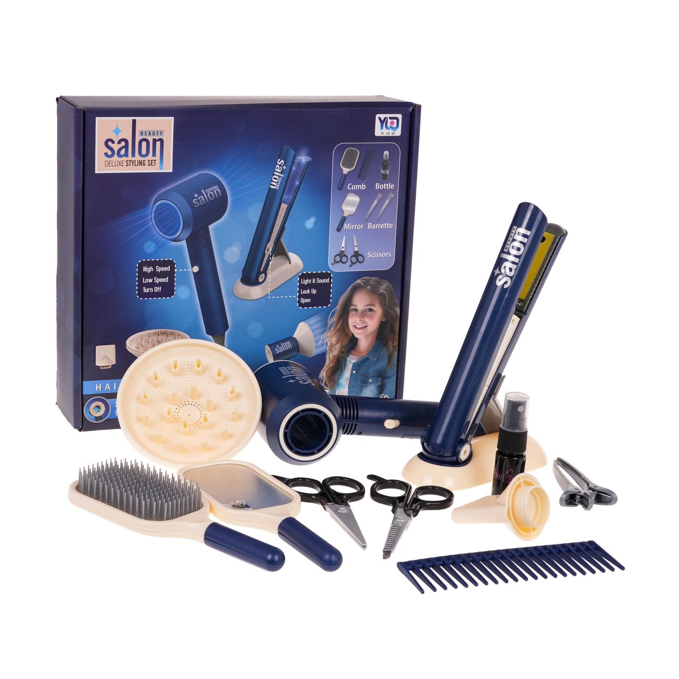 Interaktívna, dobre vybavená kadernícka súprava s fénom na vlasy s vymeniteľnými tryskami a batériovou žehličkou na vlasy je určená pre deti od 3 rokov. Sada obsahuje širokú škálu nástrojov potrebných pre prácu kaderníka, vrátane fénu, žehličky, nožníc, hrebeňov na vlasy a ďalších doplnkov. Sušič vlasov vydáva prúd vzduchu. Má dvojstupňovú reguláciu prúdenia vzduchu a pri sušení vydáva zvuky ako ozajstné. Žehlička má svetelné efekty a zvuky sprevádzajúce vyrovnávanie vlasov. Fén je napájaný 3 x AAA 1,5 V batériami (nie sú súčasťou), žehlička je napájaná 2 x AAA 1,5 V batériami (nie sú súčasťou).