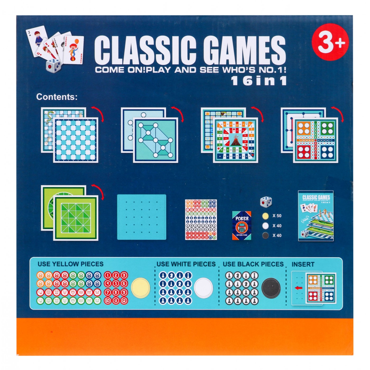 | | Zestaw gier 16 w 1 to propozycja dla dzieci od 3-go roku życia. Świetny sposób na spędzenie wolnego czasu we wspólnym gronie. Każdy znajdzie coś dla siebie, do wyboru aż 16 gier i mnóstwo akcesoriów niezbędnych do ich rozegrania. 1. Szachy międzynarodowe Przygotuj planszę do gry oraz 16 białych i czarnych pionków: król, hetman, dwa gońce, dwa skoczki, dwie wieże oraz osiem pionków, ułóż je na planszy zgodnie z instrukcją. Białe pionki zaczynają jako pierwsze. Celem gry jest wyeliminowanie króla przeciwnika. Królowie mogą poruszać się w pionie, poziomie i po przekątnej. Wieże mogą poruszać się w pionie i poziomie, ale nie mogą poruszać się po przekątnej. Gońcy mogą poruszać się tylko po przekątnej. 2. Szczęśliwe 26 Przygotuj planszę do gry i pionki z numerkami od 1 do 12. Układaj tak numerki, żeby w jednym rzędzie suma liczb wynosiła 26. Zacznij od góry i idź zgodnie z kierunkiem wskazówek zegara. 3. Gęsie szachy Przygotuj planszę do gry, 4 pionki i kostkę do gry. Umieść pionki przy wulkanie a następnie naprzemiennie z innym/innymi graczami rzucaj kostką i przemieszczaj pionki o taką ilość ile wskazuje kostka. Jeśli staniesz na pozycji 8,16,26,39,53 – możesz ponownie rzucić kostką. Jeśli dotrzesz do bloku numer 21, wróć do pozycji 18. Na pozycji 31 wróć do 6, z pozycji 42 wróć do 36, na stanowisku 52 wróć do 45, oraz na pozycji 58 wróć do 54. Gracz który jako pierwszy dotrze do pozycji 63 wygrywa. 4. Węże i drabiny Przygotuj planszę do gry, 4 pionki i kostkę. Umieść pionki w bloku nr.1 a następnie rzucajcie kostką i przesuwajcie pionki o tyle miejsc, ile oczek pokazuje kostka. Jeśli zatrzymacie się przy bloku z drabiną wejdźcie na nią. Po drabinie można się tylko wspinać, nie można z niej zejść w dół. Jeżeli liczba z kości przekracza liczbę bloków pozostawionych do celu, gracze muszą cofnąć się o liczbę przekraczającą. Gracz dociera do celu tylko wtedy gdy liczba na kostce jest dokładnie taka jak liczba bloków pozostawionych do miejsca docelowego. Gracz który jako pierwszy dotrze do celu wygrywa grę. 5. Warcaby (pięć w rzędzie) Przygotuj planszę do gry, 5 białych i 5 czarnych pionków. Ułóż je na planszy tak jak pokazuje instrukcja. Każdy gracz może poruszać pionkami poziomo lub pionowo i tyle kroków ile chce, ale nie może zmieniać kierunku w połowie drogi. Gracz wygrywa gdy albo zbije wszystkie pionki przeciwników, albo jego przeciwnik nie ma gdzie pójść. 6. Szachy arbuzowe Przygotuj planszę do gry oraz 6 białych i 6 czarnych pionków. Ułóż je na planszy tak jak pokazuje instrukcja. Każdy pionek może uczestniczyć w unieruchamianiu pionków innego gracza, otoczone pionki wroga są przejmowane. Gracz który zdobędzie cztery pionki swojego przeciwnika wygrywa grę. 7. Zwierzęta Przygotuj planszę do gry oraz 16 figur ze zwierzętami. Gracze mają po 8 sztuk zwierzątek takich jak: słoń, lew, tygrys, gepard, wilk, pies, kot, mysz. Należy je umieścić w odpowiednich miejscach jak pokazuje instrukcja. Silniejszy zje słabszego. Siła zwierząt jest w kolejności od najsilniejszego do słabszego. Słoń>lew>tygrys>gepard>wilk>pies>kot>mysz>słoń. Jeśli zwierzę jednego gracza dostanie się do jaskini przeciwnika, ten gracz wygrywa, gracze nie mogą poruszać się własnymi jaskiniami. Gra kończy się jeśli jeden gracz zje wszystkie zwierzęta przeciwnika lub jeśli wszystkie zwierzęta gracza są uwięzione i nie mogą się poruszać. 8. Gra wojenna Przygotuj planszę do gry, jeden czarny pionek i trzy białe. Gracze wybierają kolor pionków. Białe pionki to bloki, czarne to wojska. Ułóż pionki tak jak pokazuje instrukcja. Armia czarna musi wydostać się z bunkrów (białe), podczas gdy bunkry muszą otoczyć czarne. Czarny idzie pierwszy, może poruszać się do tyłu, przodu, w prawo i w lewo. Białe nie mogą się cofać. Białe wygrywają gdy otoczą czarne, a czarne wygrywają gdy wyjdą z kręgu. 9. Morris dziewięciu mężczyzn Przygotuj planszę do gry 9 białych pionków i 9 czarnych. Każdy gracz wybiera kolor pionków. Obaj gracze wykonują po 1 ruchu na raz, jeśli gracz wykona trzy pionki pod rząd(poziomo lub pionowo), może wyjąć jeden z pionków przeciwnika, ale nie może wyjąć pionków, które są już w rzędzie po trzy. Kiedy wszystkie 9 pionków znajduje się już na planszy, gracze mogą przenieść pionki do pobliskich bloków za pomocą strzałki pokazanej na planszy. Gdy graczowi pozostaną trzy pionki, pionki mogą się przemieszczać w dowolne miejsce na planszy, niezależnie od ich pozycji. Gracz przegrywa, gdy zostaną mu tylko 2 pionki lub wszystkie jego pionki nie mogą się poruszać. 10. Latające szachy Przygotuj planszę do gry, 16 pionków (po 4 w każdym kolorze) i kostkę do gry. Każdy gracz wybiera kolor i umieszcza pionki w odpowiednich miejscach na planszy. Gra rozpoczyna się od najmłodszego gracza, a gracze rzucają kościami zgodnie z ruchem wskazówek zegara. Wystartuje tylko gracz który zdobędzie 6. Jeśli dostaniesz dwie 6 z rzędu możesz położyć kolejny pionek na planszy, lub przesunąć pionek który już jest na planszy. Gracz który pierwszy dotrze do celu wszystkimi pionkami wygrywa. 11. Pudełka Przygotuj planszę do gry, 12 czarnych i 12 białych pionków. Każdy gracz wybiera kolor pionków i układa je tak jak pokazuje instrukcja. Celem gry jest wyeliminowanie wszystkich pionków przeciwnika. Jeżeli twoje pionki znajdują się obok przeciwnika, a za przeciwnikiem znajduje się puste pole, możesz przeskoczyć pionek co zlikwiduje pionek przeciwnika. 12.Złap tygrysa Przygotuj planszę do gry, 16 czarnych i 1 biały pionek. Każdy wybiera kolor. Biały jest dla tygrysa, czarne to psy. Tygrys musi zjeść psy aby wydostać się z oblężenia, psy muszą otoczyć tygrysa. Drużyna biała wygrywa gdy wszyscy czarni są na zewnątrz lub gdy został już tylko 1 czarny. C