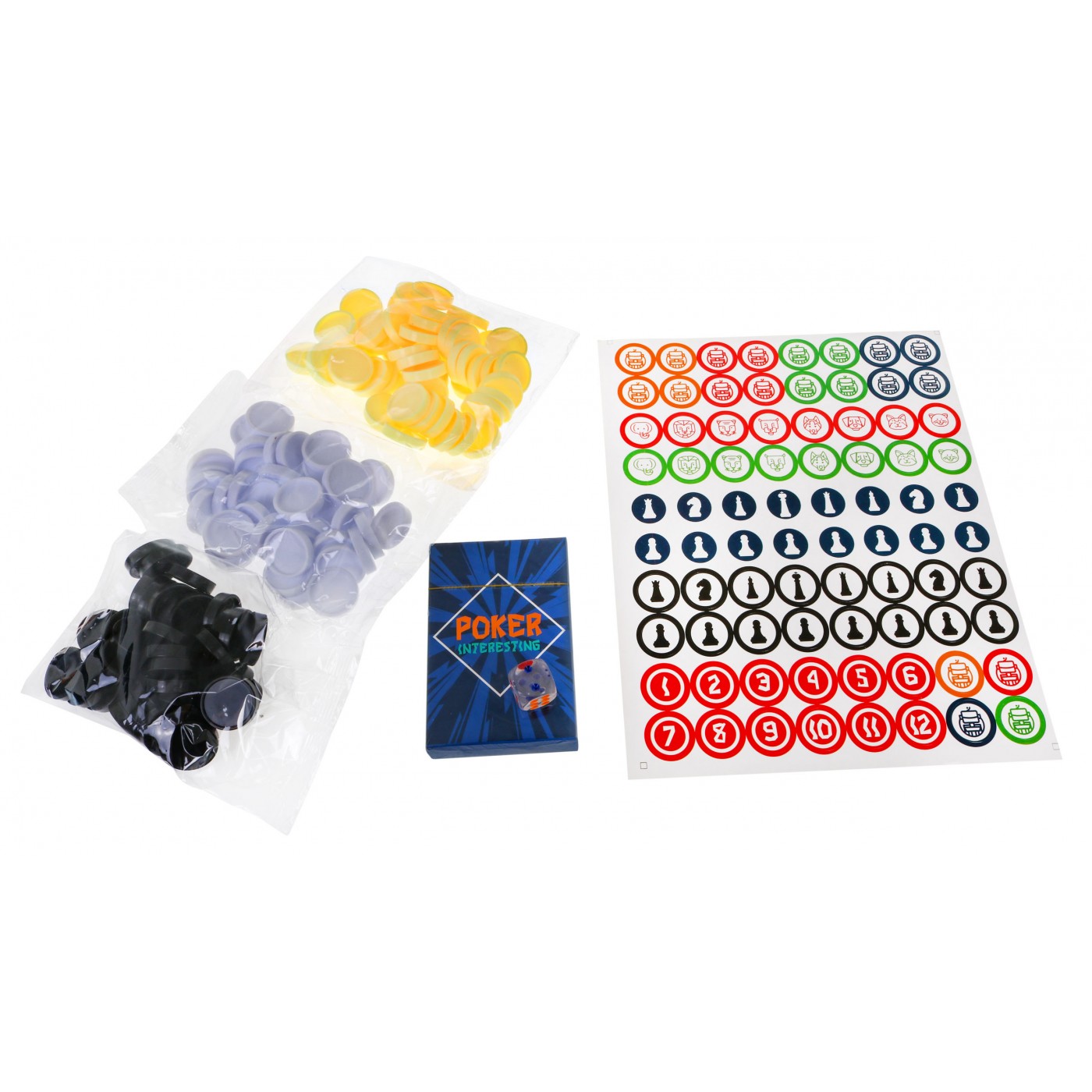 | | - plastikowa podstawka do plansz, - pięć dwustronnych plansz, - naklejki na pionki, - 50 pionków żółtych, - 40 pionków białych, - 40 pionków czarnych, - kostka do gry, - karty do pokera, - instrukcja. |
