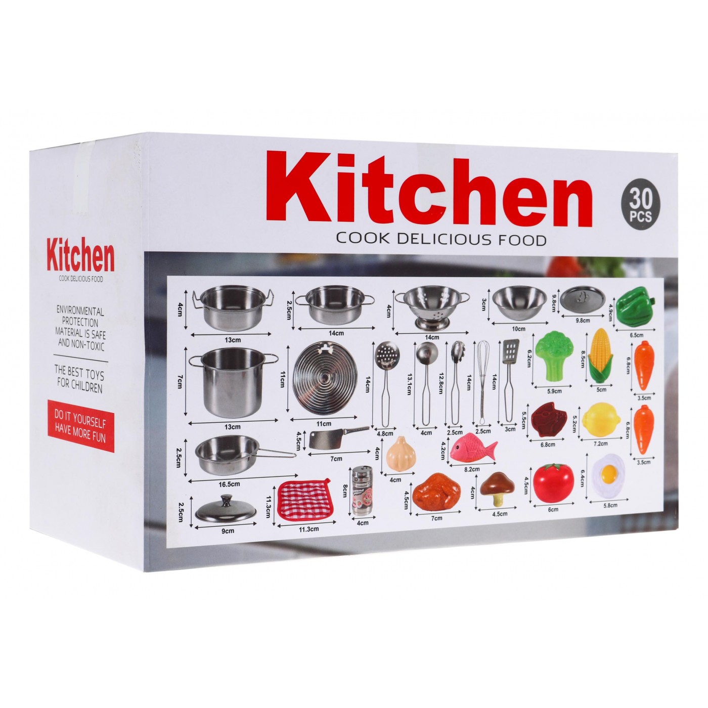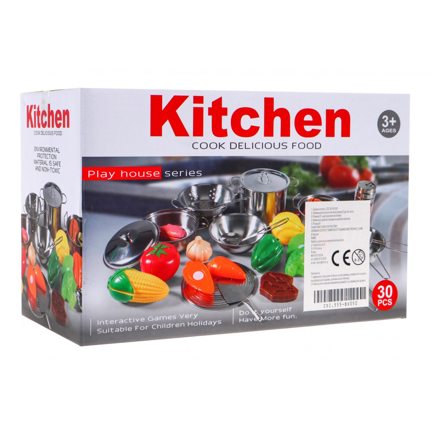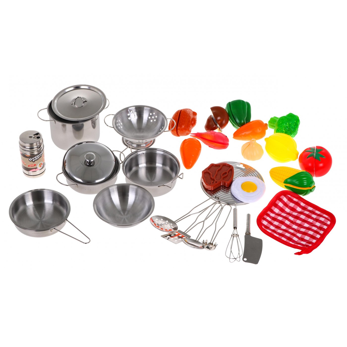 Mega kuchynská sada pre deti 3+ Kovové hrnce + Kuchynské nástroje + Jedlo 30 ks.