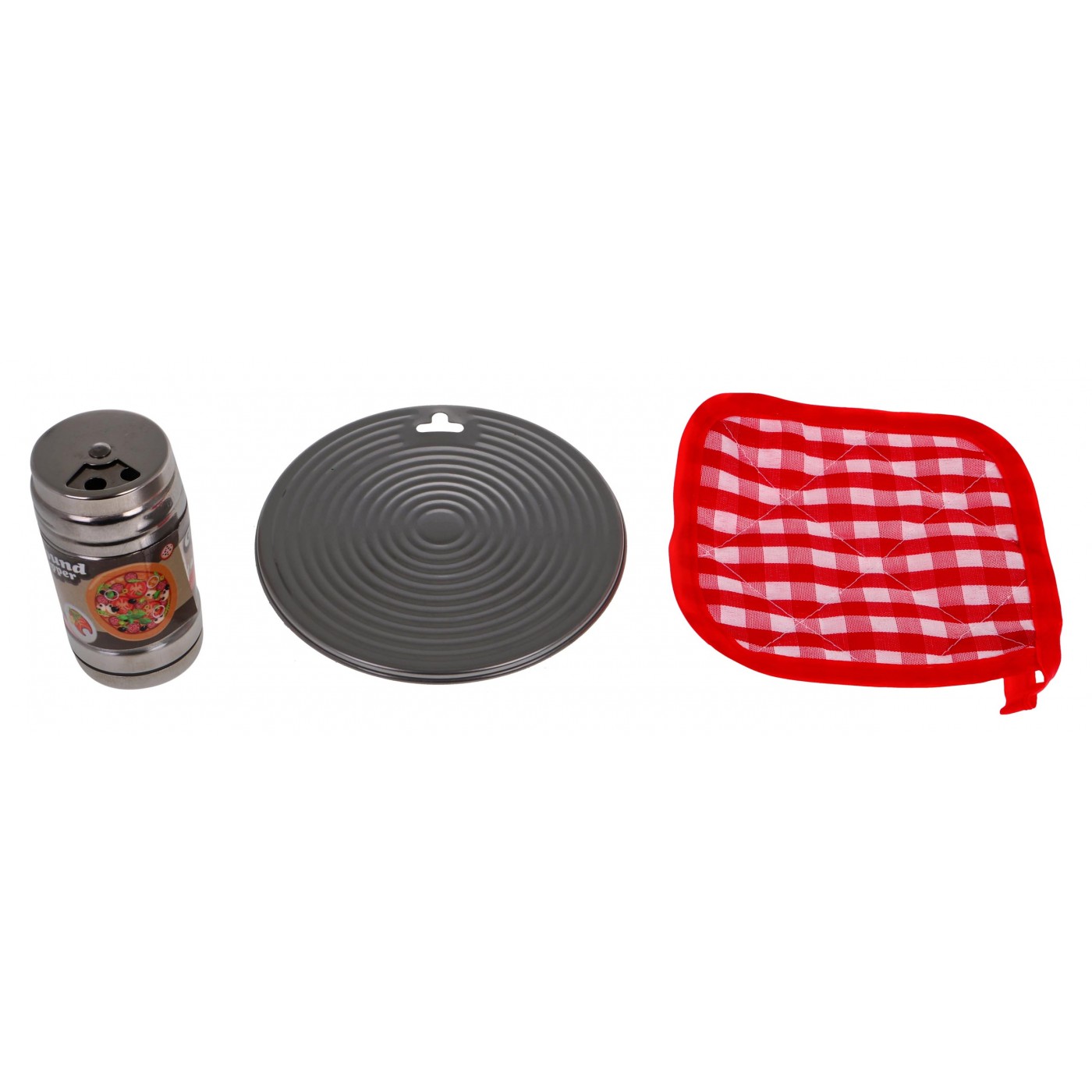 | | - metalowy garnek ok. 13x13x4cm, - metalowy garnek ok. 14x14x2.5cm, - metalowy durszlak ok. 14x14x4cm, - metalowa miska ok. 10x10x3cm, - metalowa pokrywka ok. 9.8x9.8.2.5cm, - metalowa podstawka ok. 11x11cm, - metalowy garnek ok. 13x13x7cm, - metalowa patelnia ok. 16.5x10x2.5cm, - metalowa pokrywka ok. 9x9x2.5cm, - metalowa łyżka cedzakowa ok. 14x4.8cm, - metalowa chochla ok. 13.1x4cm, - metalowa łyżka do makaronu ok. 12.8x2.5 cm, - metalowo trzepaczka ok. 14x2.5cm, - metalowa łopatka ok. 14x3cm, - metalowy tasak ok. 7x4.5cm, - metalowa pieprzniczka (z trzema rodzajami otworów) ok.8x4x4cm, - materiałowa podstawka ok. 11.3x11.3cm, - plastikowa papryka ok. 6.5x4.9cm, - plastikowy brokuł ok. 6.2x5.9cm, - plastikowa kukurydza ok. 8.5x5cm, - 2x plastikowa marchewka ok. 6.8x3.5cm, - plastikowa cytryna ok. 7.2x5.2cm, - plastikowy stek ok. 6.8x5.5cm, - plastikowe jajko sadzone ok.6.4x5.8cm, - plastikowy pomidor ok. 6x4.5cm, - plastikowa ryba ok. 8.2x4.2cm, - plastikowy grzyb ok. 4x4.5cm, - plastikowy czosnek ok.4x4cm, - plastikowy kurczak z rożna 7x4.5cm, |