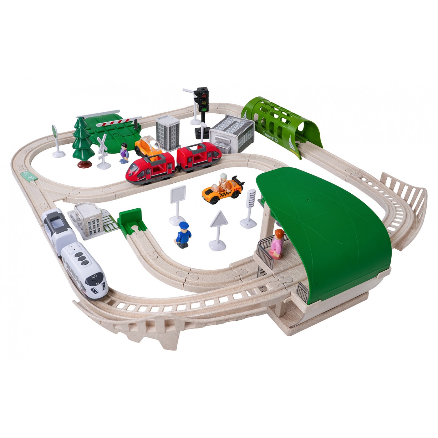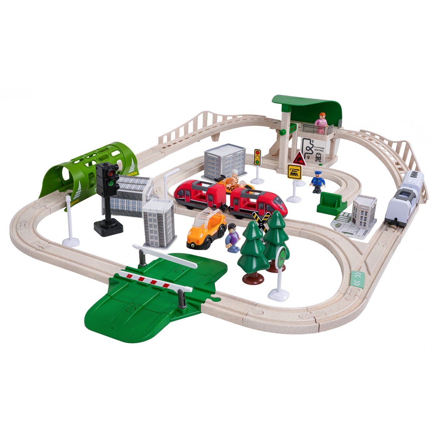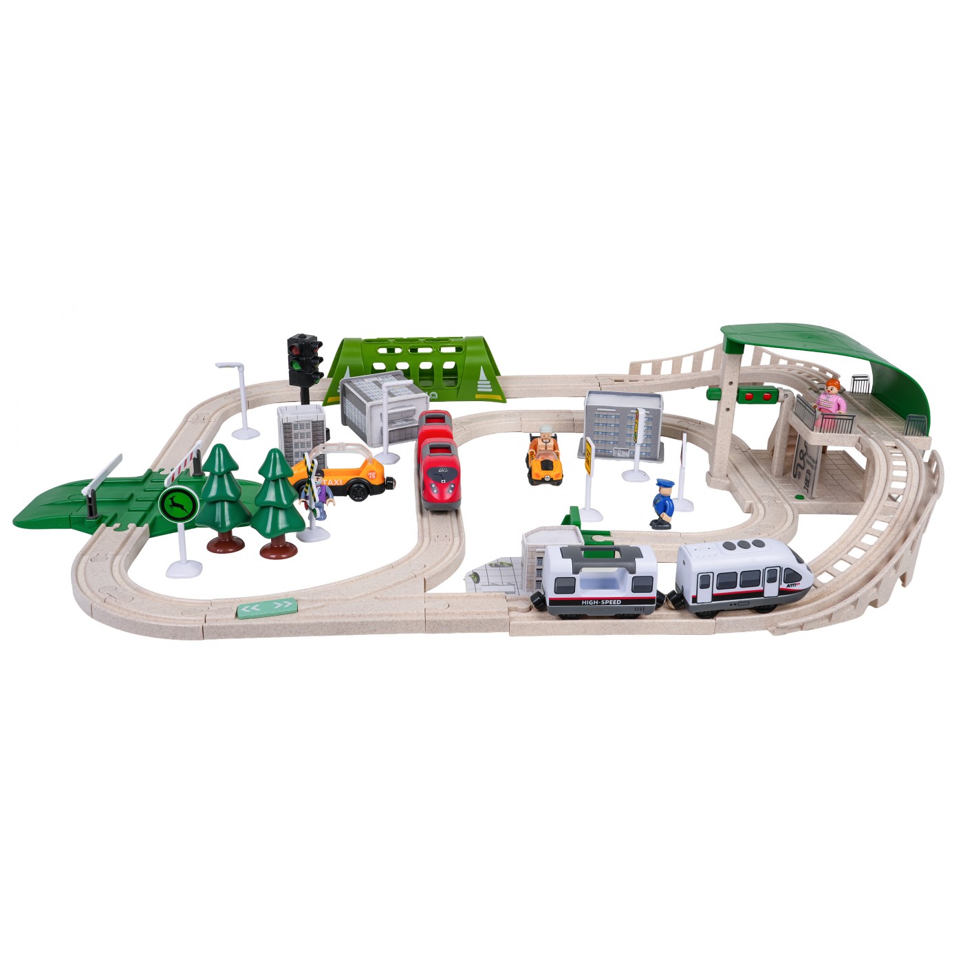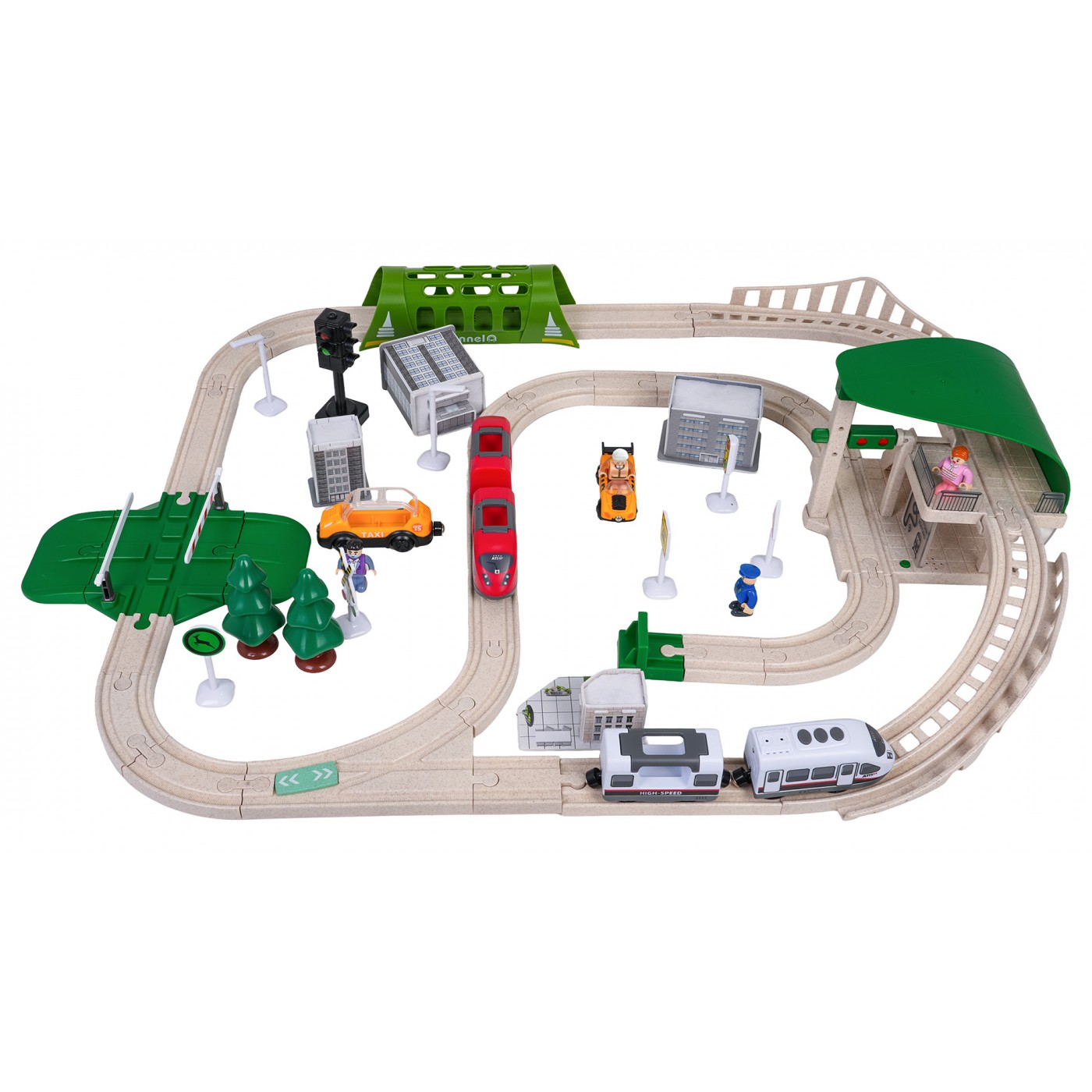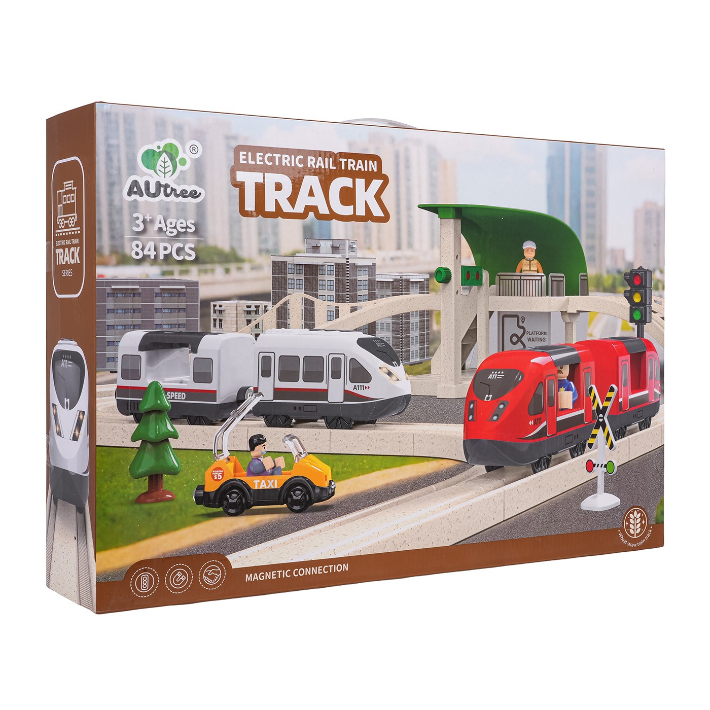 Interaktívna vláčikodráha pre deti od troch rokov. Sada je vyrobená z bezpečných a odolných materiálov, ktoré zaručujú spoľahlivosť a dlhú životnosť. Sada obsahuje koľaje pre dva vlaky, budovu stanice, tunel a železničnú závoru. Obsahuje tiež dve vozidlá, mestské budovy, dopravné značky a figúrky. Táto sada ponúka veľa príležitostí na kreatívnu hru. Tunel je napájaný 3 batériami AG13 (súčasťou balenia). Prechádzajúci vlak aktivuje zvuky vlaku a farebné blikajúce svetlá. Vlaková stanica je napájaná 3 batériami AG3 (súčasťou balenia), má podsvietenie a vydáva zvuky vlaku. Semafory sú napájané 3 batériami AG3 (súčasťou balenia), vydávajú zvuky meniace svetlo a majú svetelné efekty. Biely vláčik je napájaný 2 batériami AAA 1,5 V (nie sú súčasťou balenia), pohybuje sa dopredu a dozadu, vydáva zvuky jazdy a má osvetlené svetlomety.