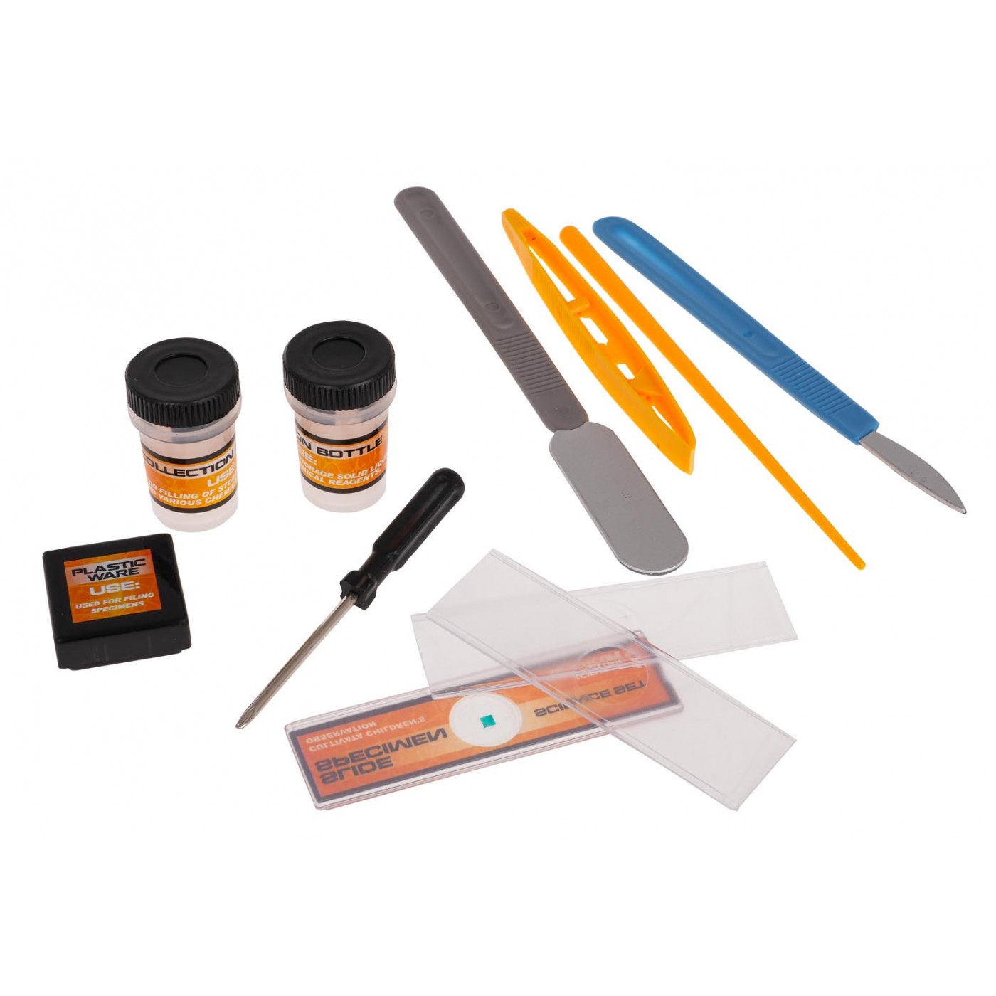 - mikroskop, - 2 skúmavky, - hotová príprava, - 2 sklíčka na prípravu, - pinzeta, - krabica, - nôž, - špíz, - špachtľa, - skrutkovač, - manuál. |