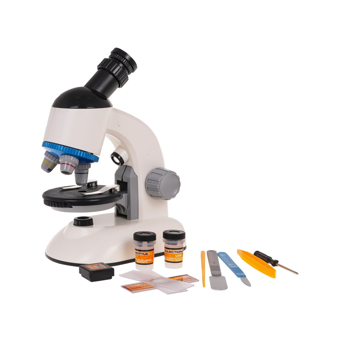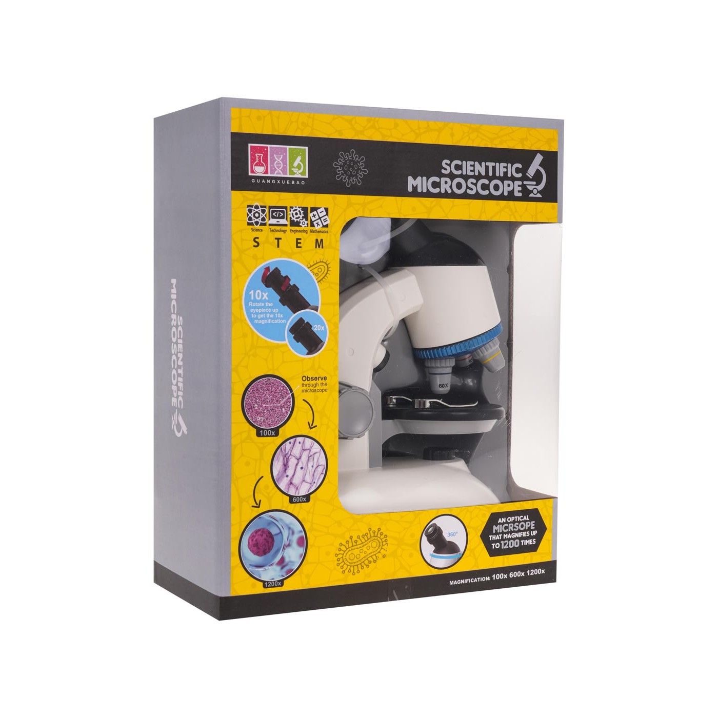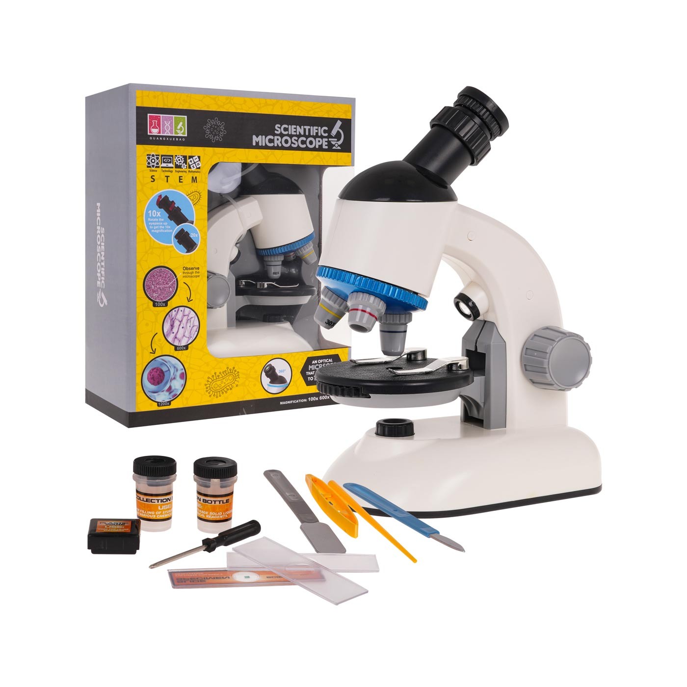 Mikroskop pre malého vedca od 6 rokov. Mikroskop je vyrobený z najkvalitnejších materiálov a umožňuje pozorovať objekty až s 1200-násobným zväčšením. Súčasťou súpravy mikroskopu je aj príslušenstvo ako skúmavky, hotový prípravok, 2 sklíčka na preparát, krabička na mikroorganizmy a pinzeta. Mikroskop je napájaný 2 x AA 1,5V batériami (nie sú súčasťou balenia).
