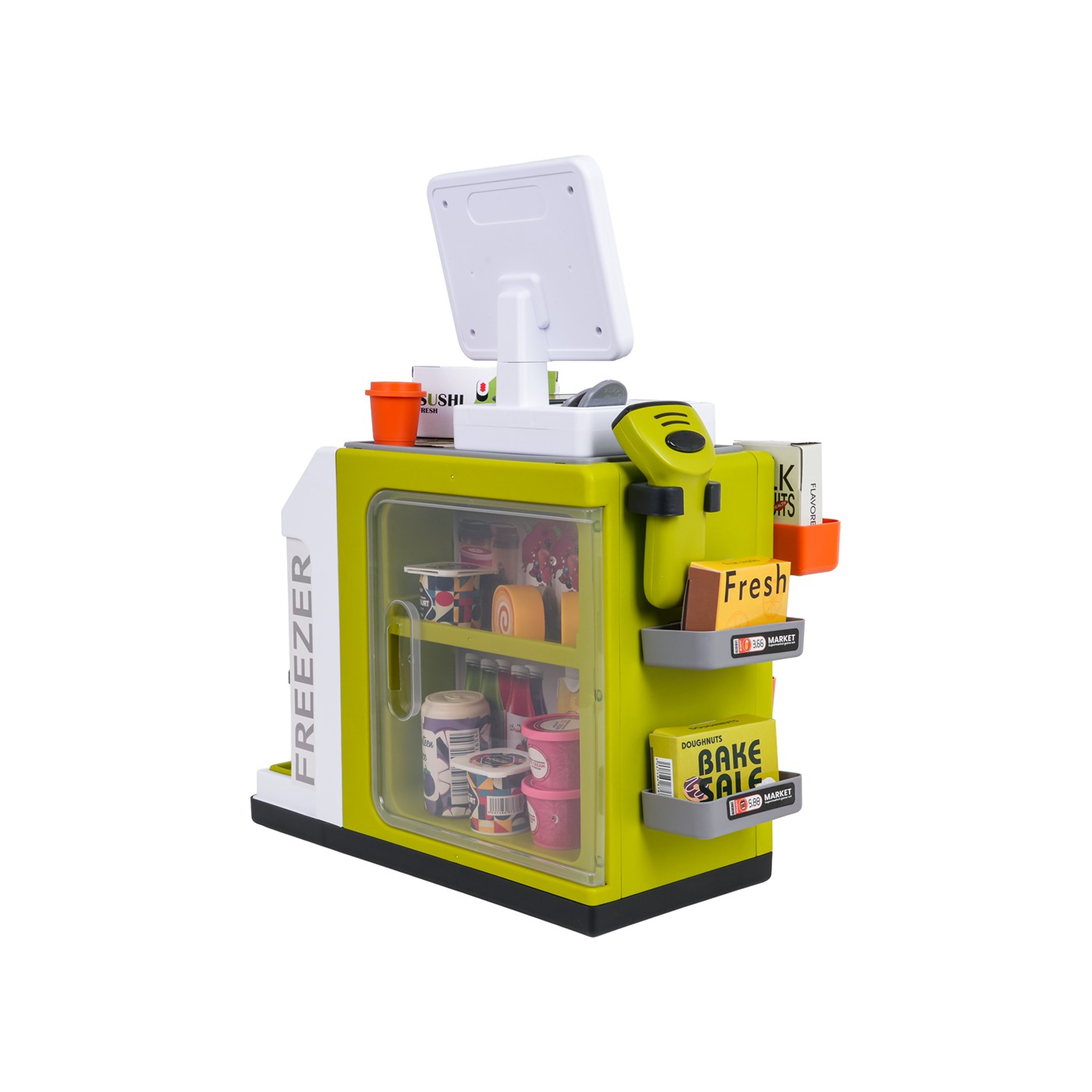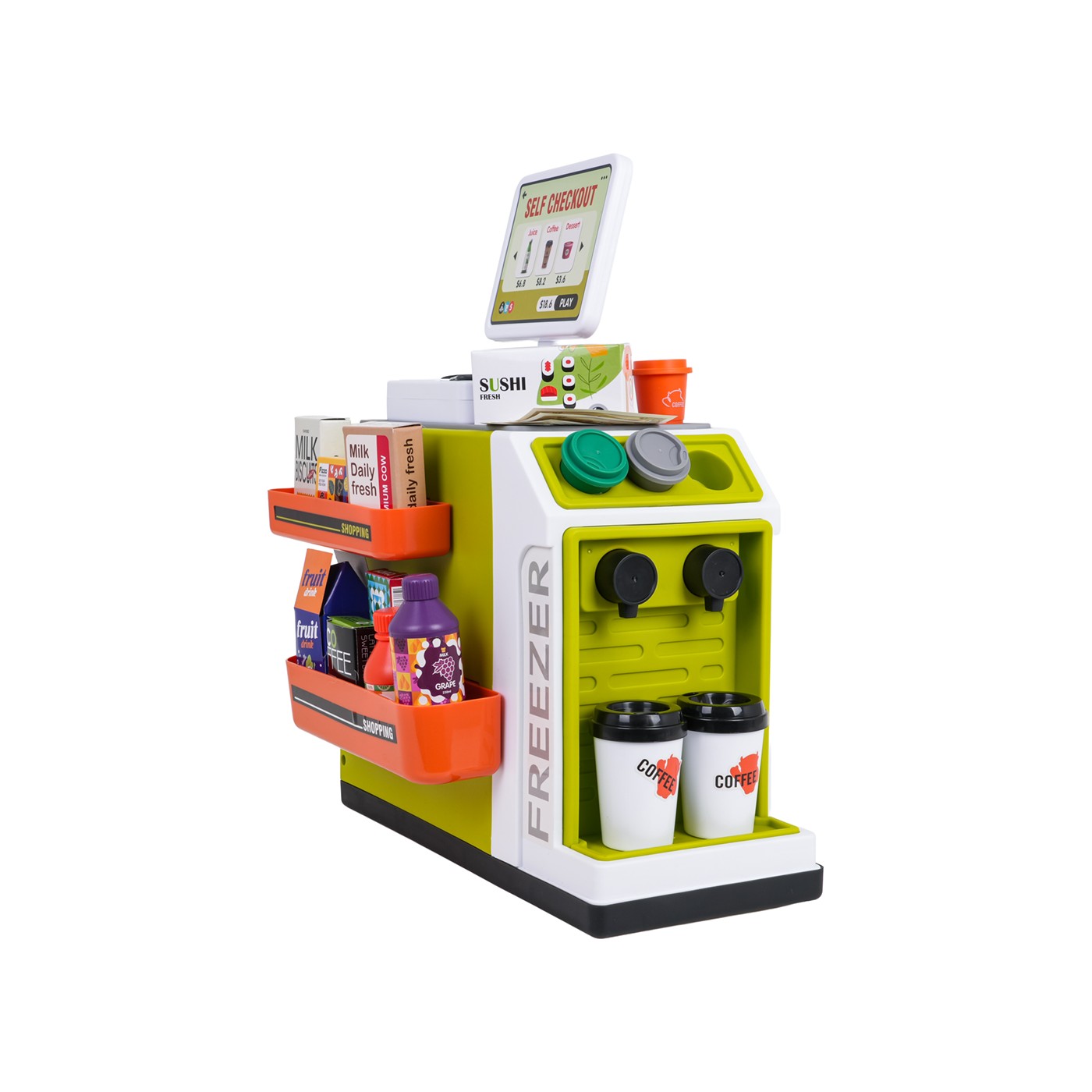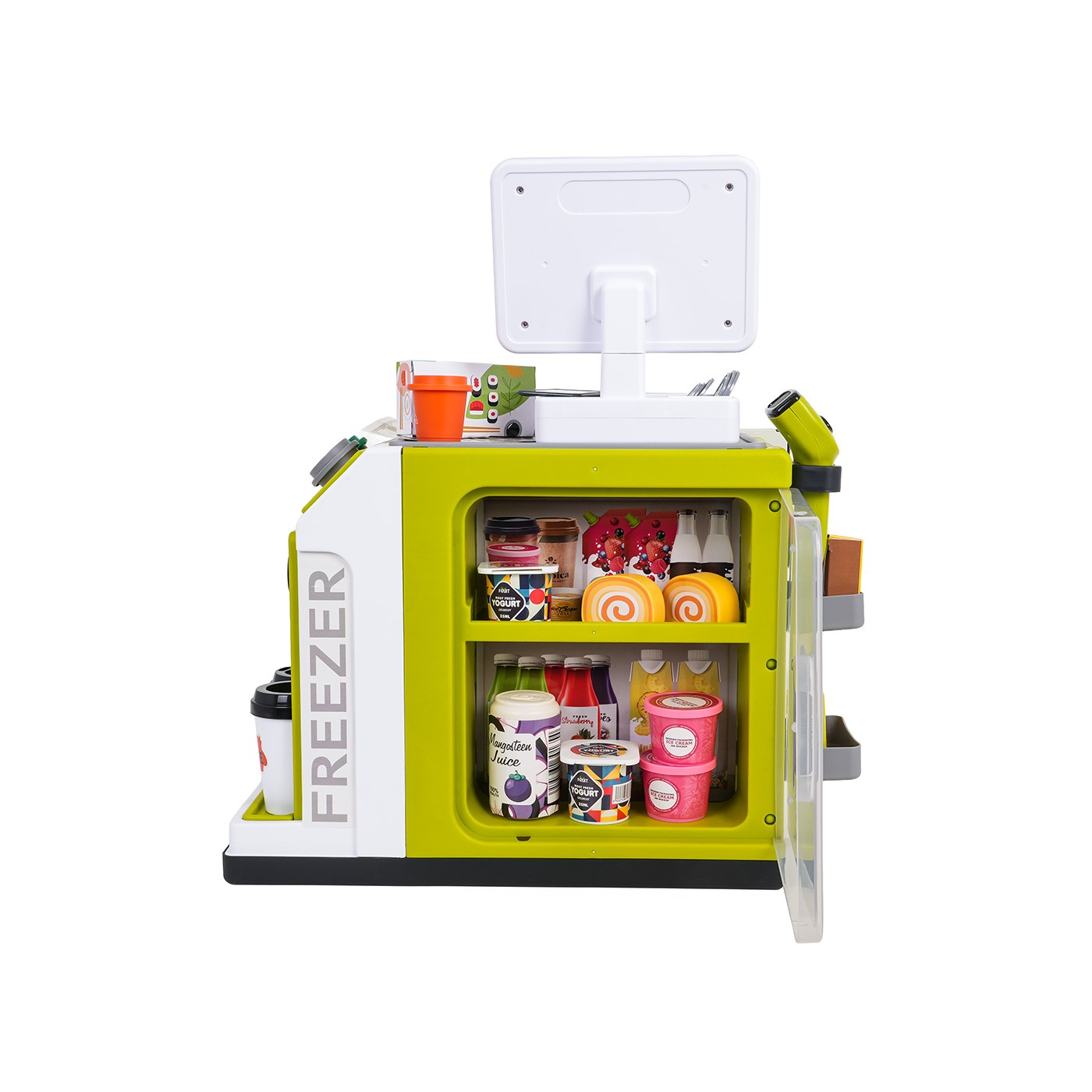 - konštrukčné prvky supermarketu, - skener, - pokladňa, - platobná karta, - hračkárske peniaze, 15 bankoviek a 6 mincí. - atrapy potravín: hroznová šťava vo fľaši a kartóne a pomarančový džús, 2 x nádoby na zmrzlinu, 2 x nádoby na jogurt, 2 x roláda, slivková šťava, 3 x kávové kapsuly, sushi, sušienky, pizza a iné kartóny s atrapami potravín, - 2 x hrnček na kávu. |