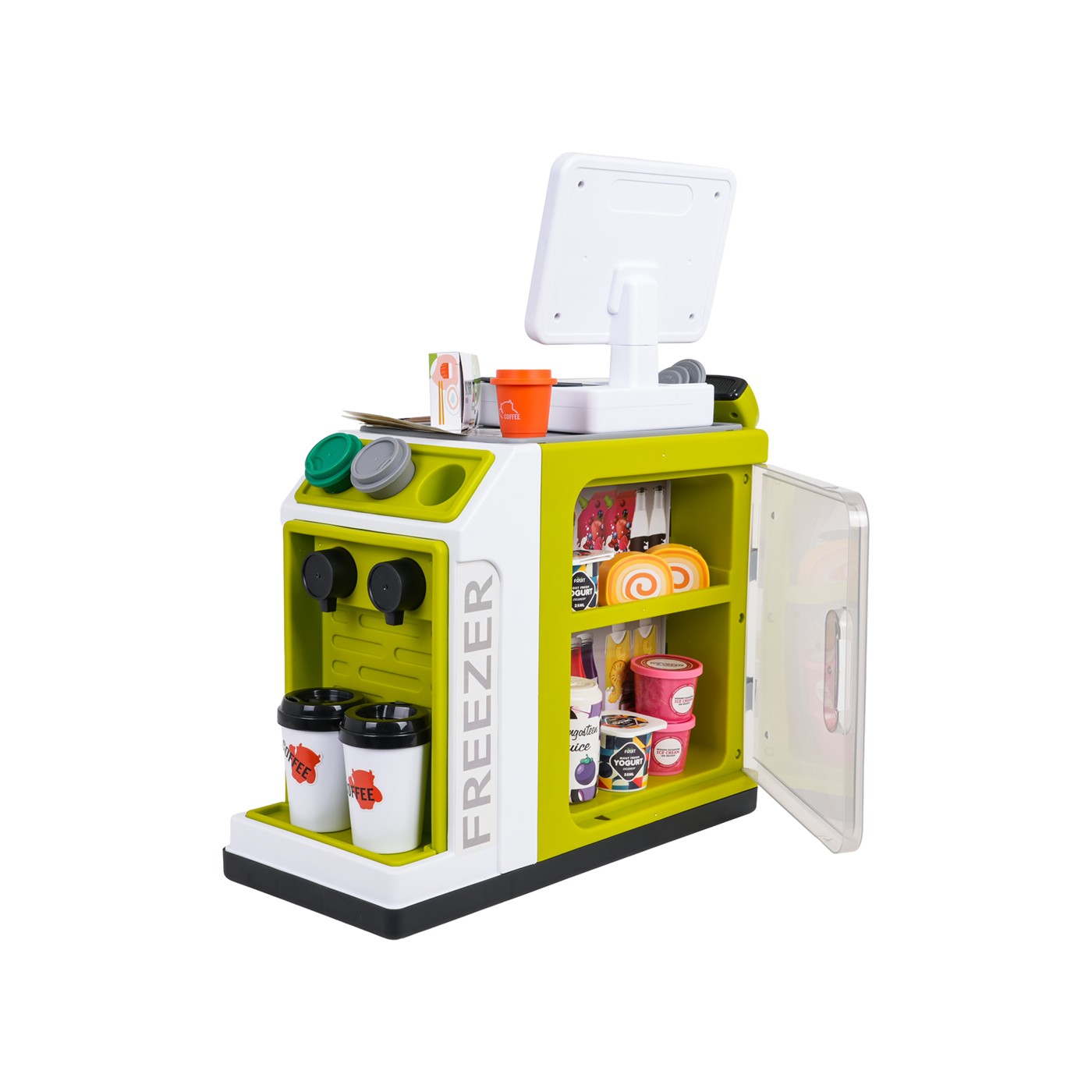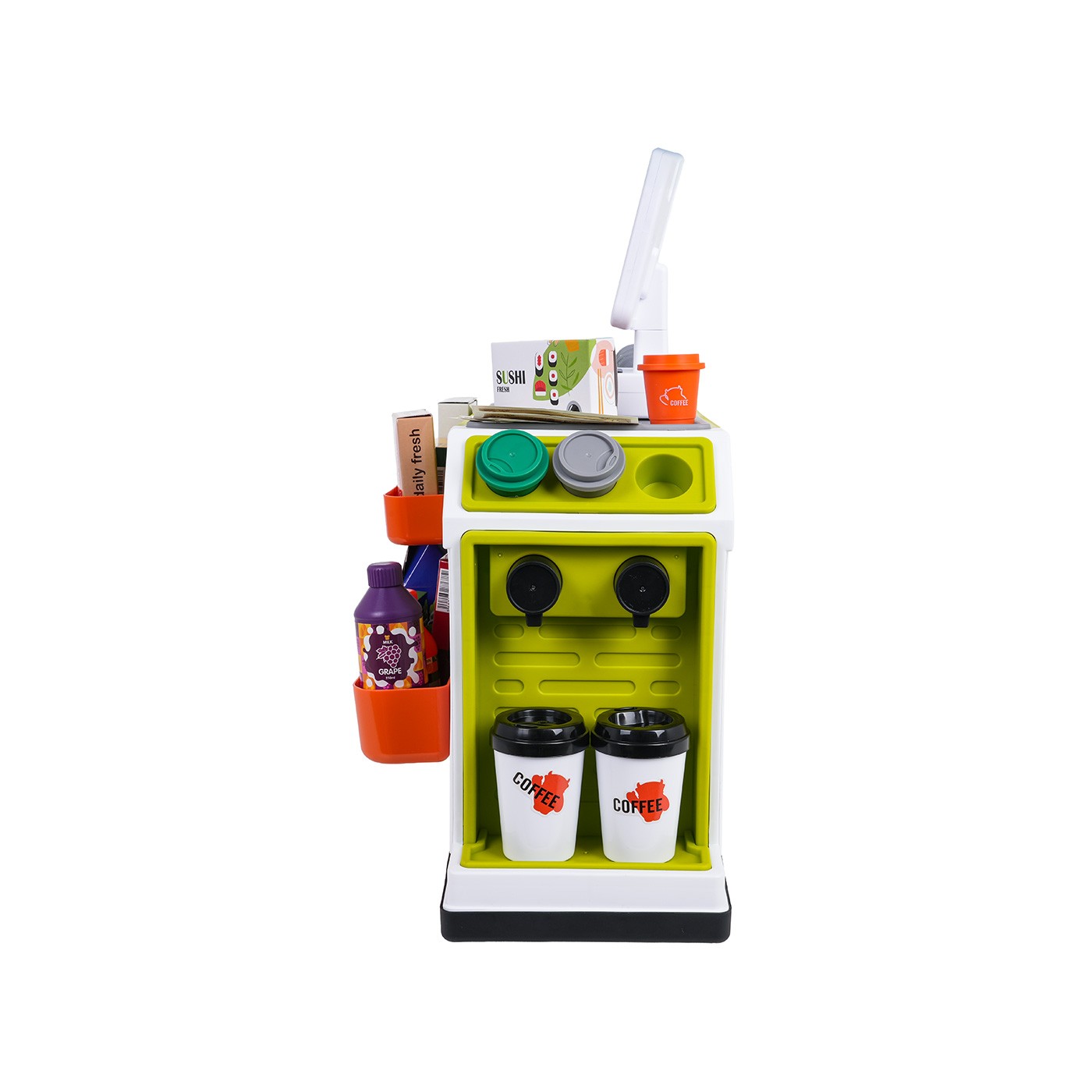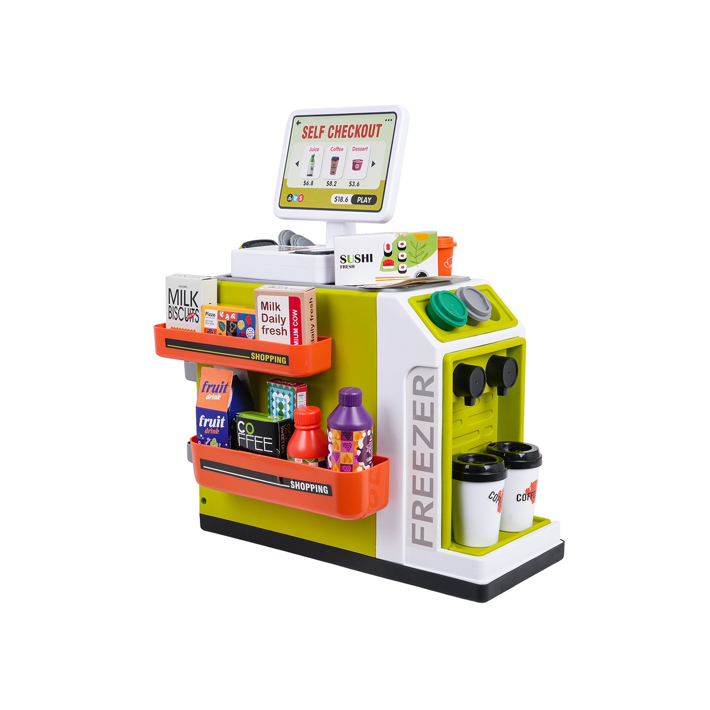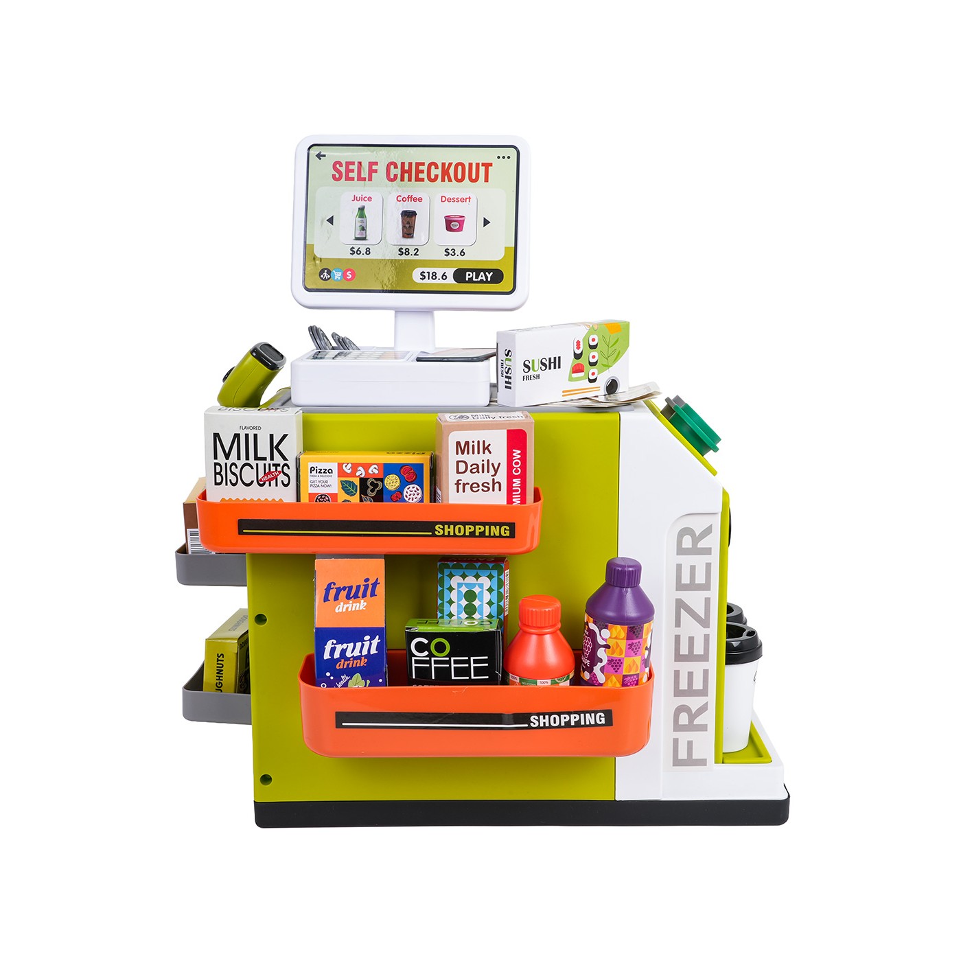 - konštrukčné prvky supermarketu, - skener, - pokladňa, - platobná karta, - hračkárske peniaze, 15 bankoviek a 6 mincí. - atrapy potravín: hroznová šťava vo fľaši a kartóne a pomarančový džús, 2 x nádoby na zmrzlinu, 2 x nádoby na jogurt, 2 x roláda, slivková šťava, 3 x kávové kapsuly, sushi, sušienky, pizza a iné kartóny s atrapami potravín, - 2 x hrnček na kávu. |