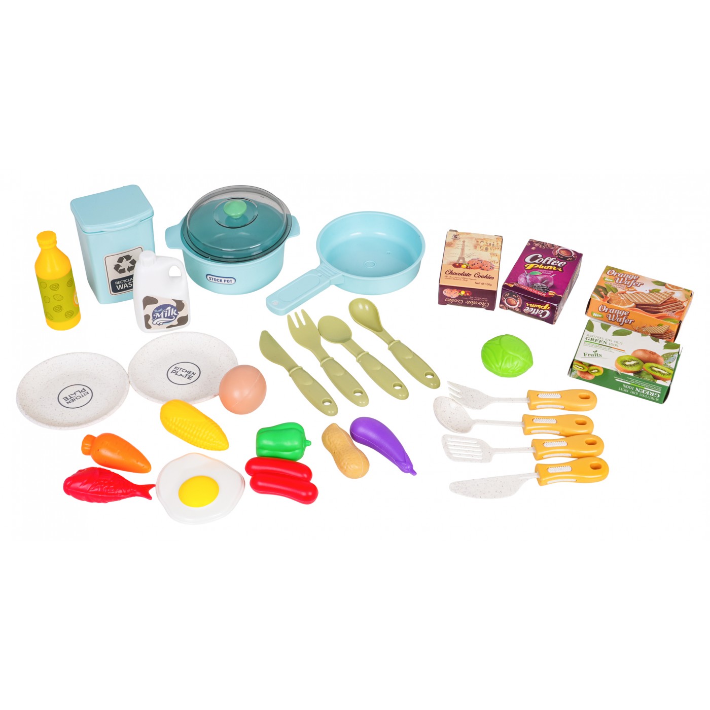 - kuchyňa - indukčný varič, - hrniec s pokrievkou, - panvica, - 2 x tanier, - mlieko, džús, - naberačka, nôž, špachtľa, vidlička, príbor, - odpadkový kôš, - napodobeniny jedla: volské oko, vajce natvrdo, ryba, šalát, paprika, klobásy, baklažán, kukurica, mrkva, arašidy, mlieko, džús, - 4 kartóny zmrzliny a sušienok, - ozdobné nálepky, - pokyny |
