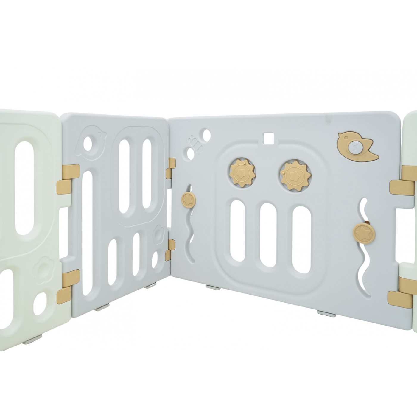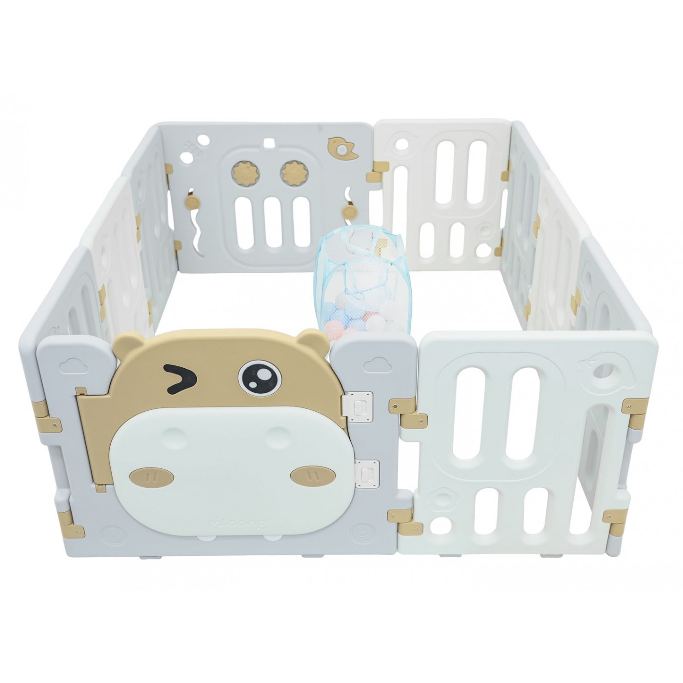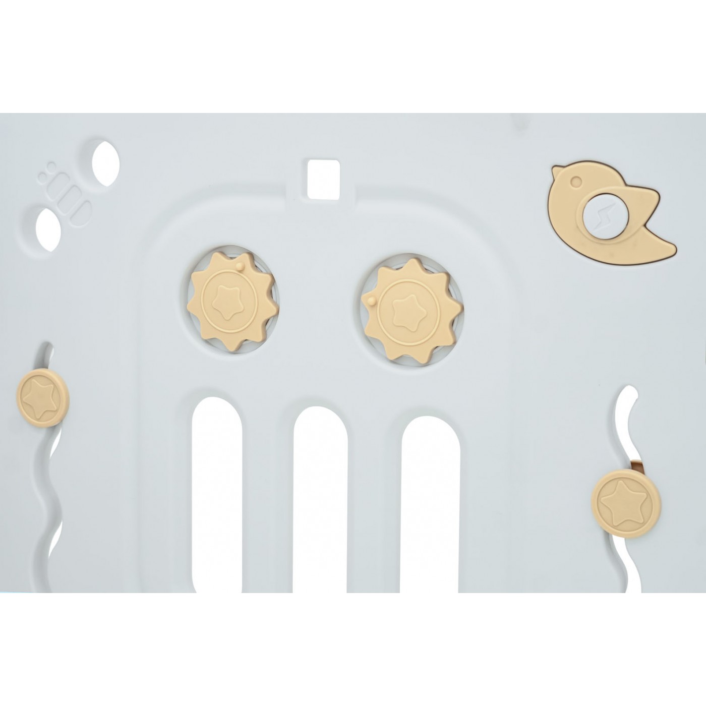Veľká, praktická, skladacia modulárna ohrádka pre deti od 6 mesiacov. Z ohrádky si môžeme vytvoriť ľubovoľnú konštrukciu podľa vlastných preferencií, veľmi ľahko sa montuje a rozoberá, je stabilná a má hladké hrany. Interiér ohrádky je vybavený manipulačnými prvkami, ako sú posuvné koliesko, ozubené kolesá, píšťalka a volant. Sada je vyrobená z odolných a netoxických materiálov a pozostáva z 10 panelov. Panel dverí sa zaistí smerom von, čím sa zabráni dieťaťu v otvorení dverí. Protišmykové nožičky zabraňujú kĺzaniu detskej ohrádky. V ohrádke bude mať vaše dieťa dostatok priestoru na voľný pohyb a zároveň bude v bezpečí. Sada obsahuje aj loptičkovú košík a 40 loptičiek.