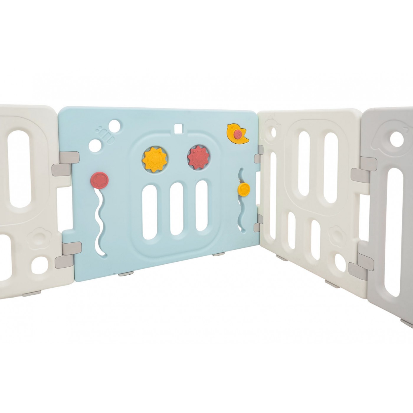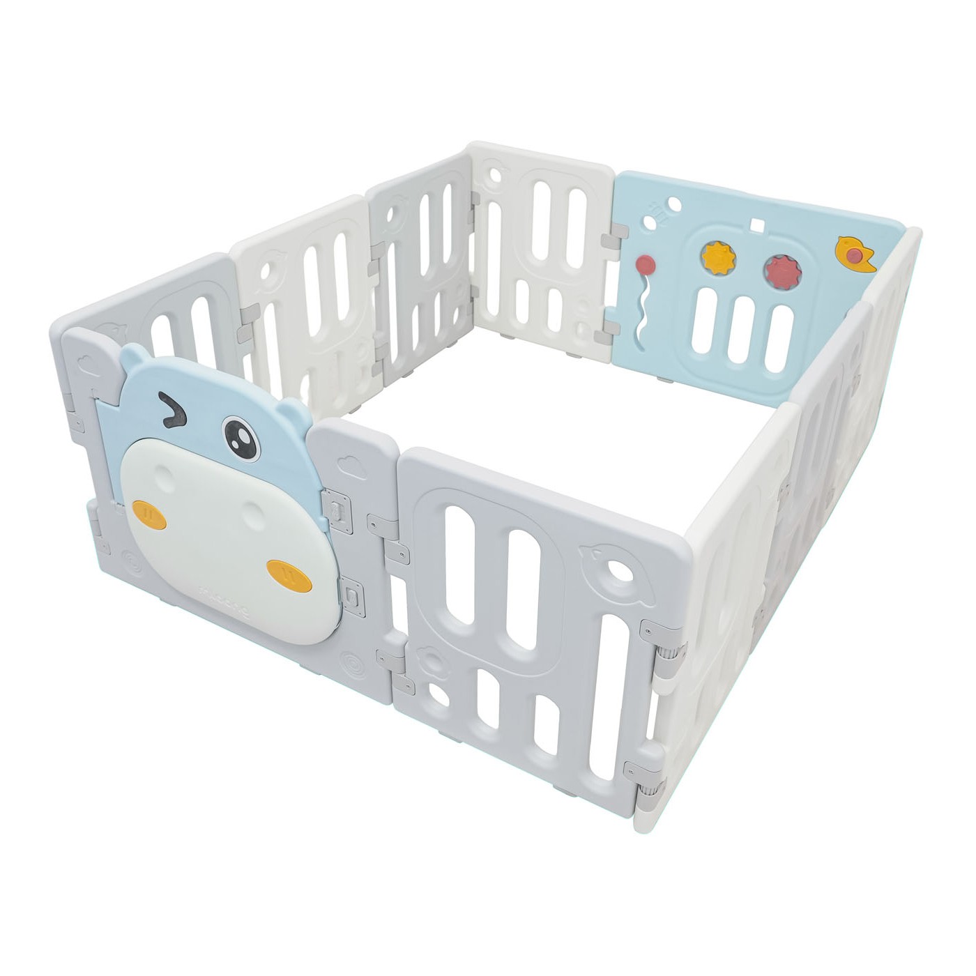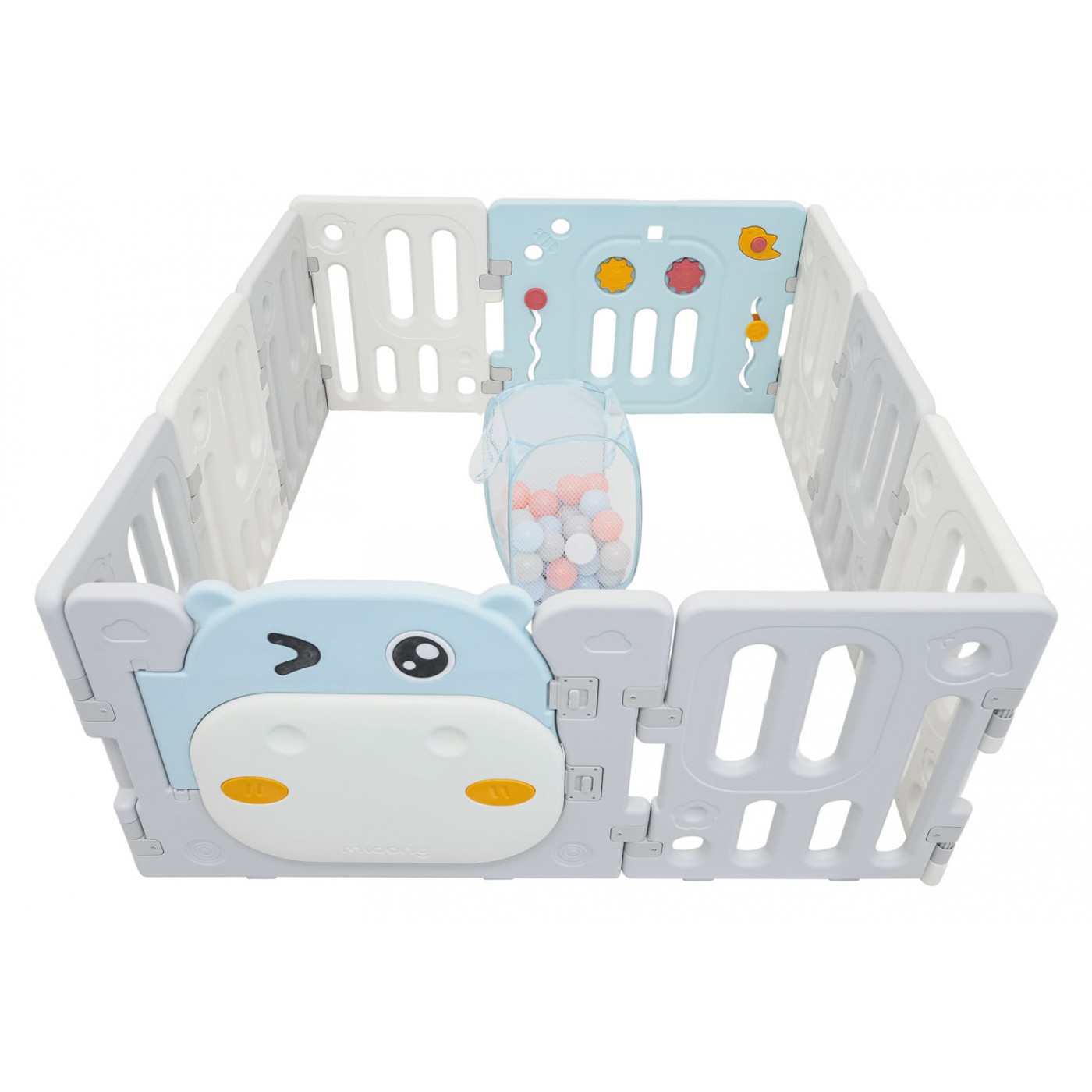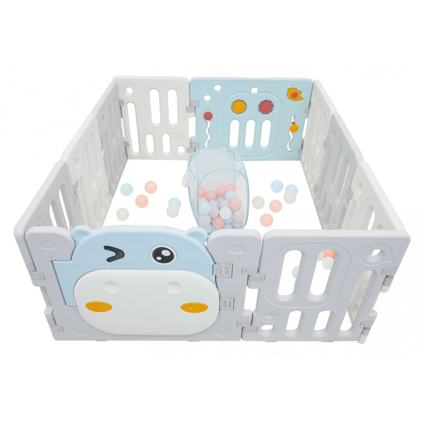 Veľká, praktická, skladacia modulárna ohrádka pre deti od 6 mesiacov. Z ohrádky si môžeme vytvoriť ľubovoľnú konštrukciu podľa vlastných preferencií, veľmi ľahko sa montuje a rozoberá, je stabilná a má hladké hrany. Interiér ohrádky je vybavený manipulačnými prvkami, ako sú posuvné koliesko, ozubené kolesá, píšťalka a volant. Sada je vyrobená z odolných a netoxických materiálov a pozostáva z 10 panelov. Panel dverí sa zaistí smerom von, čím sa zabráni dieťaťu v otvorení dverí. Protišmykové nožičky zabraňujú kĺzaniu detskej ohrádky. V ohrádke bude mať vaše dieťa dostatok priestoru na voľný pohyb a zároveň bude v bezpečí. Sada obsahuje aj loptičkovú košík a 40 loptičiek.