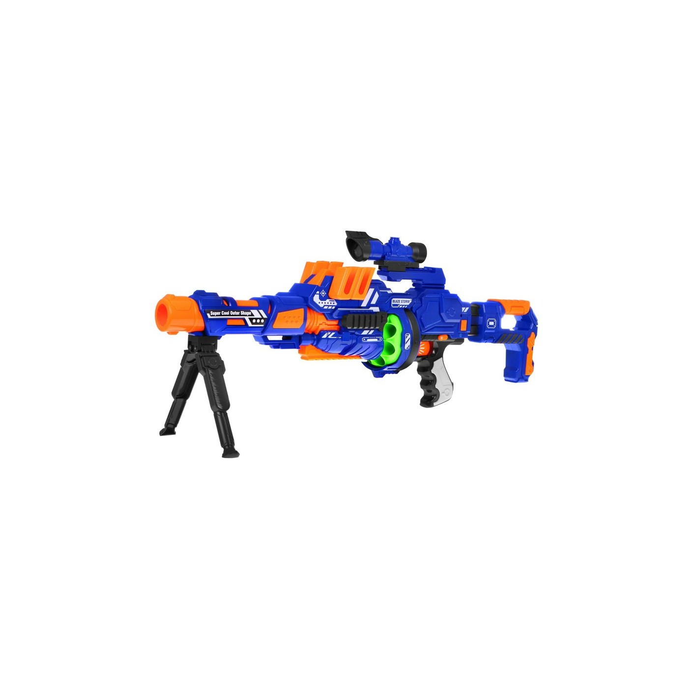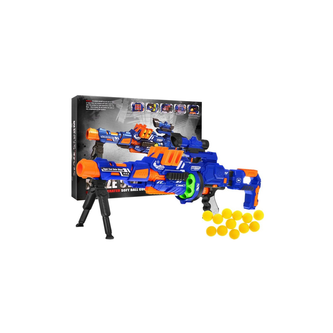 | | - typ: bębenkowy, półautomat elektryczny, - typ ładowania: magazynek, - mechanizm spustowy: pojedyncze strzały (naciśnięcie spustu -wyrzut 1 pocisku lub wyrzut serii pocisków), - pojemność magazynku: 8 kulek, - dodatkowe magazynki po obu stronach lufy, - elektroniczna blokada wystrzału w momencie zaklinowania pocisku w lufie, - pociski: piankowe kulki/piłeczki (w pełni bezpieczne), - celownik, - stabilizator, - możliwość przedłużenia lufy, - zasięg: ok 10 metrów |