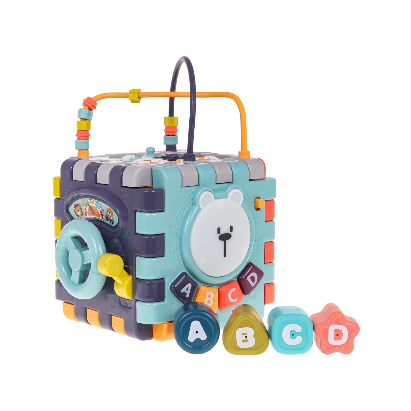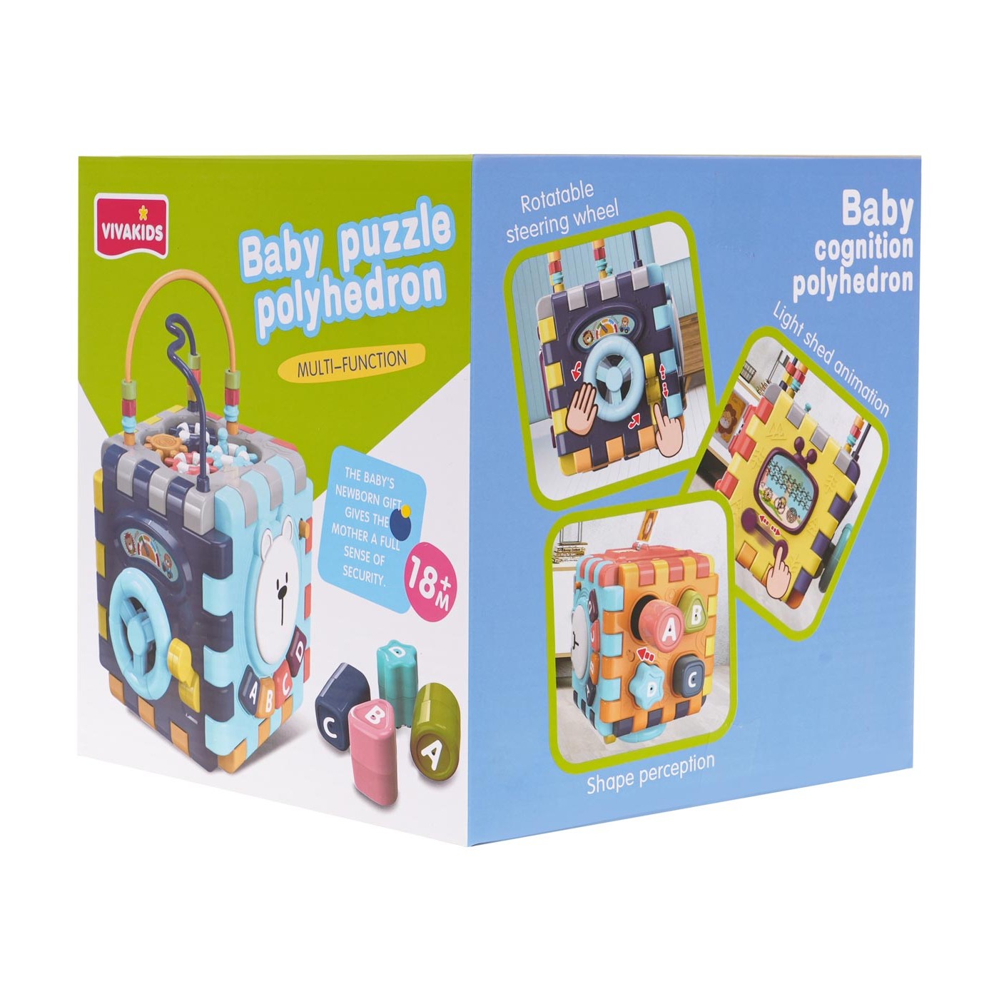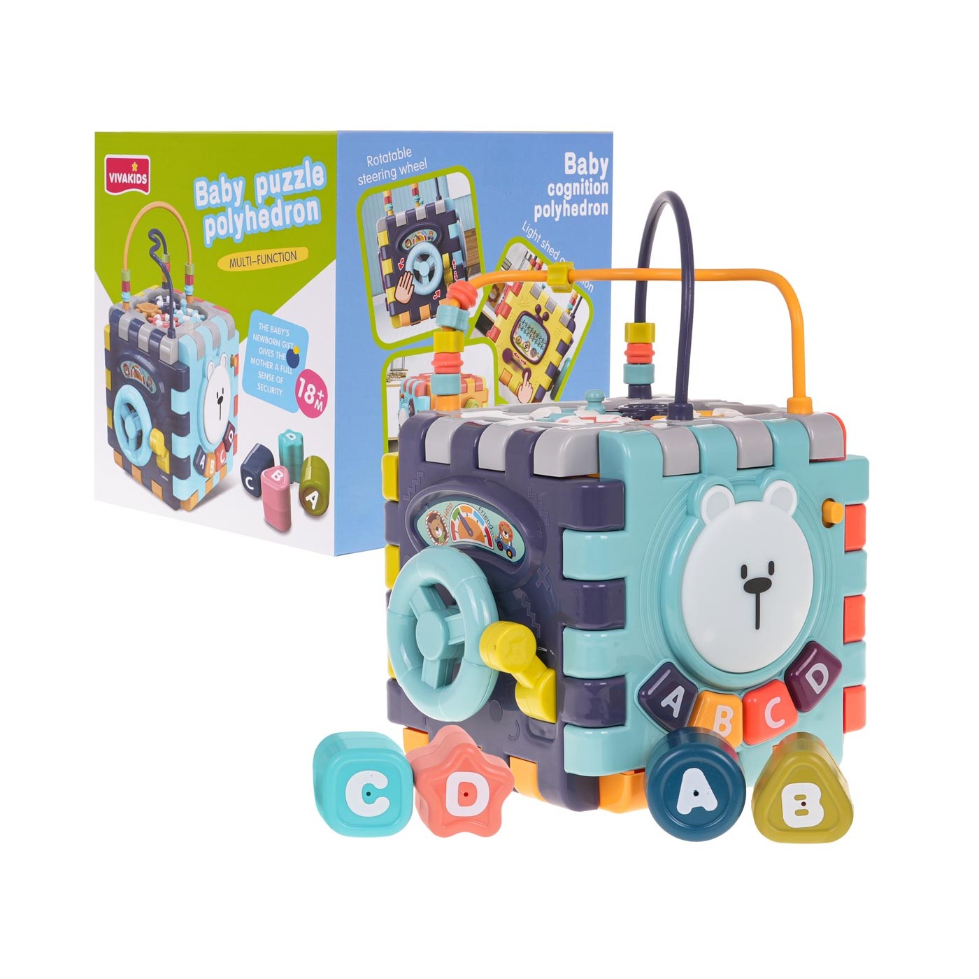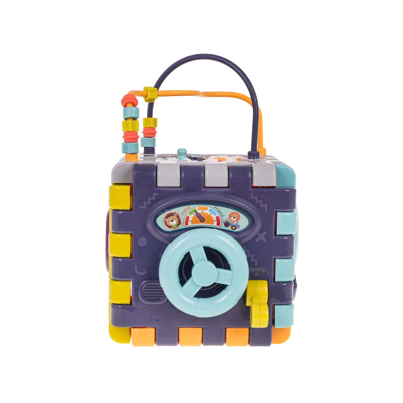 Multifunkčná interaktívna kocka so zvukovými a svetelnými efektmi pre deti od 18 mesiacov. Každá stena boxu poskytne vášmu dieťaťu veľa zábavy a interaktívnej hry. Zvukové a svetelné efekty a množstvo farieb upútajú pozornosť vášho dieťatka a povzbudia ho k hre. Kocku môžeme rozložiť a hrať sa s jednotlivými prvkami naplocho. Hračka je napájaná 3 x AAA 1,5 V batériami (nie sú súčasťou balenia).