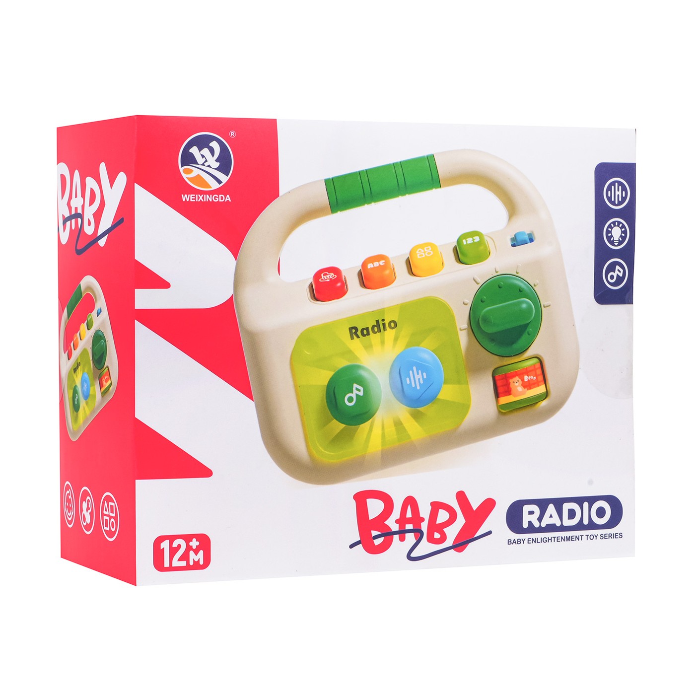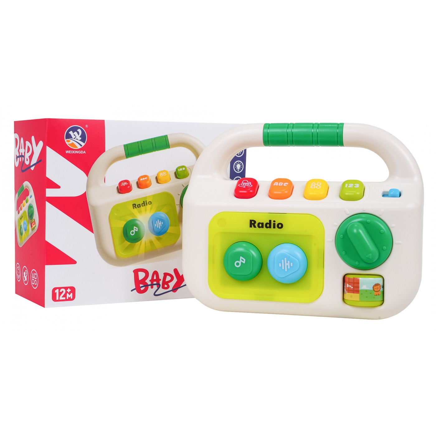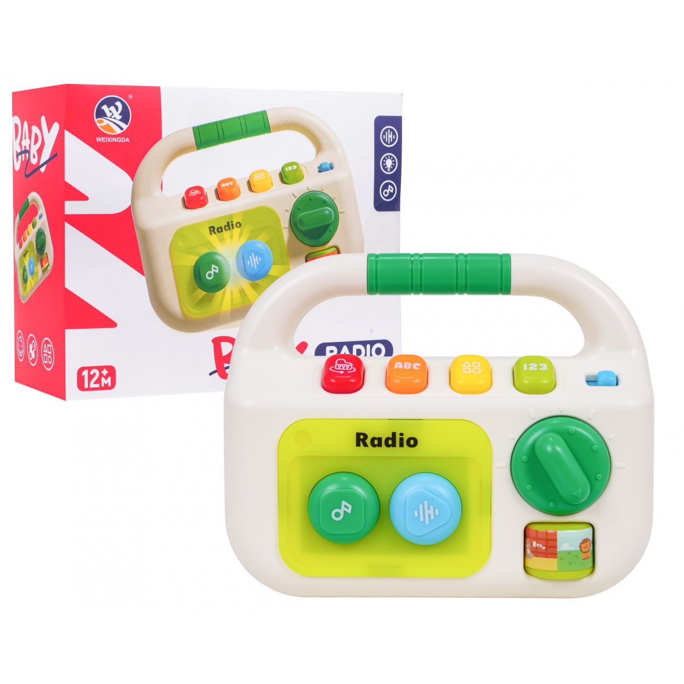Interaktívne rádio pre bábätká od dvanástich mesiacov. Vyrobené z netoxického plastu, nemá ostré hrany a rukoväť je ideálna na nosenie a uchopenie. Zvukové a svetelné efekty a sýte farby priťahujú pozornosť dieťaťa a stimulujú na mnohých úrovniach. Na prednej strane hračky sa nachádzajú dve veľké tlačidlá: zelené a modré, valček a gombík. Stlačením zeleného tlačidla sa prehrajú tri rôzne skladby a stlačením modrého tlačidla sa prehrajú štyri upokojujúce melódie. Valček a gombík slúžia na manipuláciu. Na vrchu hračky sa nachádza vypínač a ovládanie hlasitosti. Pod rukoväťou sú štyri tlačidlá: červené pre zvuky nástrojov ako klavír, bubon alebo husle, oranžové pre písmená a zvuky, žlté pre tvary a zelené pre čísla od 1 do 20. Táto hračka je ideálnym darčekom. Vaše dieťatko si ju môže vziať kamkoľvek. Rádio je napájané 3 batériami typu AAA (nie sú súčasťou balenia).