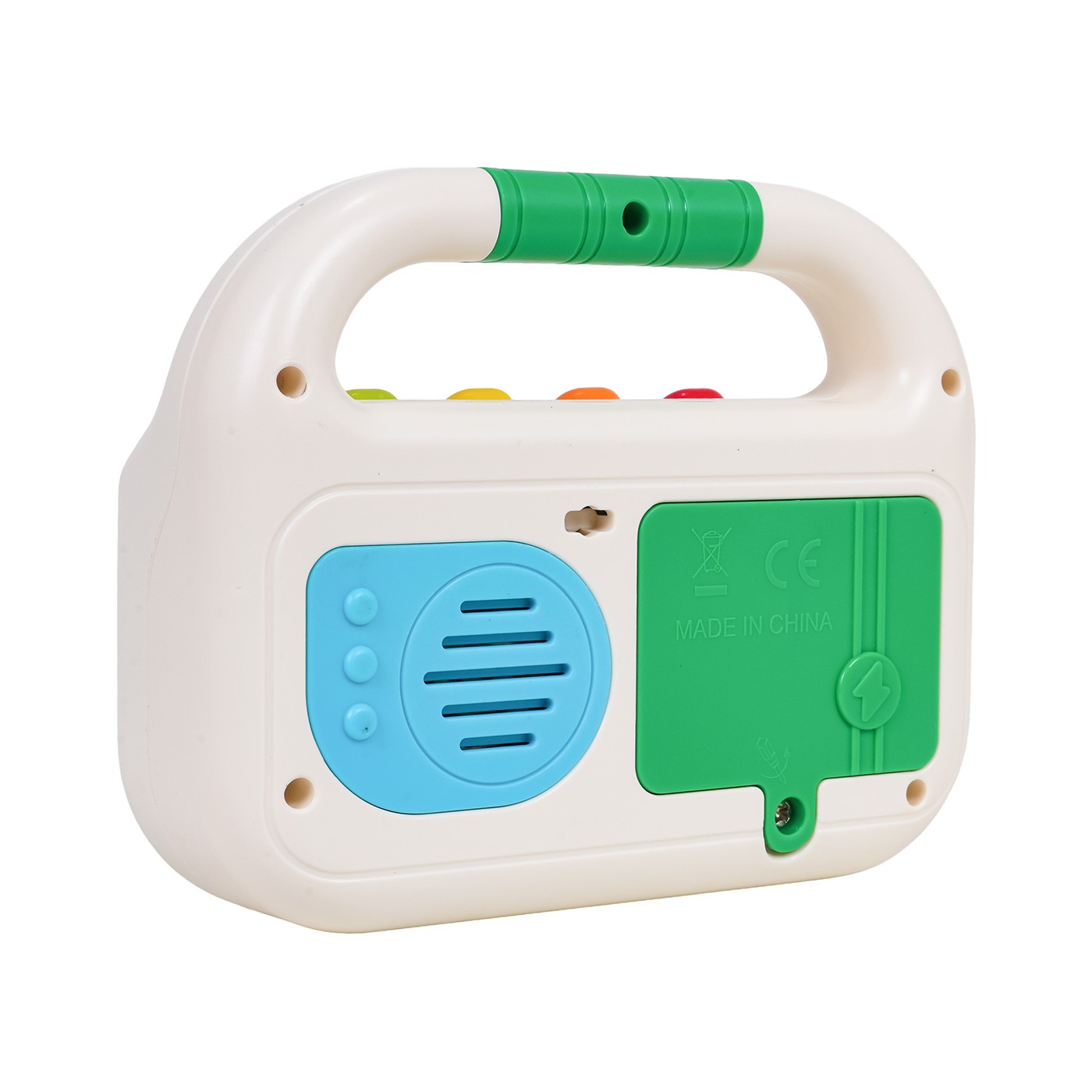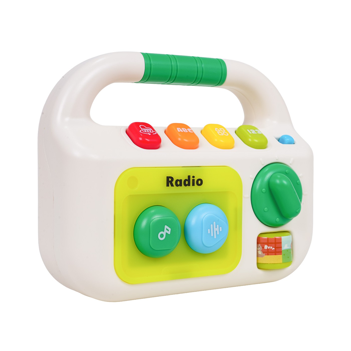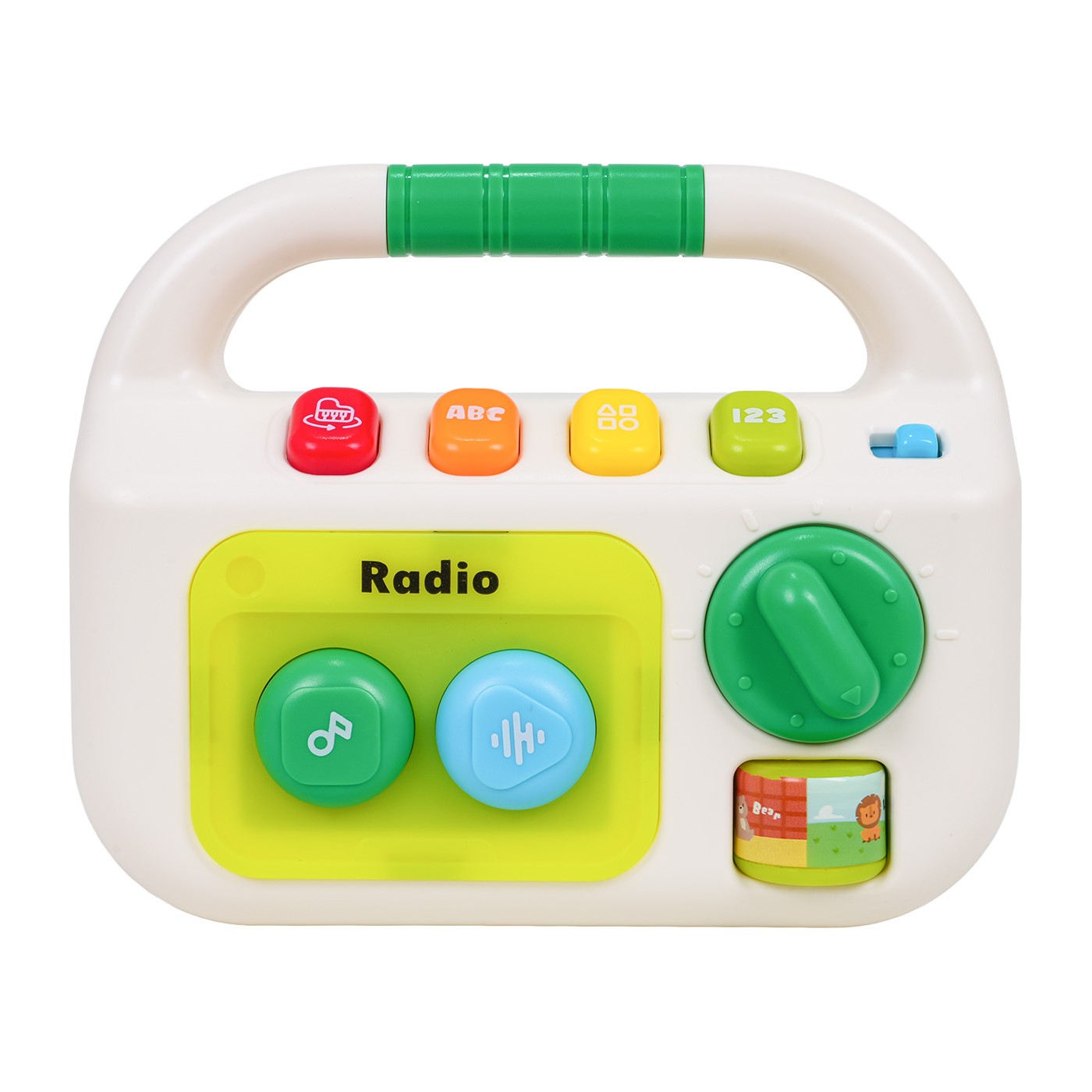Interaktívne rádio pre bábätká od dvanástich mesiacov. Vyrobené z netoxického plastu, nemá ostré hrany a rukoväť je ideálna na nosenie a uchopenie. Zvukové a svetelné efekty a sýte farby priťahujú pozornosť dieťaťa a stimulujú na mnohých úrovniach. Na prednej strane hračky sa nachádzajú dve veľké tlačidlá: zelené a modré, valček a gombík. Stlačením zeleného tlačidla sa prehrajú tri rôzne skladby a stlačením modrého tlačidla sa prehrajú štyri upokojujúce melódie. Valček a gombík slúžia na manipuláciu. Na vrchu hračky sa nachádza vypínač a ovládanie hlasitosti. Pod rukoväťou sú štyri tlačidlá: červené pre zvuky nástrojov ako klavír, bubon alebo husle, oranžové pre písmená a zvuky, žlté pre tvary a zelené pre čísla od 1 do 20. Táto hračka je ideálnym darčekom. Vaše dieťatko si ju môže vziať kamkoľvek. Rádio je napájané 3 batériami typu AAA (nie sú súčasťou balenia).