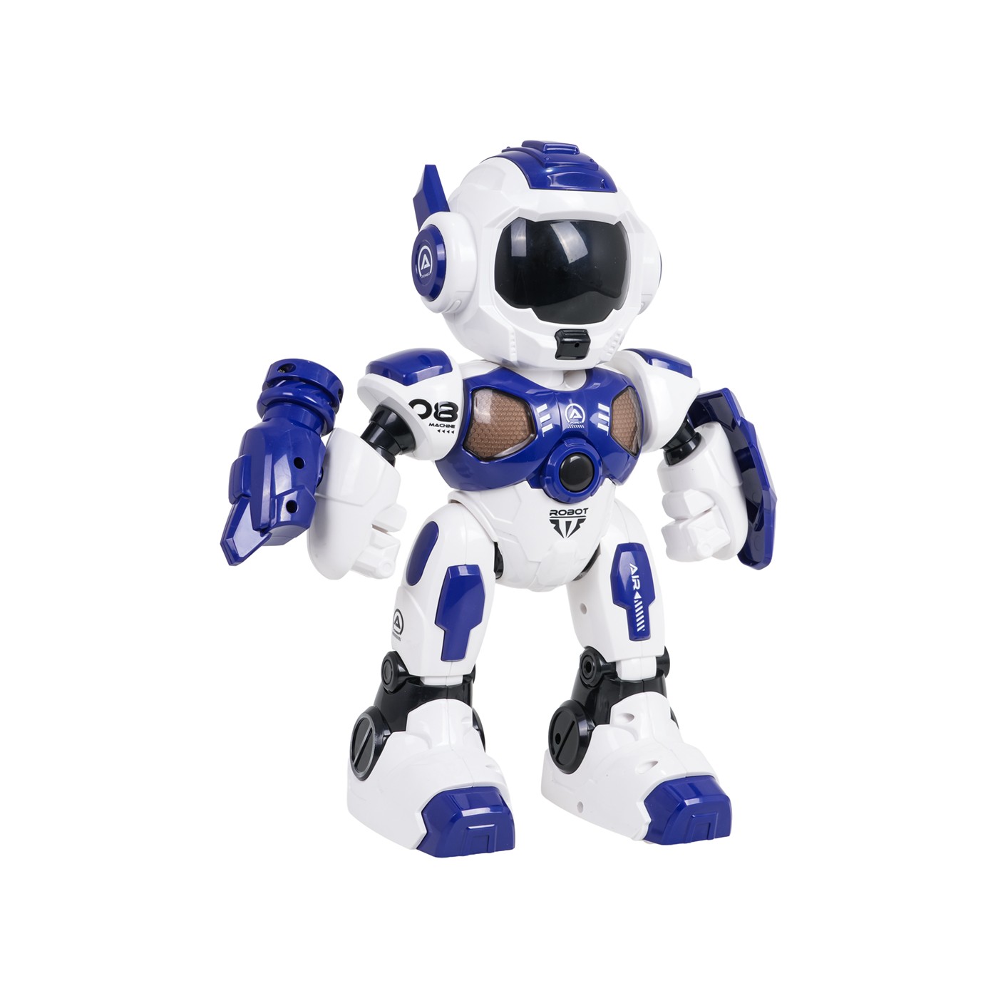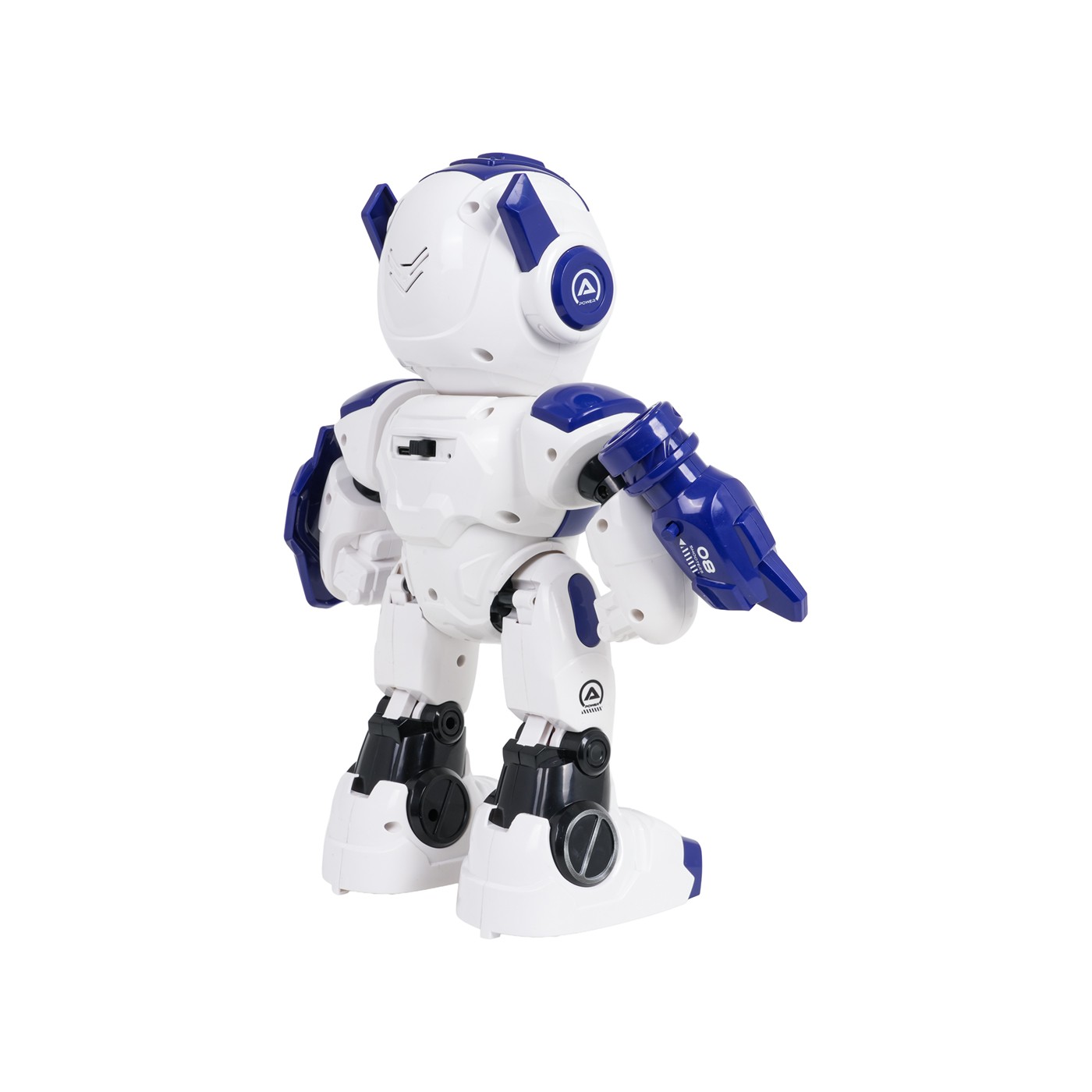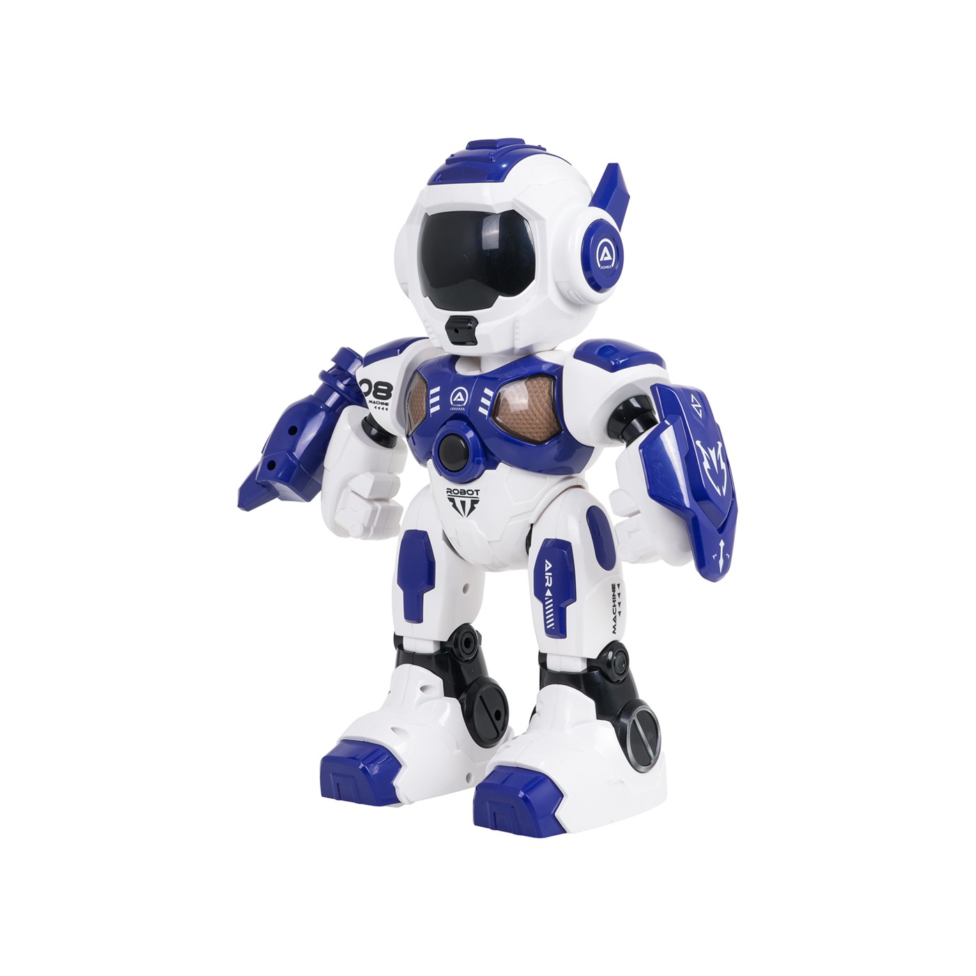 Interaktívny multifunkčný robot A08 s funkciou streľby je vhodný pre deti od ôsmich rokov. Robot je vyrobený z kvalitného plastu, má svietiace oči a tlačidlo na bruchu, pohybuje sa dopredu a dozadu, otáča sa doľava a doprava, hýbe rukami, tancuje a hrá melódie a príbehy. Sada obsahuje ďalšie príslušenstvo na ruky: štít a prísavný vrhač šípok. Manuálne streľba je možná stlačením tlačidla. Robot je napájaný 3,7V nabíjateľnou batériou (súčasťou balenia) a diaľkové ovládanie používa 2 x AA 1,5V batérie (nie sú súčasťou balenia).