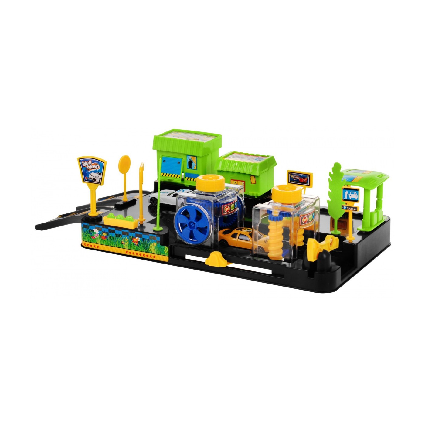 | - 2 samochody w różnych kolorach, - duża podstawa, - znaki drogowe, - ruchoma taśma do przesuwania pojazdu podczas mycia, - komora myjni z obrotowymi szczotkami, - komora myjni z funkcją osuszania pojazdu, - ruchomy szlaban, - 2 podjazdy, - elementy dekoracyjne (drzewka, klomby, market/restauracja, stacja benzynowa). | |