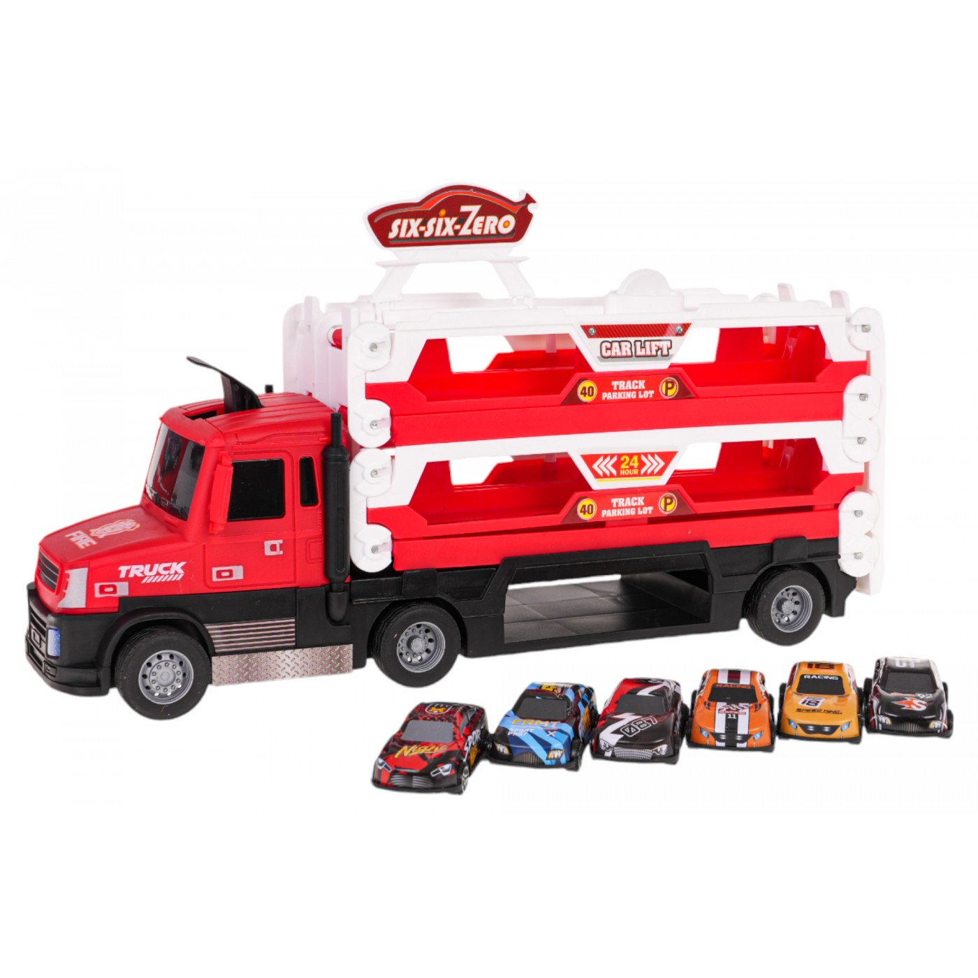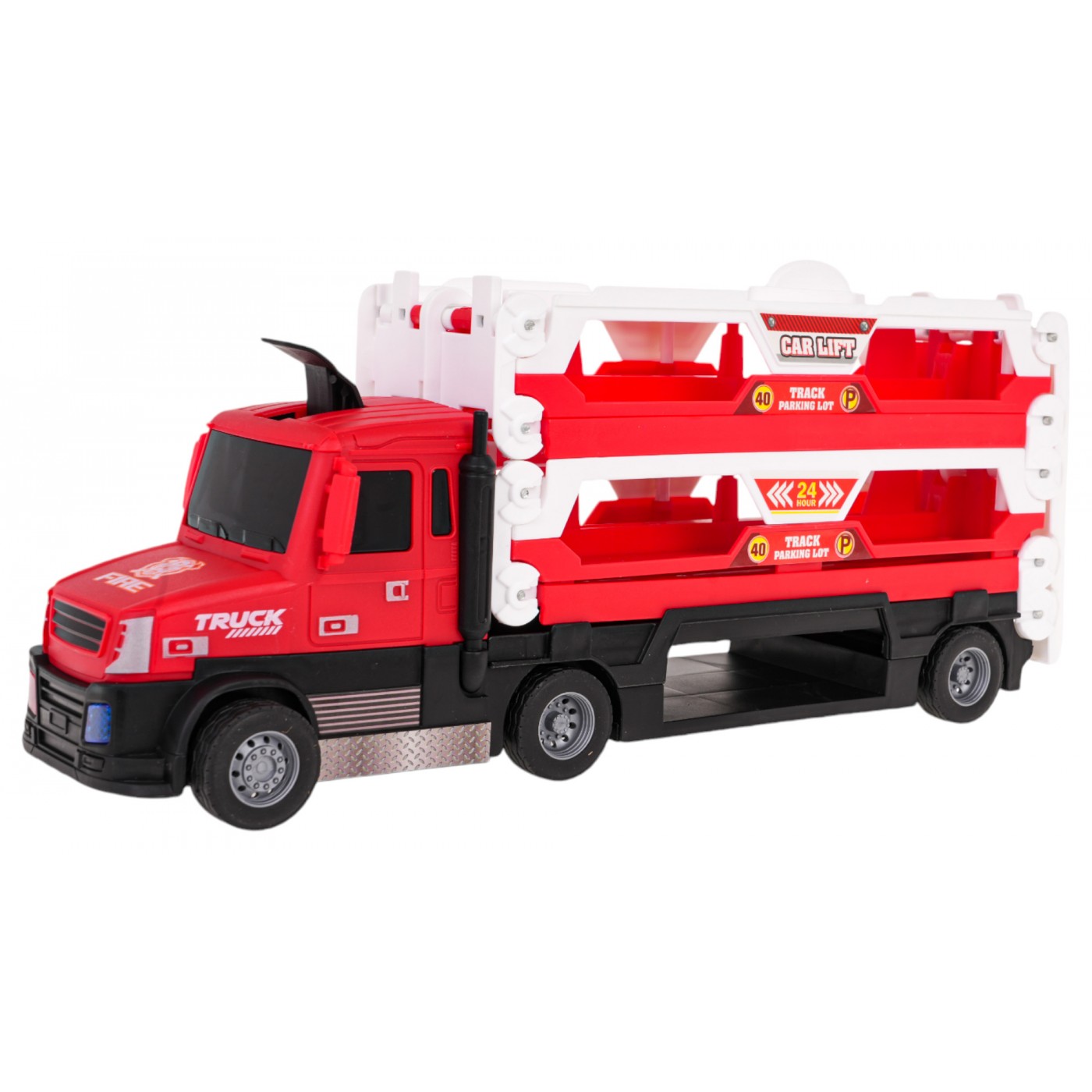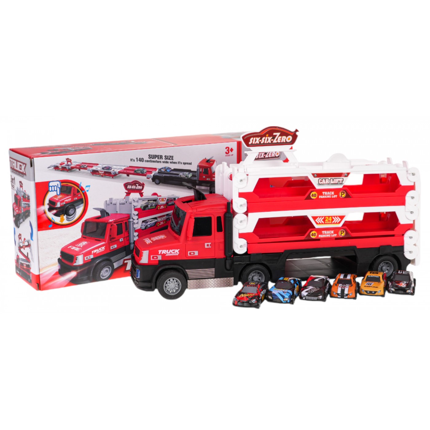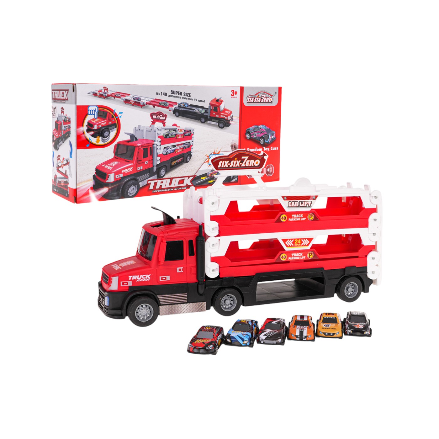 Interaktívny, trojposchodový kamión s katapultom pre deti od 3 rokov. Vozík má kolesá s gumenými pneumatikami, vďaka ktorým dokonale priľne k zemi. Hračka má tri úrovne, na ktoré môžete uložiť veľké množstvo pružín (súprava obsahuje šesť autíčok s kovovým telom). Po rozložení levelov vznikne veľká dráha pre autá dlhá až 140 cm. Nákladné auto má katapult pre vozidlá, stačí umiestniť vozidlo na najnižšiu úroveň a stlačiť páku na streche nákladiaku. Auto vystrelí dopredu a rozbehne sa po skladacej dráhe. Hračka je napájaná 2 x AA 1,5V batériami (nie sú súčasťou balenia). Po stlačení prednej časti vozíka sa spustia zvukové efekty vrátane zvuku motora a brzdenia, ako aj svetelné efekty v podobe blikajúcich svetlometov.