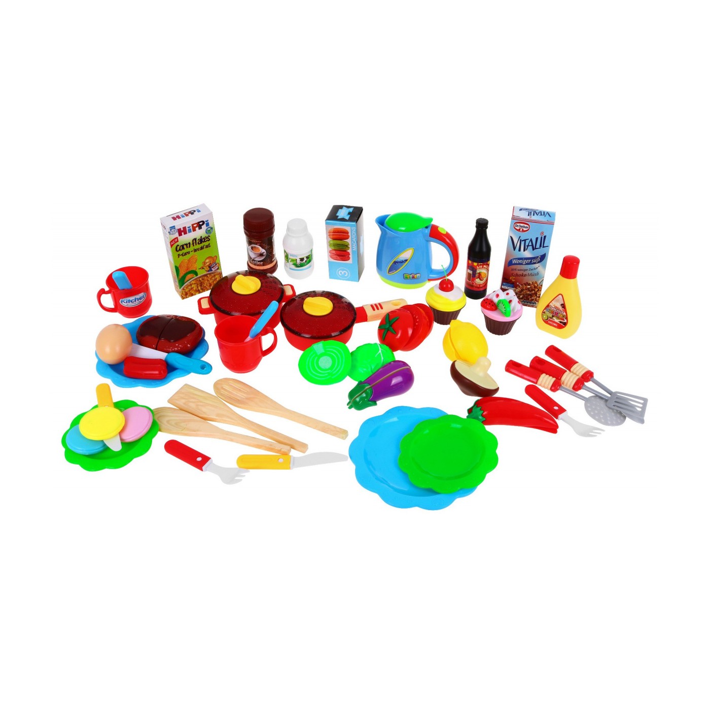 | - kuchnia, - naklejki, - dotykowy panel, - kran na pompkę, - suszarka na talerze, - boczne półeczki, - zegar (ok. 6 cm x 6 cm), - 5 x haczyki do zawieszania sztućców, - czajnik z otwieranym wieczkiem (ok. 9 cm x 11 cm) - 6 x warzywa na rzepy (grzyb, papryka, bakłażan, cytryna, kapusta, pomidor), - owoce (kiwi, wisienka, truskawka), - garnek z pokrywą (ok. 6 cm x 13 cm) i patelnia z pokrywką (ok. 5 cm x 17 cm), - 4 talerze (2 duże – średnica ok. 14 cm i 2 małe – średnica ok. 10 cm), - 2 filiżanki (ok. 5 cm x 7 cm), - 4 x szpatułka (ok. 16 cm x 3 cm), - chochla, cedzak, łyżka (ok. 14 cm x 2,5 cm), - sztućce (2 małe łyżeczki, 2 małe noże, duży nóż, 2 widelce – ok. 10 cm x 1,5 cm), - imitacja jedzenia (parówki, jajko), - 3 kartoniki z produktami, - 2 muffinki z dodatkami - 4 ciasteczka, - imitacja opakowania z kawą, majonezem, mlekiem, - buteleczka czarna. | |