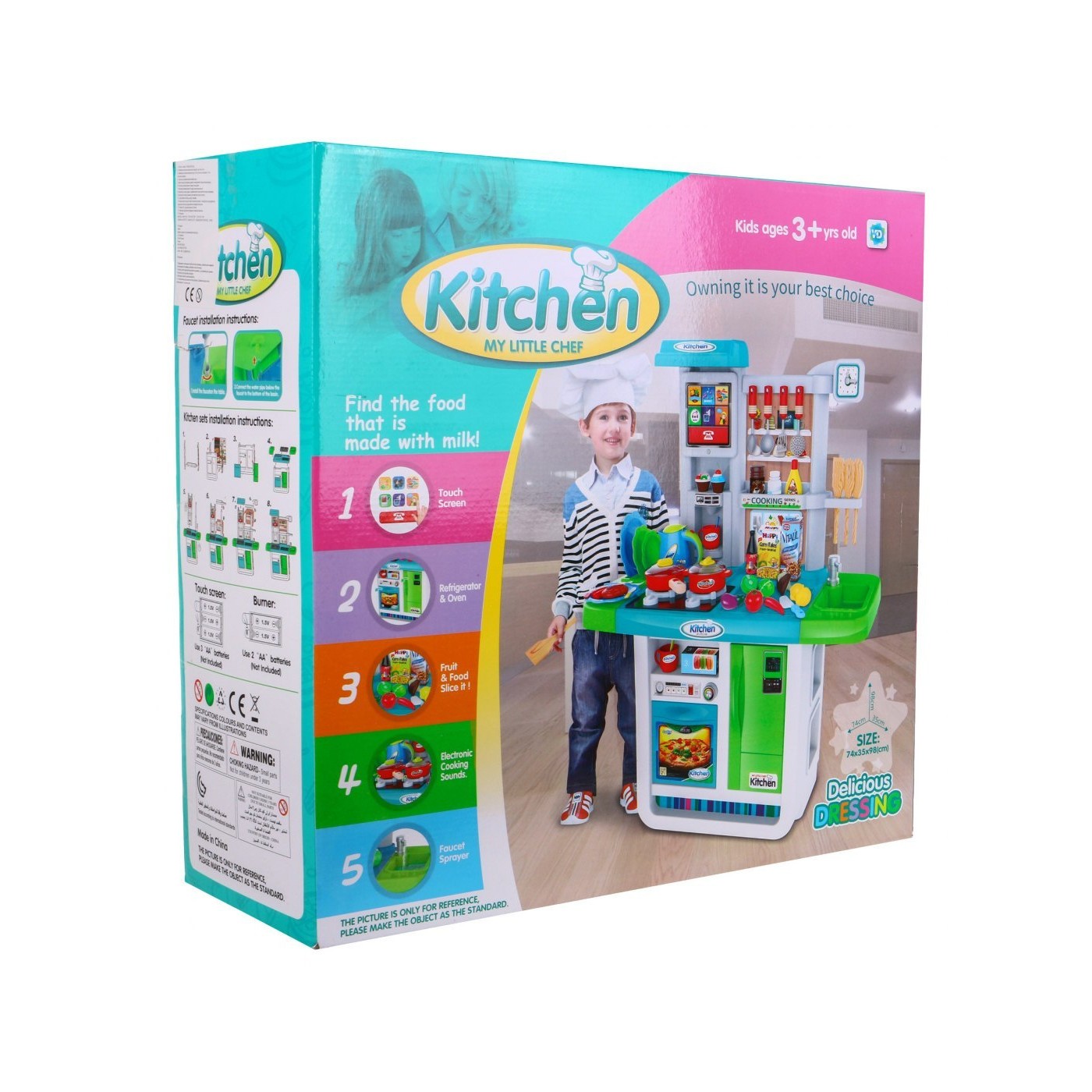 | | Przedstawiamy Państwu niesamowitą, dużą kuchnię interaktywną z efektami świetnymi i dźwiękowymi. Dbałość o szczegóły, żywa kolorystyka, estetyczne wykonanie. Łatwy montaż i demontaż. Kuchnia posiada otwierany piekarnik i lodówkę, 2 palniki z dźwiękami i światłami oraz zlew z kranem z którego leci prawdziwa woda. Dodatkową atrakcją jest panel dotykowy wbudowany w kuchnię. Panel dotykowy samoistnie się wyłącza po 1 minucie bezczynności, oszczędzając w ten sposób zużycie baterii. Zalety prezentowanej kuchni: - 2 palniki z dźwiękami i światłami, - otwierany piekarnik i lodówka, - zlew z którego leci woda, - suszarka na talerze, - wbudowana w blat deska do krojenia, - zegar, - panel dotykowy. Pokrętła są ruchome, po przekręceniu w lewo pierwszego palnika, świeci i miga się czerwone światełko oraz słychać odgłos smażenia. Po przekręceniu drugiego palnika w lewo, również miga się światełko i słychać odgłos gotowania. Funkcje panelu dotykowego: - włącznik panelu, - przycisk ANIMAL SOUND po naciśnięciu którego wydobywają się odgłosy 3 zwierzątek oraz melodia, - przycisk MUSIC po naciśnięciu na niego słychać różne melodie, - przycisk z cyferkami po naciśnięciu słychać numery od 1 do 10 w języku angielskim, - przycisk MUSIC po przyciśnięciu którego słyszymy piosenki, - przycisk z głośnikiem po naciśnięciu regulujemy głośność, - przycisk z chłopcem po naciśnięciu słychać głos dziecka, - przycisk z telefonem po naciśnięciu słychać różne dzwonki telefonu, sygnał wybierania numeru. Zabawka przeznaczona dla dzieci powyżej 3-go roku życia i posiada certyfikat CE. Instrukcja złożenia na opakowaniu. Zabawka zasilana bateriami typu 3 x AA (panel dotykowy) - brak w zestawie oraz 2 x AA (palniki) - brak w zestawie. Całość zapakowana w kolorowe pudełko, idealnie nadaje się na prezent. |