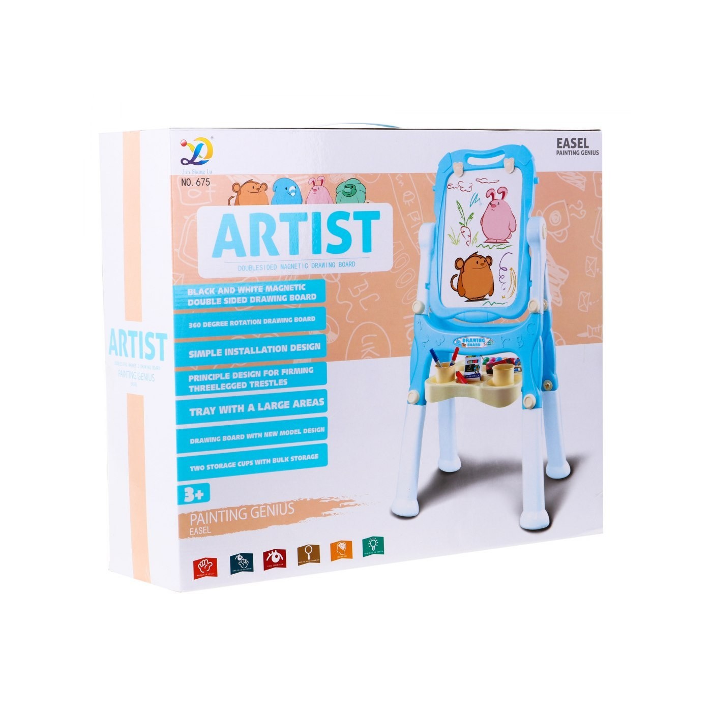| Tablica z jednej strony jest biała magnetyczna, a z drugiej kredowa. Na stronie białej można pisać pisakami załączonymi do zestawu a potem ścierać malowidła gąbeczką. Strona biała służy również do przyczepiania kolorowych magnesów załączonych do zestawu. Po stronie białej znajdują się również specjalne klipsy do przyczepiania kartek papieru, na których można malować. Na stronie czarnej, kredowej można malować kredą. Do zestawu załączono specjalny uchwyt do trzymania kredy, zapobiega on łamaniu się kredy i sprawia, że rączki naszych maluchów pozostają czyste. Po stronie czarnej można również przyczepiać magnesy. Tablicę można obracać o 360 stopni, jest starannie wykonana. Wszystkie kanty są zaokrąglone co zapewnia bezpieczeństwo użytkowania. Zestaw łatwy w montażu i demontażu. Instrukcja złożenia na opakowaniu. Zestaw posiada uchwyt do łatwego przenoszenia z miejsca na miejsce. Całość zapakowana w kolorowe pudełko, typu „ walizka” Delikatne pastelowe kolory. Zabawka przeznaczona dla dzieci 3+. Dzięki tablicy, dziecko bawiąc się pobudzi jednocześnie wyobraźnię, koncentrację, zdolności manualne. | |
