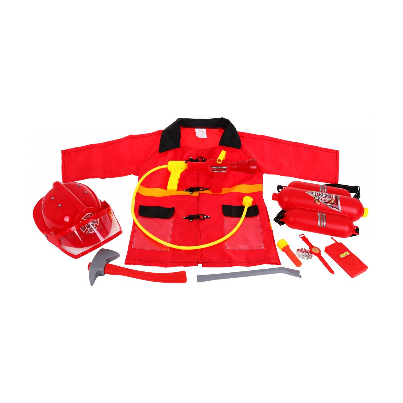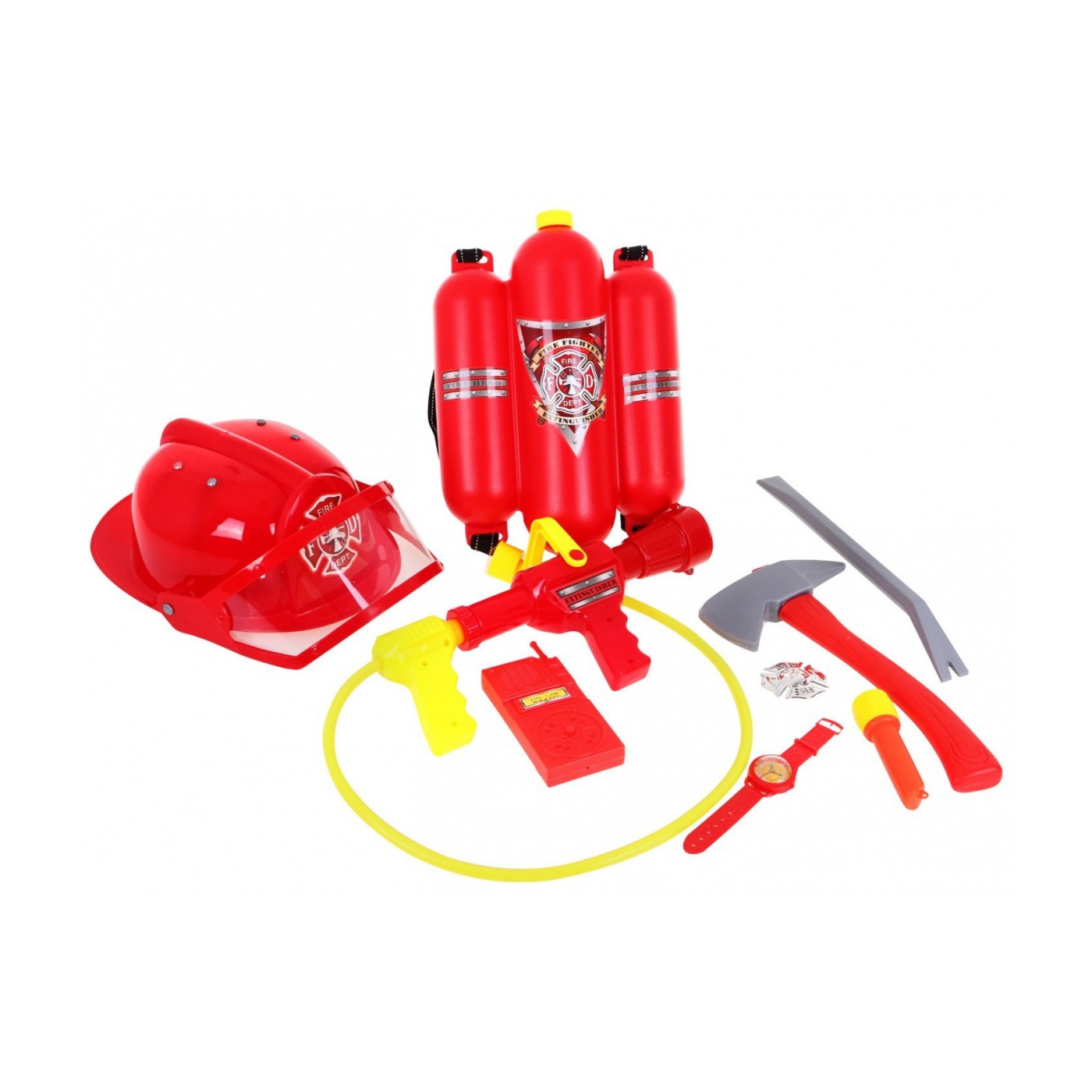 | - kask (ok. 30 cm x 20cm), - gaśnica na wodę z pompką i możliwością regulacji ciśnienia wody (ok. 30cm x 10 cm), - duży zbiornik na wodę (ok. 30cm x 22 cm), - kamizelkę (długość ok. 60 cm, szerokość od pachy do pachy ok. 43 cm, długość rękawa od pachy ok. 25 cm) - latarkę (ok. 10 cm x 4 cm), - krótkofalówkę (ok. 12 cm x 6 cm), - odznakę o średnicy ok. 5,5 cm, - zegarek (ok. 17 cm x 3 cm), - toporek (ok. 28 cm x 14 cm), - łom (ok. 30 cm x 2,5 cm) |