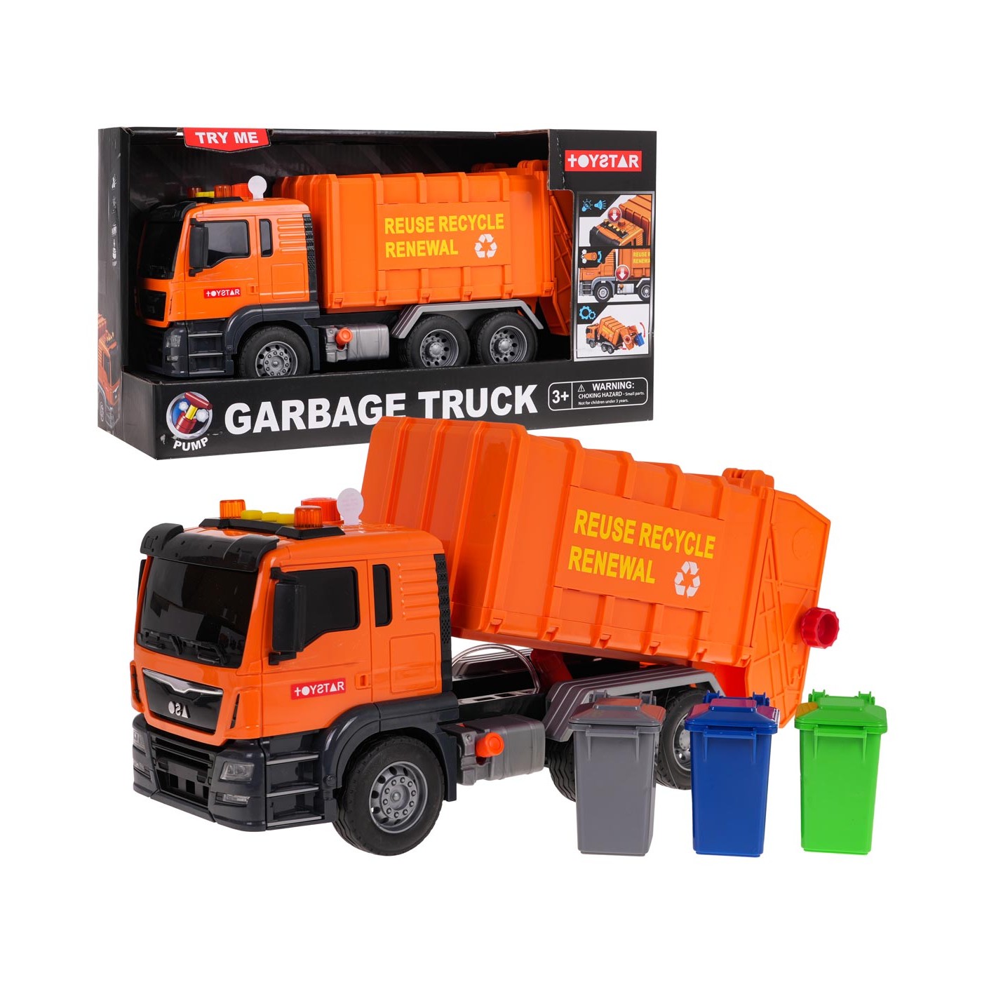 Oranžové smetiarske auto so zvukovou funkciou pre deti od 3 rokov. Je vyrobený z najkvalitnejšieho plastu a má pohyblivé prvky. Zadná časť smetiarskeho auta sa zdvíha (tlačidlo v hornej časti kabíny) a spúšťa (tlačidlo na línii kolesa), dá sa zdvihnúť a spustiť klapka smetiarskeho auta a vďaka pohyblivý zdvih (kľuka v zadnej časti vozidla). Na streche smetiarskeho auta je panel s tlačidlami, ktoré aktivujú zvuky motora, klaksónu a zvuk nakladania odpadu. Zvuky sprevádzajú blikajúce svetlá na streche kabíny. Smetiarske auto má gumené pneumatiky a pohon predných kolies. Hračka je napájaná 3 x AG13 batériami (sú súčasťou balenia).