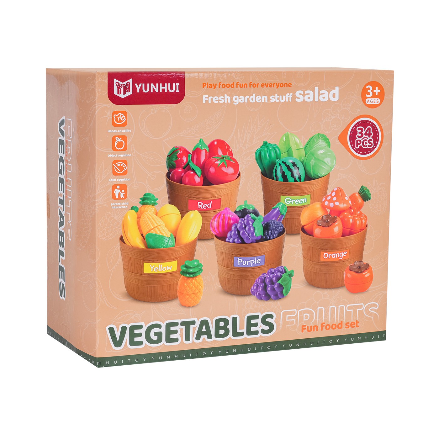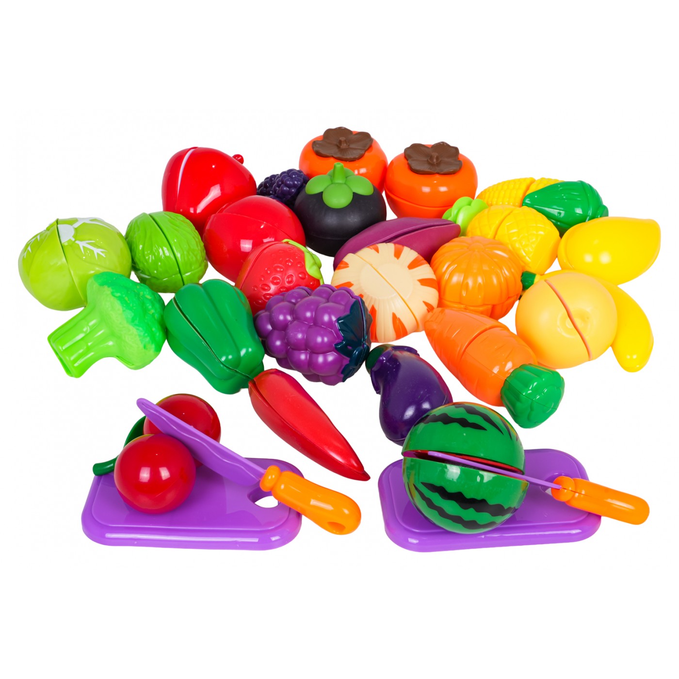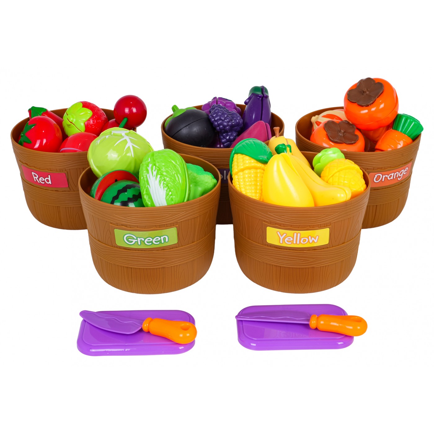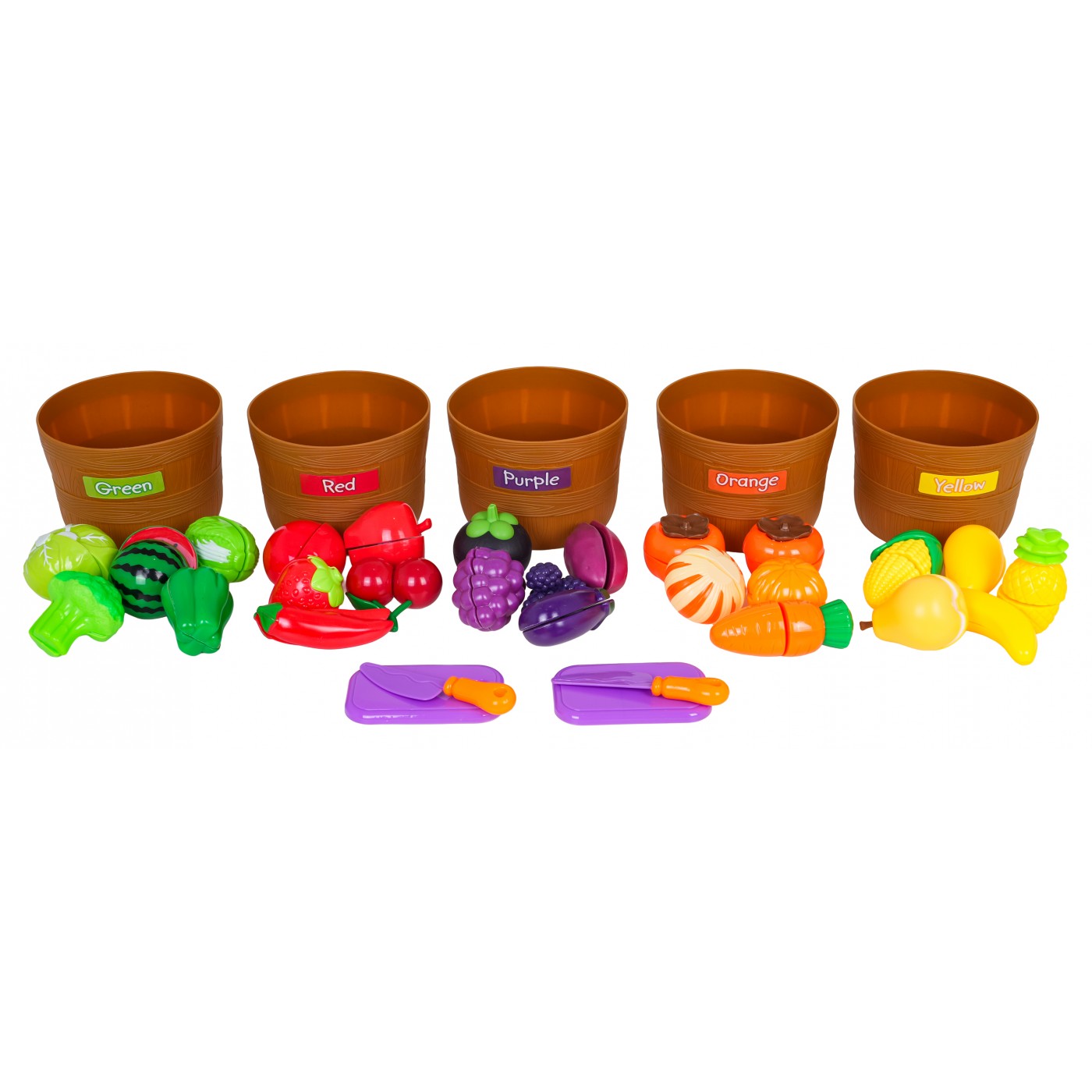 - imitácie červeného ovocia a zeleniny, napr. paradajka, jahoda, čerešňa, paprika, jablko, - imitácie zeleného ovocia a zeleniny, napr. melón, šalát, zelená paprika, 2 x šalát, - imitácie žltého ovocia, napr. banán, citrón, kukurica, ananás, - imitácie fialového ovocia a zeleniny, napr. baklažán, 2 x čučoriedky, - imitácie pomarančového ovocia a zeleniny, napr. tekvica, mrkva, - 2 x doska na krájanie, - 2x nôž, - 5 x košík na triedenie zeleniny a ovocia. |
