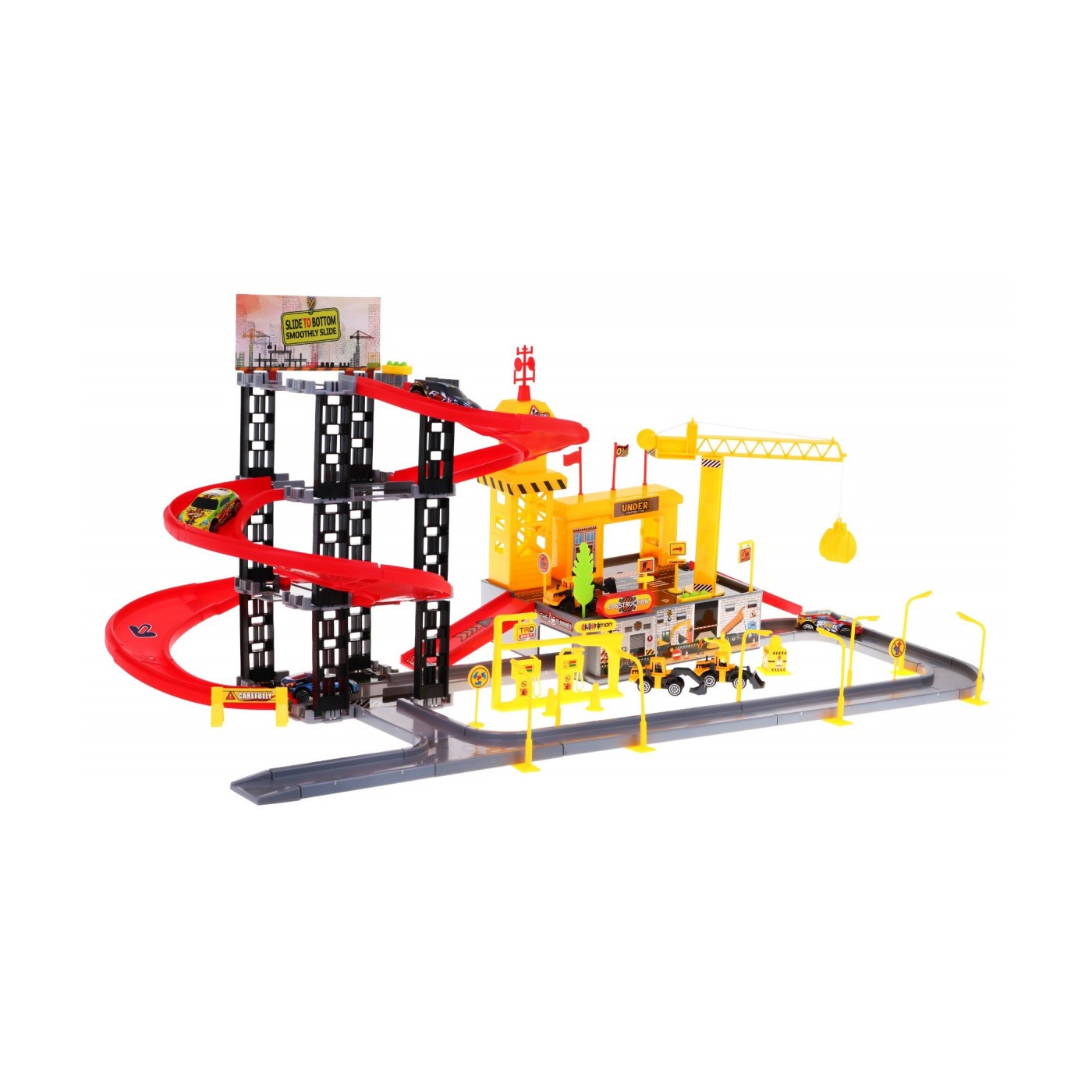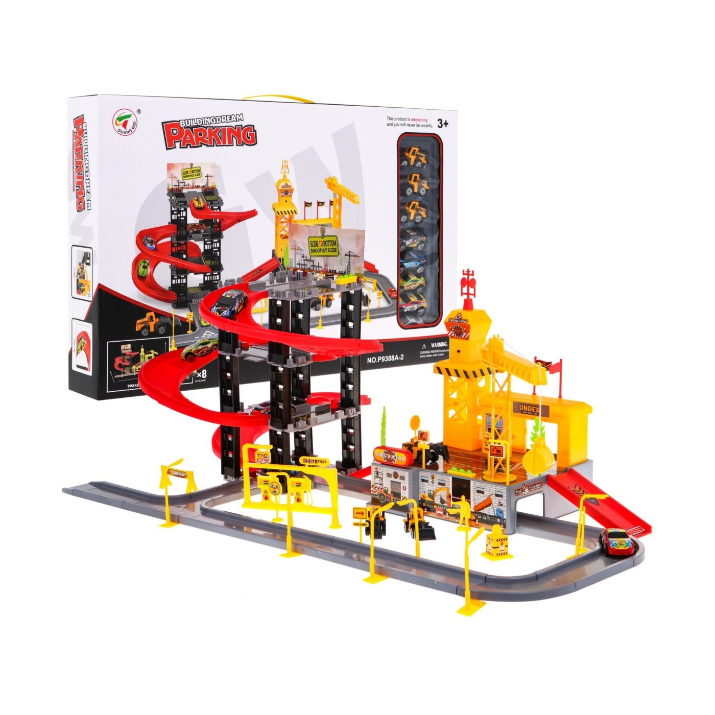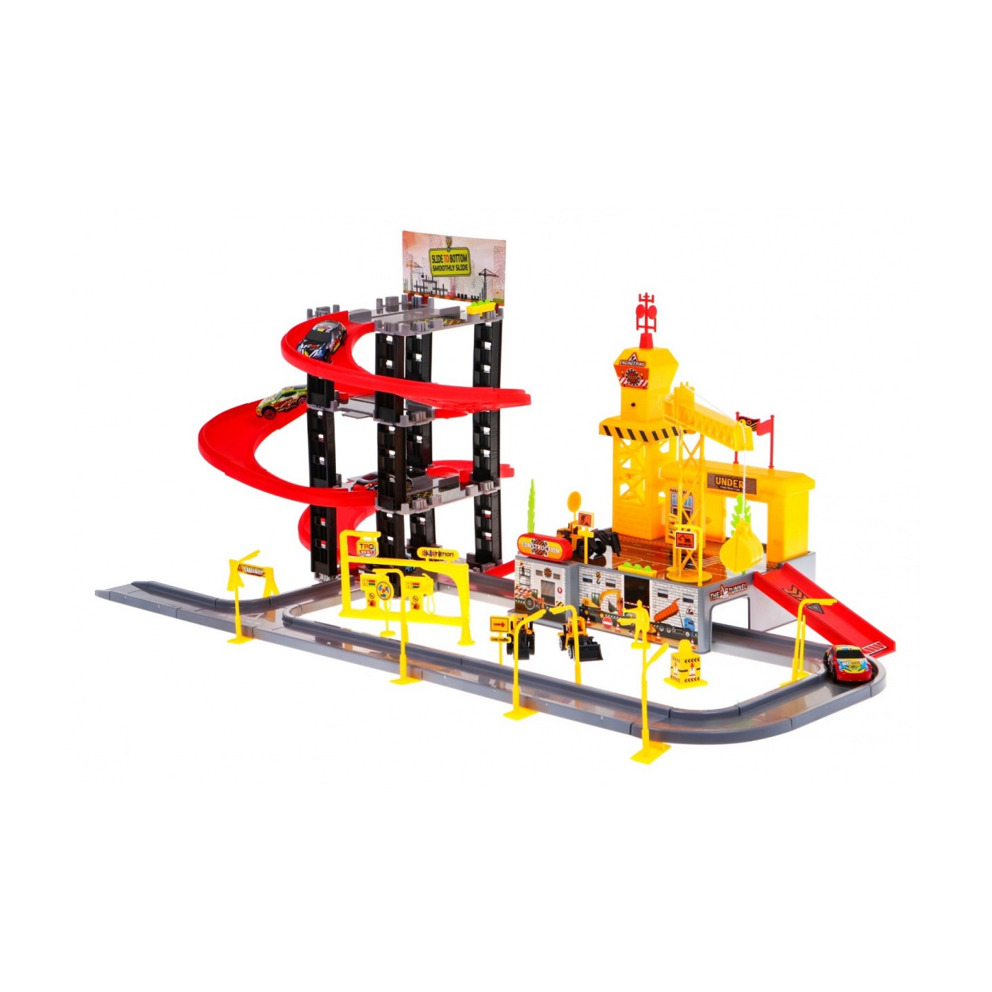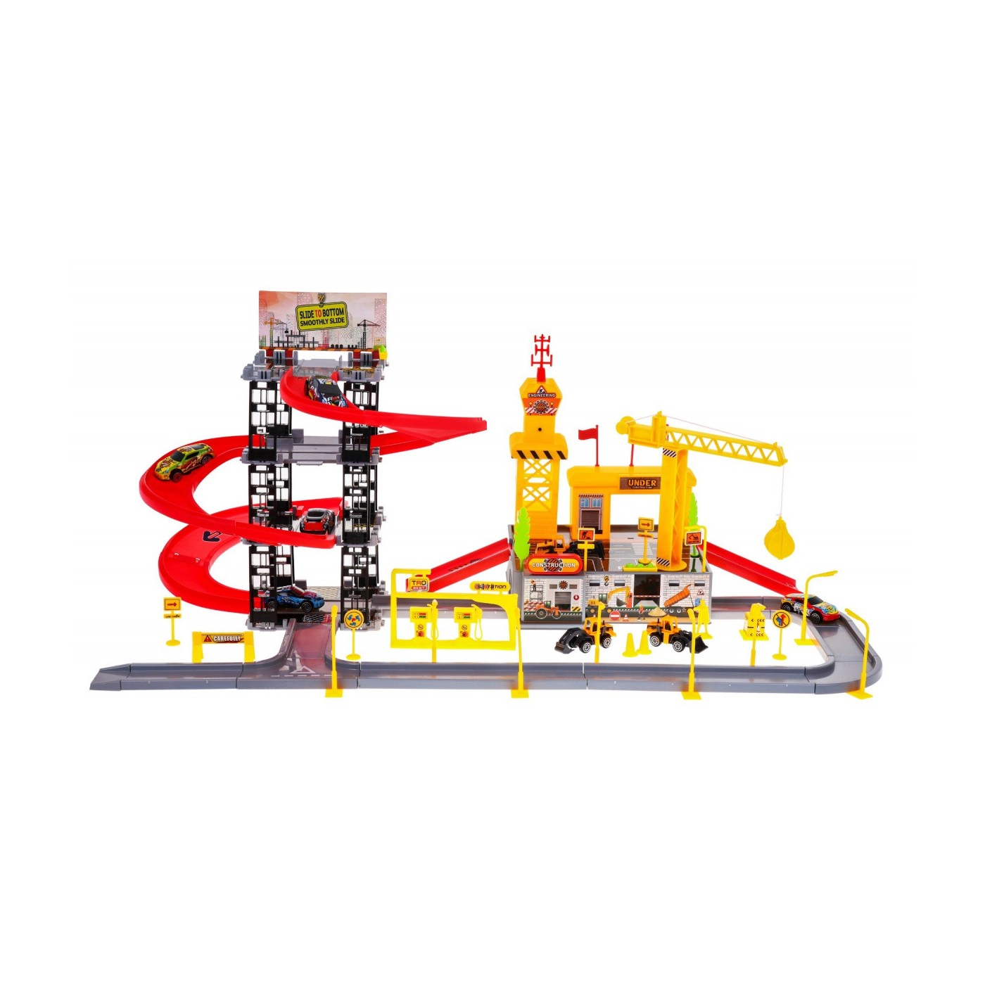 | - parking 4 poziomowy ze zjeżdżalniami i torem dla autek, - centrum dowodzenia budową, - 3 pojazdy budowlane, - 5 autek, - figurka osoby kierującej ruchem, - znaki drogowe, - latarnie, - szlabany, - stacja paliw, - naklejki, - instrukcja montażu. | |