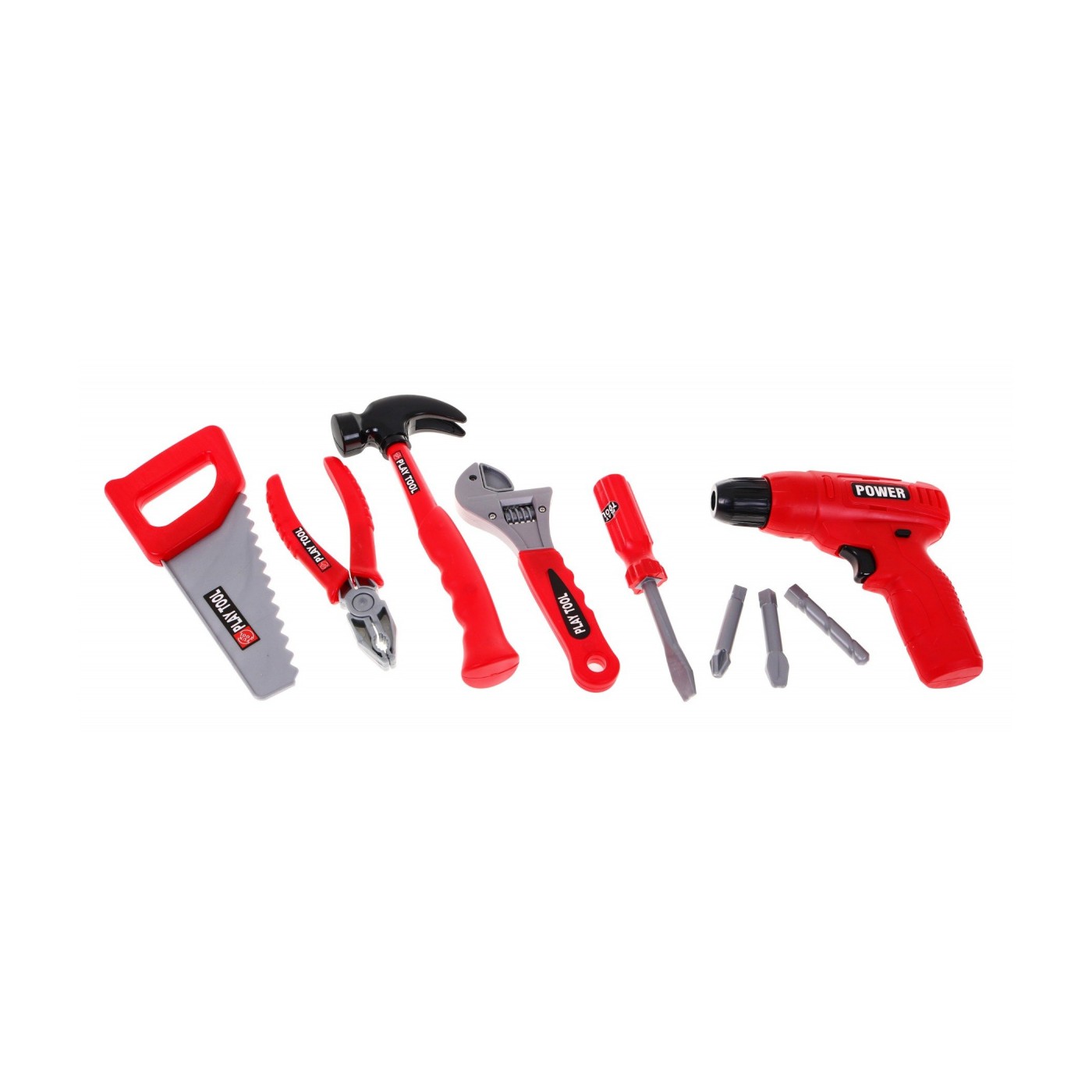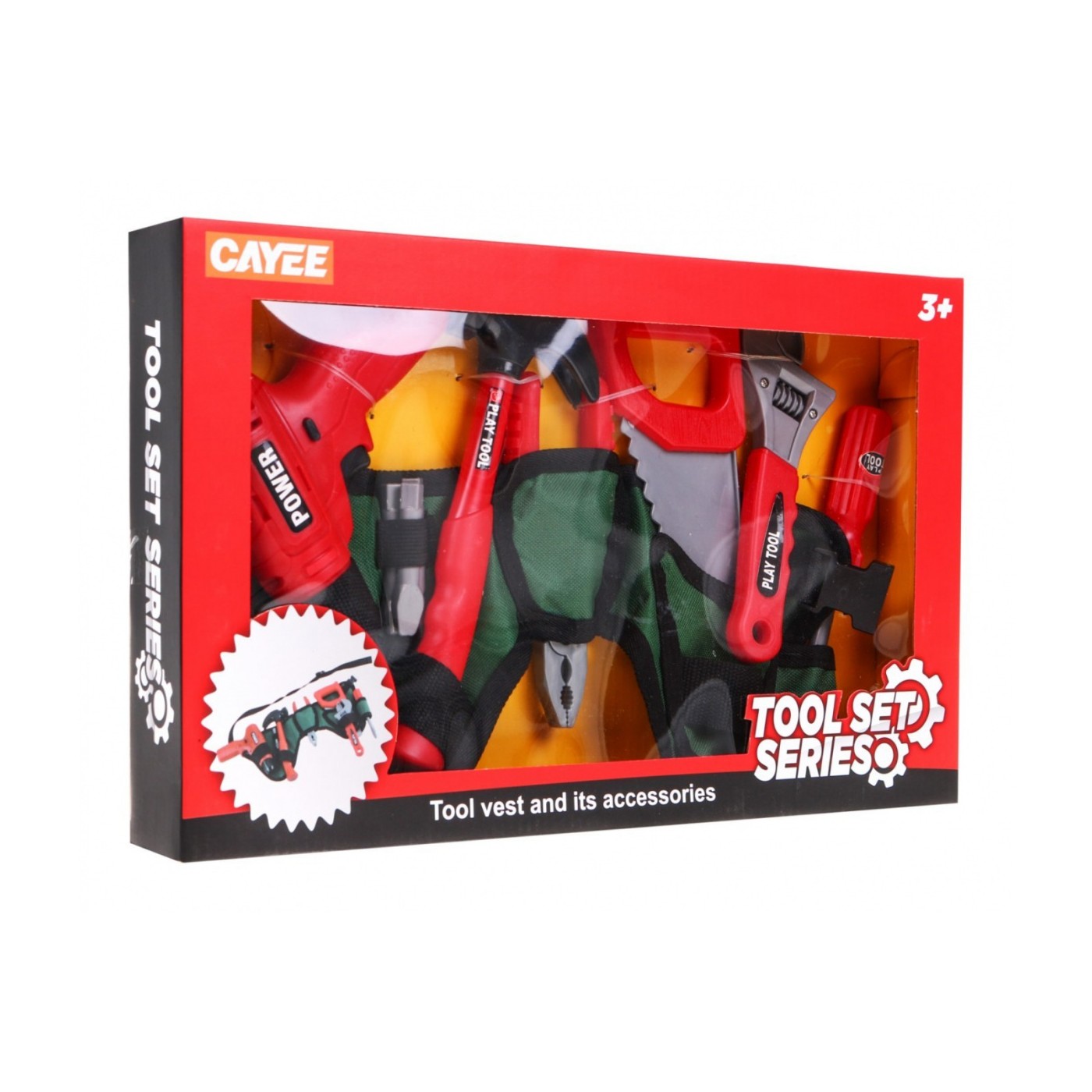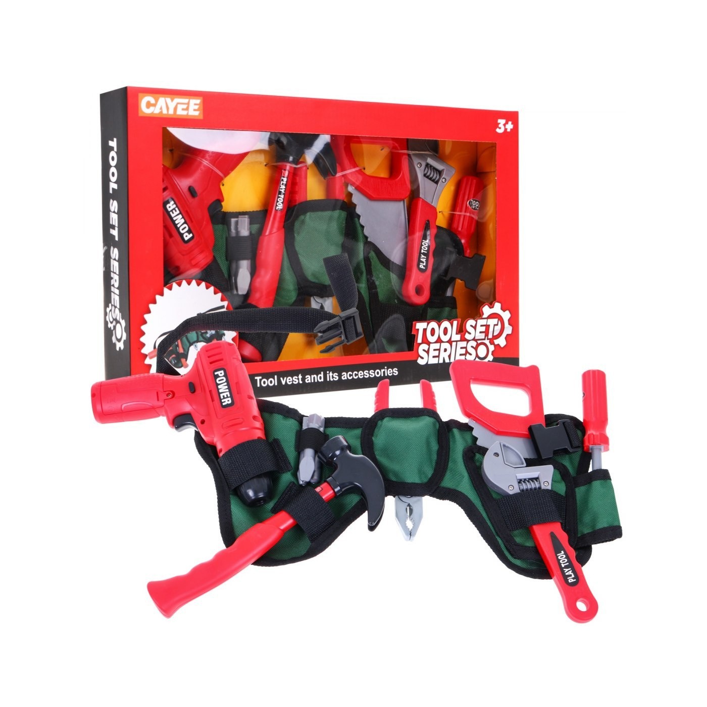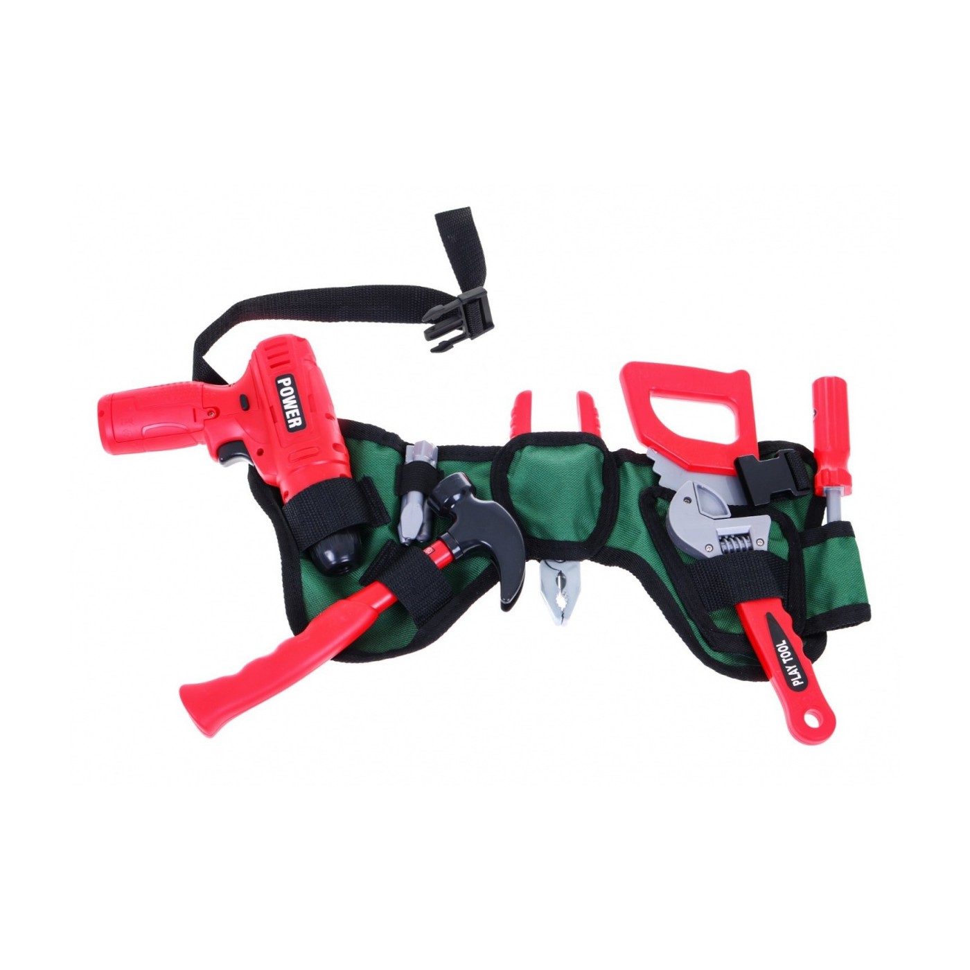 | | -regulowanypas na narzędzia (od 40 cm do 70 cm szerokość , ok. 16 cm wysokość), - wkrętarka (ok.15 cm x 16 cm), - 3 wymienne końcówki do wkrętarki (ok.6,5 cm długość), - śrubokręt (ok. 16 cm x 2,5 cm), - kombinerki (ok. 16 cm x 6 cm), - klucz francuski (ok. 17,5 cm x 6 cm), - piła (ok. 19 cm x 8,5 cm), - młotek (ok. 21 cm x 9 cm) |