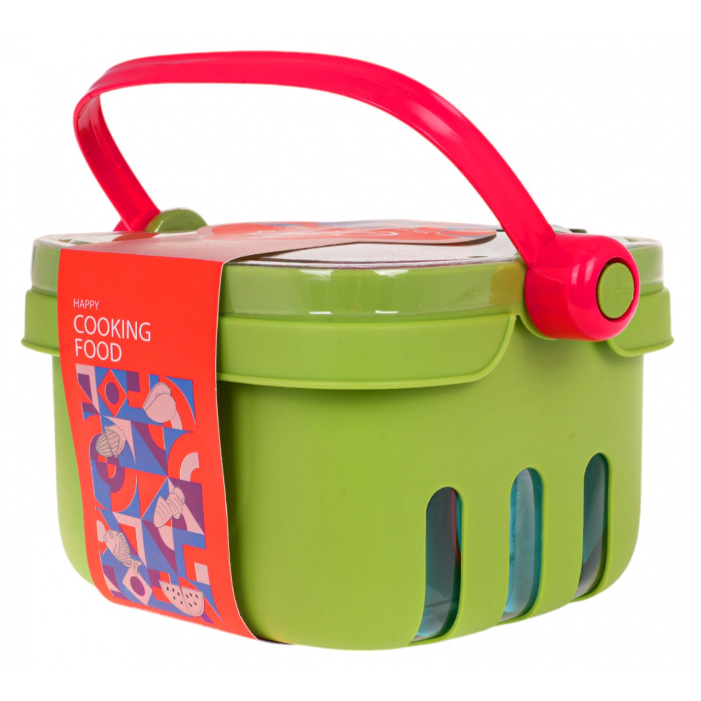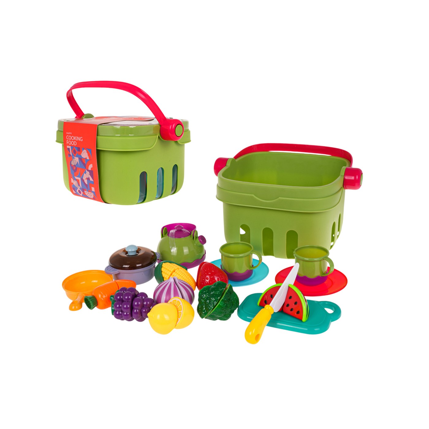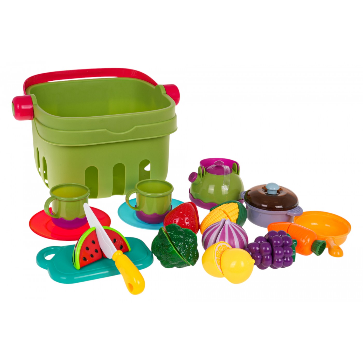 Košík s príslušenstvom pre deti od 3 rokov. Sada obsahuje piknikový kôš, hrniec s pokrievkou, dosku na krájanie zeleniny a ovocia, nôž, panvicu, taniere, poháre a atrapy zeleniny a ovocia so suchým zipsom. Ideálny spôsob, ako sa zabaviť vonku.
