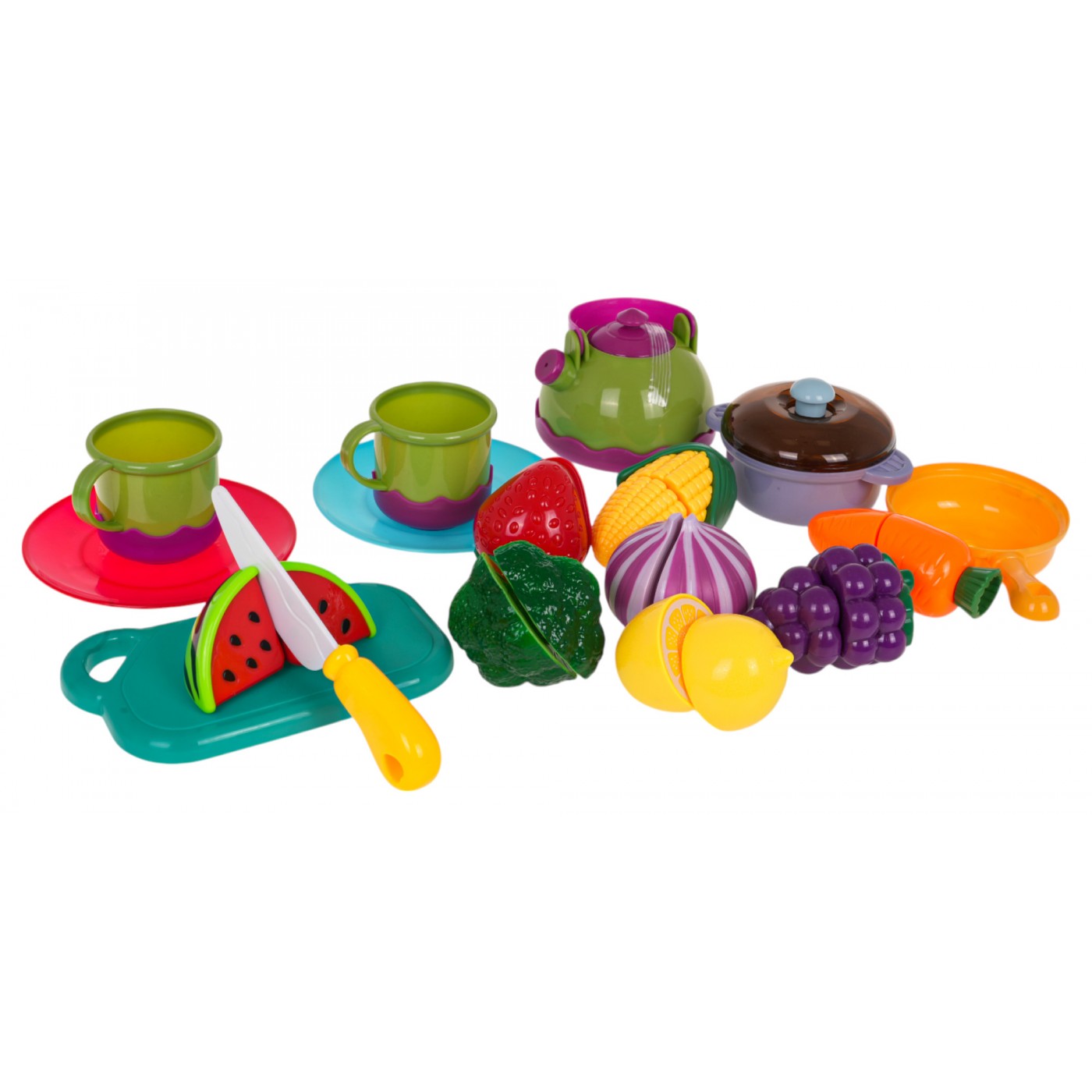- piknikový kôš, - doska na krájanie, - hrniec s pokrievkou, - nôž, - panvica, - 2x pohár, - rýchlovarná kanvica, - Figuríny na suchý zips: citrón, melón, jahoda, hrozno, - Zeleninové atrapy na suchý zips: brokolica, kukurica, mrkva a cesnak. - 2x taniere. |