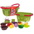 Košík s príslušenstvom pre deti od 3 rokov. Sada obsahuje piknikový kôš, hrniec s pokrievkou, dosku na krájanie zeleniny a ovocia, nôž, panvicu, taniere, poháre a atrapy zeleniny a ovocia so suchým zipsom. Ideálny spôsob, ako sa zabaviť vonku.
