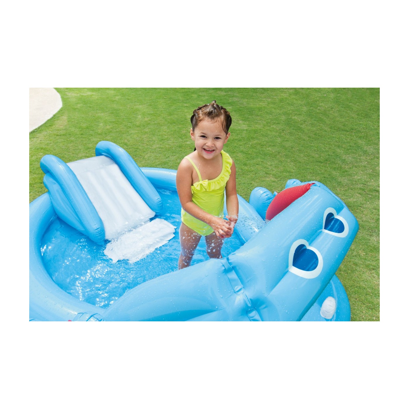 | - kolorowy brodzik z paszczą hipopotama, - nadmuchiwana zjeżdżalnia, - prysznic podłączany do węża ogrodowego, - miękka mata pod zjeżdżalnią, - zawór spustowy na dnie basenu, | |